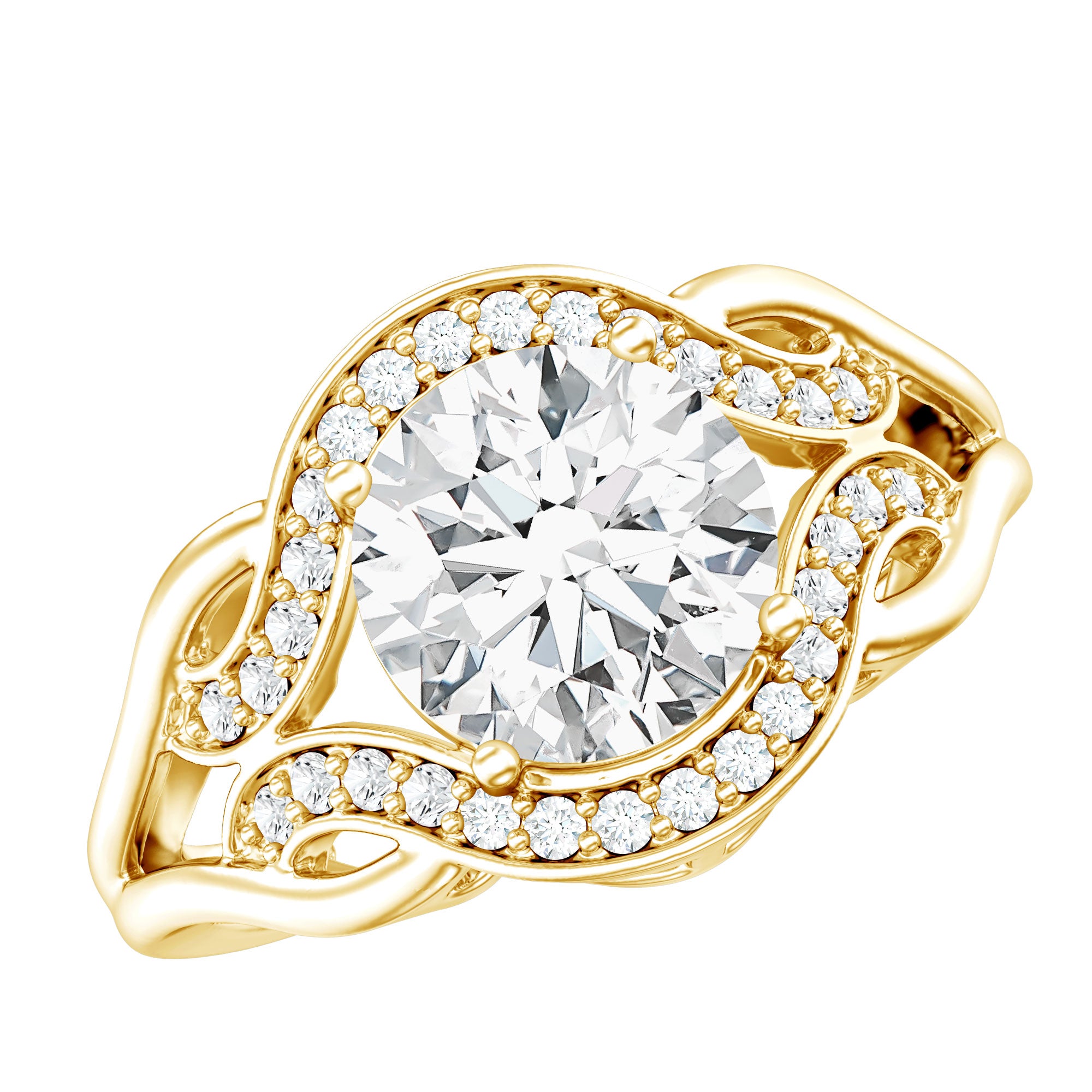 This elegantly timeless art deco inspired Diamond Engagement Ring showcases an 8 MM round cut EF-VS quality diamond, securely set in prong setting. Surrounding the center stone is a graceful wave of smaller diamond stones that connects to the unique band, adding the perfect amount of sparkle and creating a flowing design. Adore your future bride with this stunning Art Deco Engagement Ring, and watch as her eyes fill with joy and happiness. Crafted with precious metal, this Alternative Engagement Ring features ethically sourced, eco-friendly lab-grown gemstones.