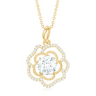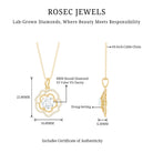 The irresistible beauty of a flower is perfectly expressed in our delicate Diamond Flower Necklace. It features an 8 MM round shaped lab grown diamond in the center set in prong setting, adding a classic touch to the design. Handcrafted by our master artisans unmistakable eye for detail, the center stone is encircled by floral petals decorated with smaller diamonds. The Diamond Pendant Necklace is suspended from a leaf-like curved bail, enhancing its elegance. To ensure its Quality, this Rose Necklace comes with a certificate of authenticity, providing peace of mind.