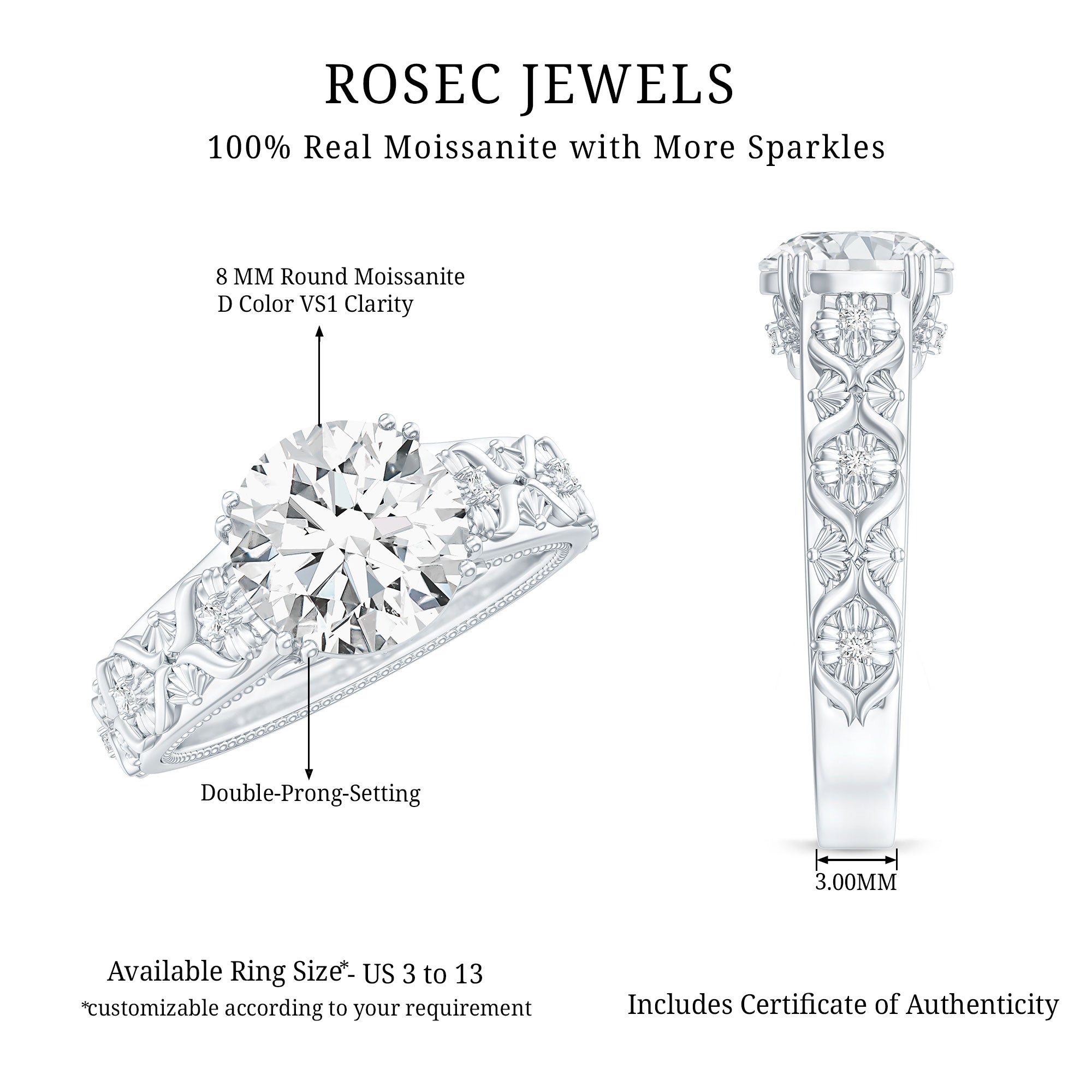 This Moissanite Engagement Ring is a truly special piece, designed to capture hearts with its nature-inspired beauty and brilliant sparkle. At the center is an 8 MM round cut moissanite, set in secure double prong setting as a classic solitaire. Surrounding it are delicate floral engravings along the band, accented with tiny moissanite stones that add an elegant shimmer and a touch of vintage charm. The Solitaire Engagement Ring features beautiful beaded detailing that enhances its graceful design, while a hidden flower motif beneath the center stone holds a sparkling peek-a-boo stone - adding a surprise touch of shine without taking the spotlight from the dazzling solitaire. Crafted for those who love nature and timeless romance, this Vintage Style Ring combines soft floral elements with radiant sparkle. The 2 carat D-VS1 quality moissanite catches the light beautifully, making it a symbol of love, commitment, and cherished memories. Perfect for brides looking for something unique yet classic, this Flower Engagement Ring blends romance, elegance, and a bit of old-world charm. It is a meaningful piece she will treasure forever, a true celebration of love in every detail.
