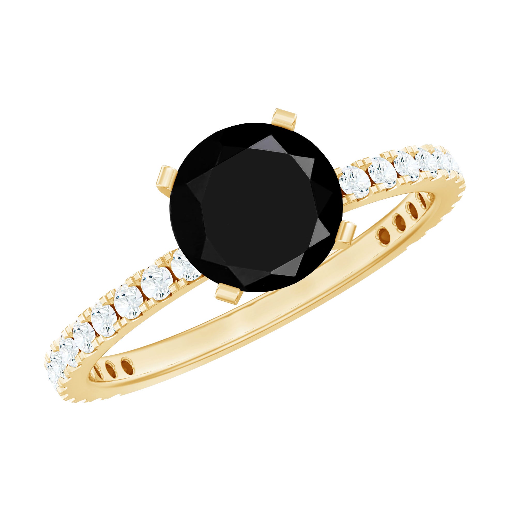 This amazing Solitaire Ring is embellished with 7 MM Round Shape Created Black Diamond with Diamond set as Side Stones. This Created Black and White Diamond Ring is crafted in 4 Prong Peg Head Setting and a perfect Engagement Ring for your partner.
