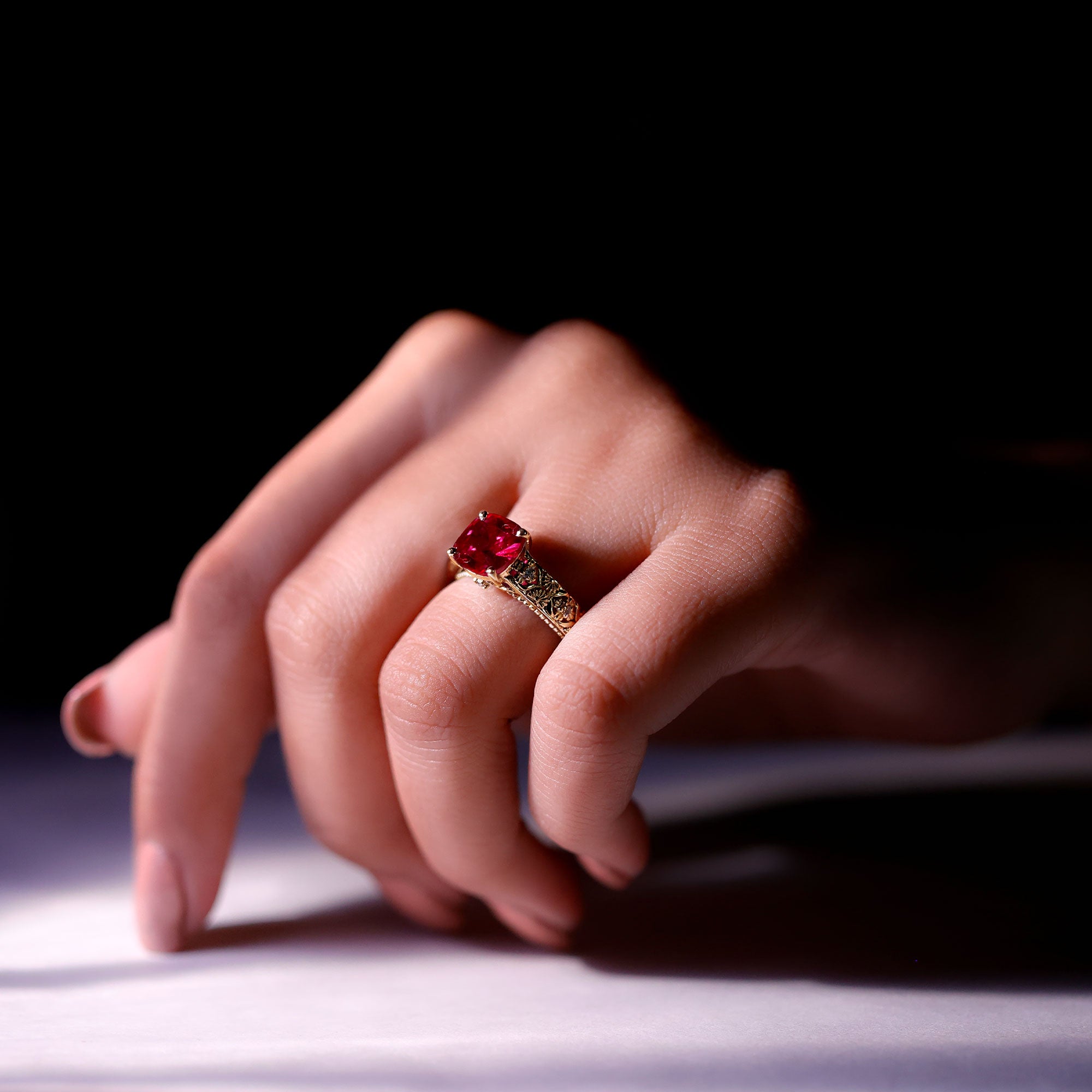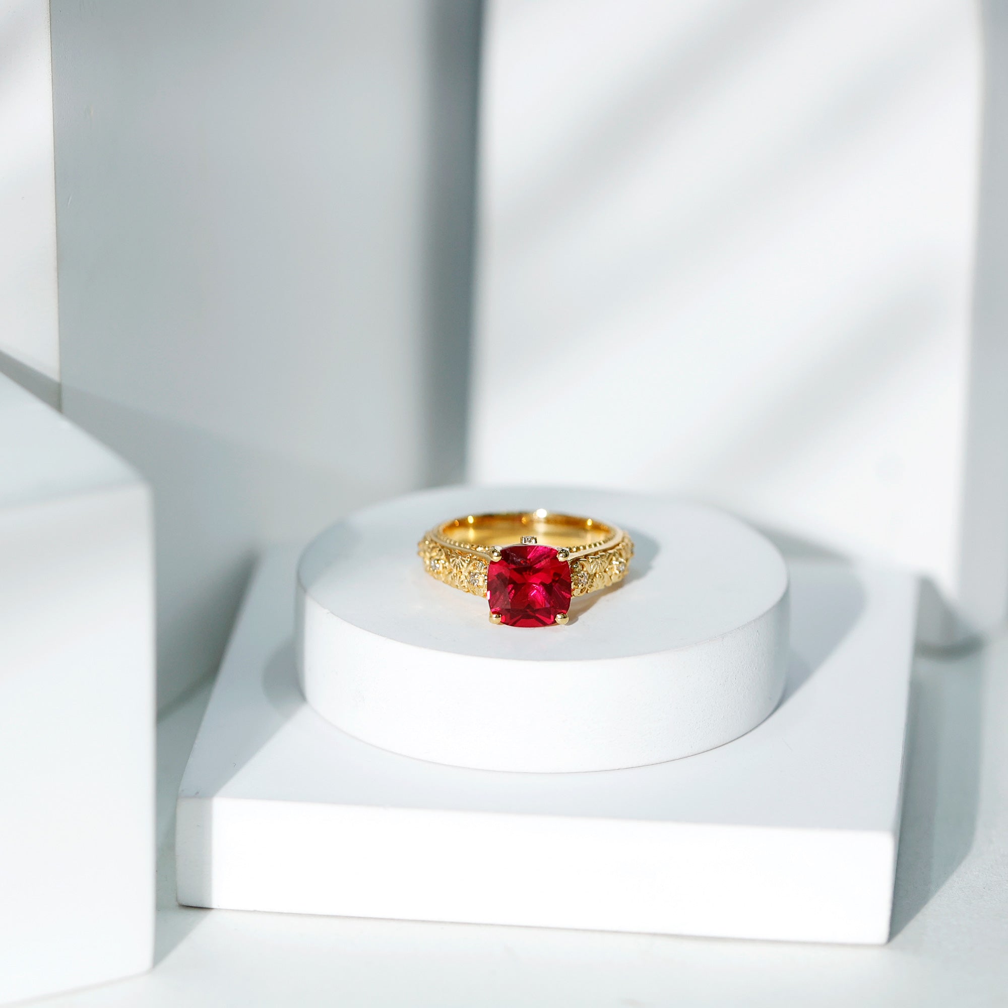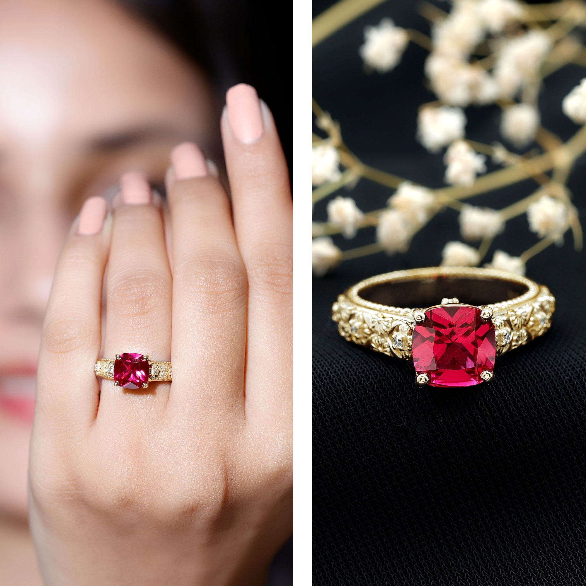 Gorgeous Lab Created Ruby Solitaire Ring makes the statement accessory for women. Filigree designs are engraved on the band with Cushion Cut Lab Created Ruby as the solitaire, and Round Brilliant Diamonds on the sides. Engraved Engagement Ring is composed in Solid Gold. present this classic ring to your mother or wife.