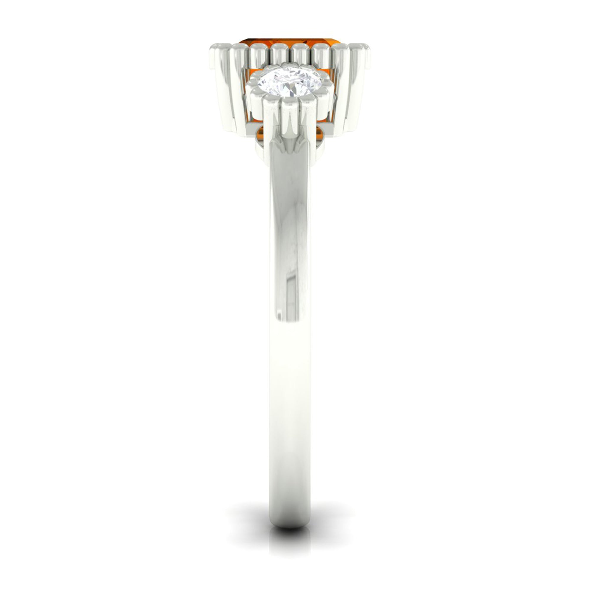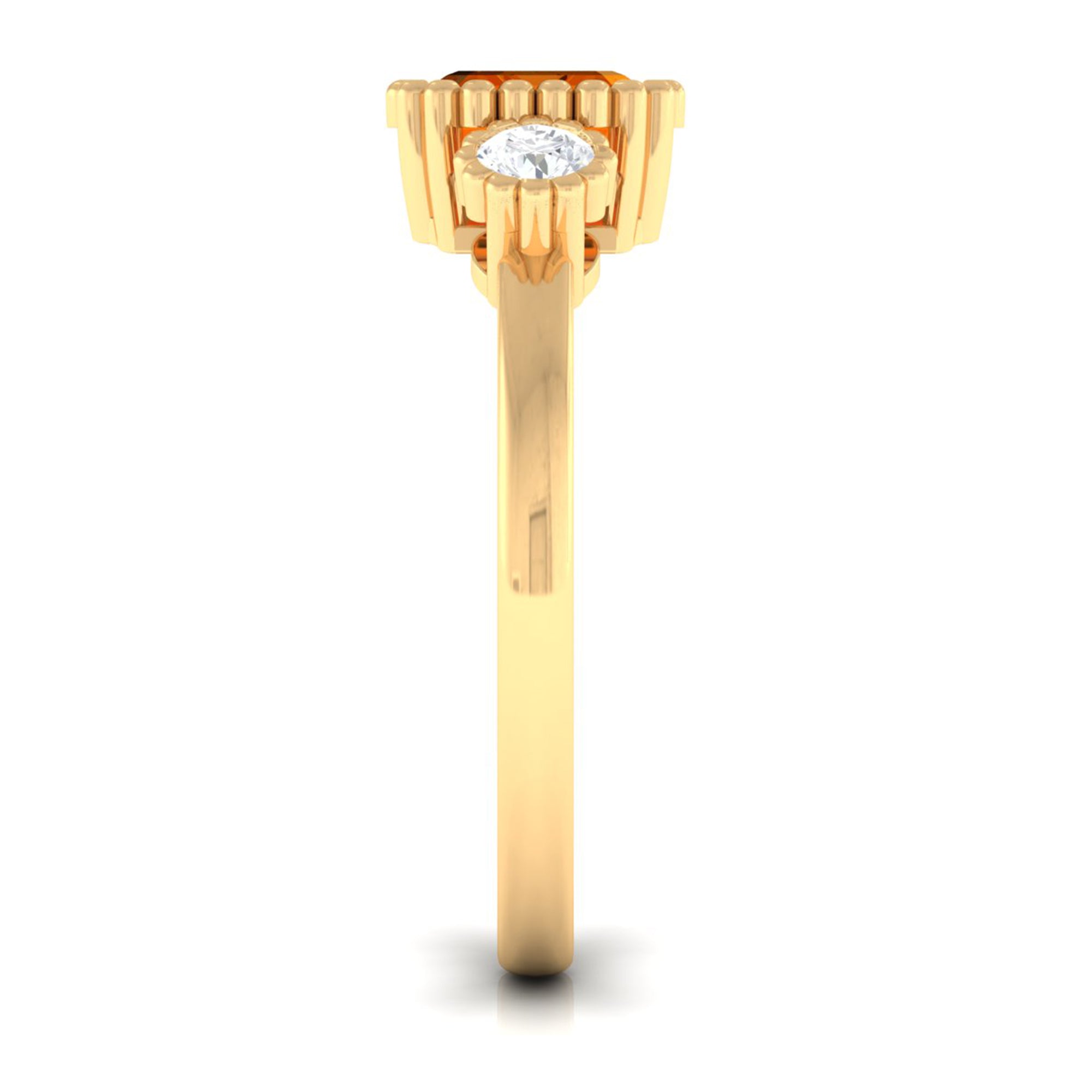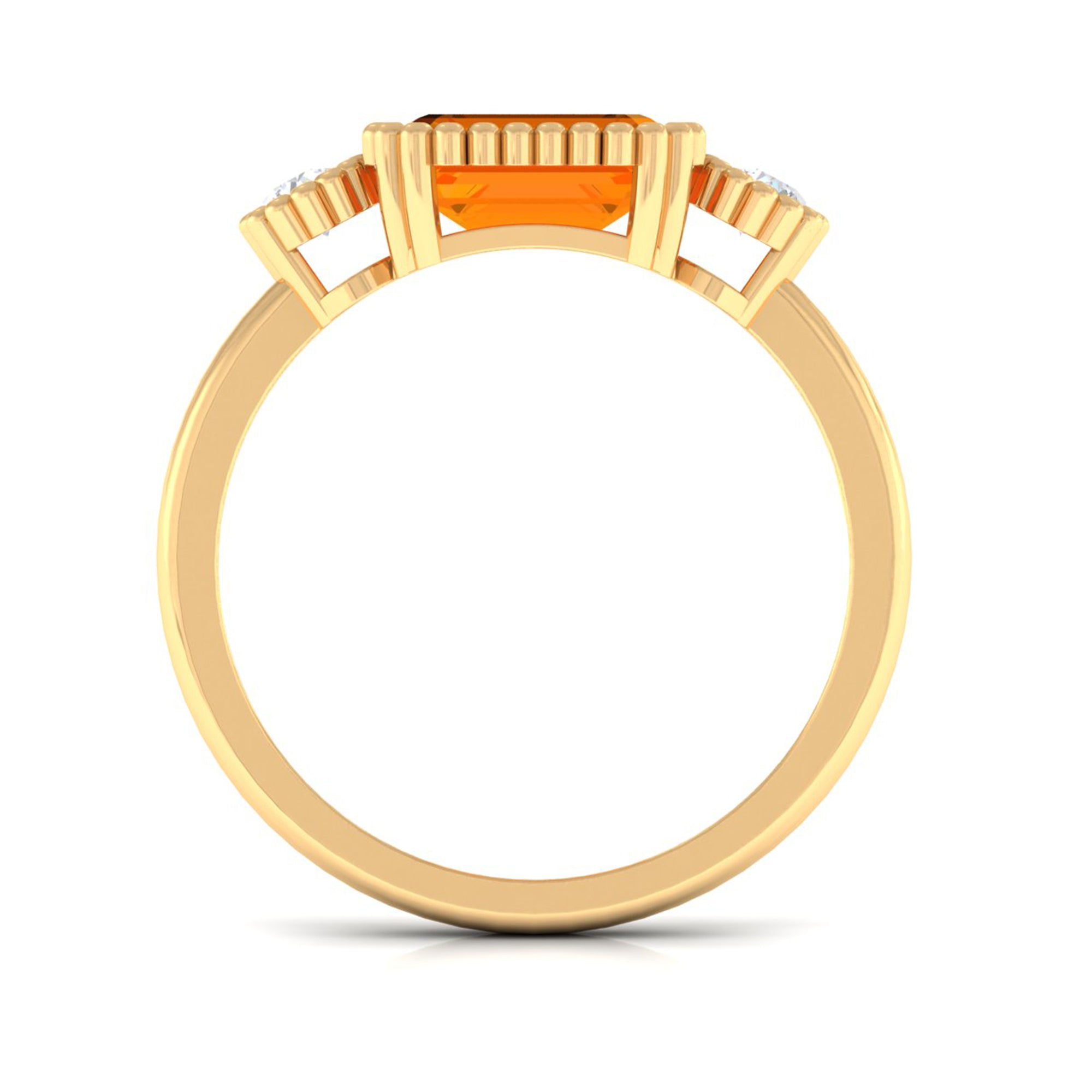 Beaded Gold around the East West set Fire Opal is accentuating the charm of this ring. The Round Diamond, each on both side along with Emerald Cut Fire Opal forms an alluring Three Stone Engagement Ring. Fire Opal Solitaire Ring will elate your pretty lady.