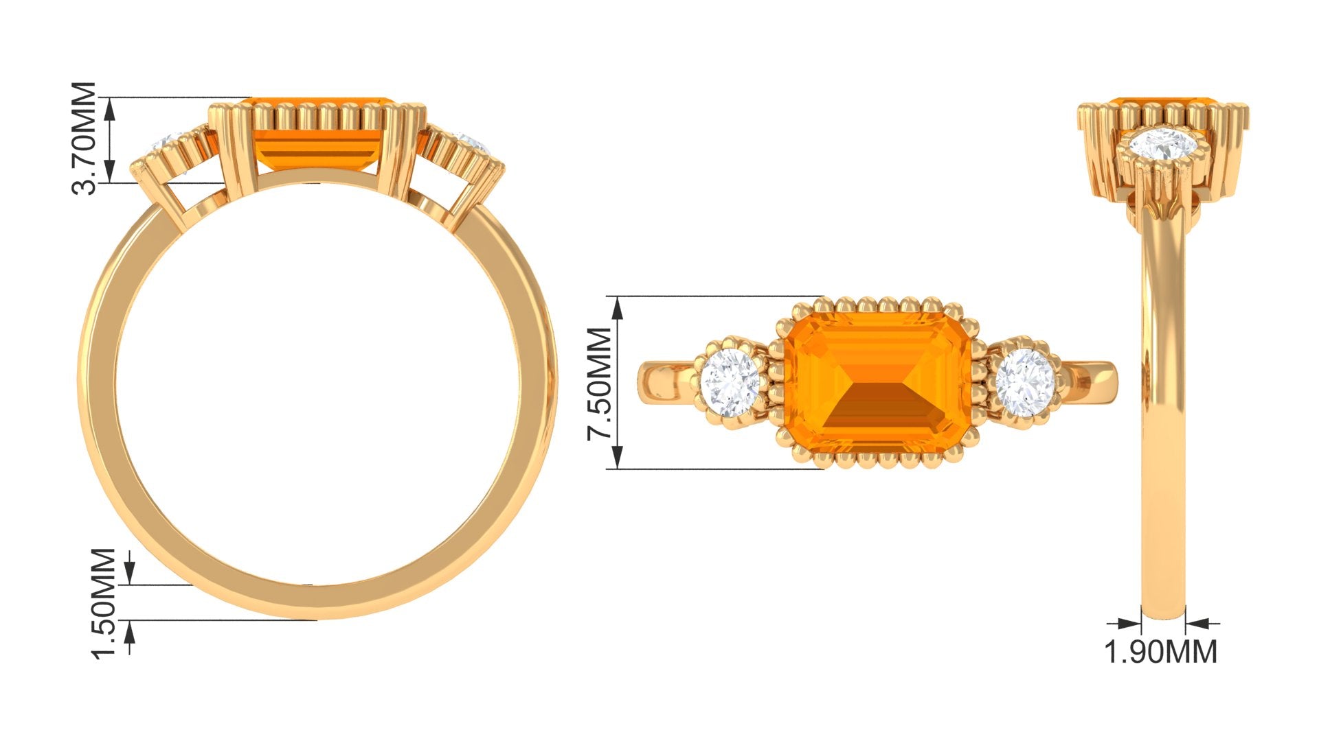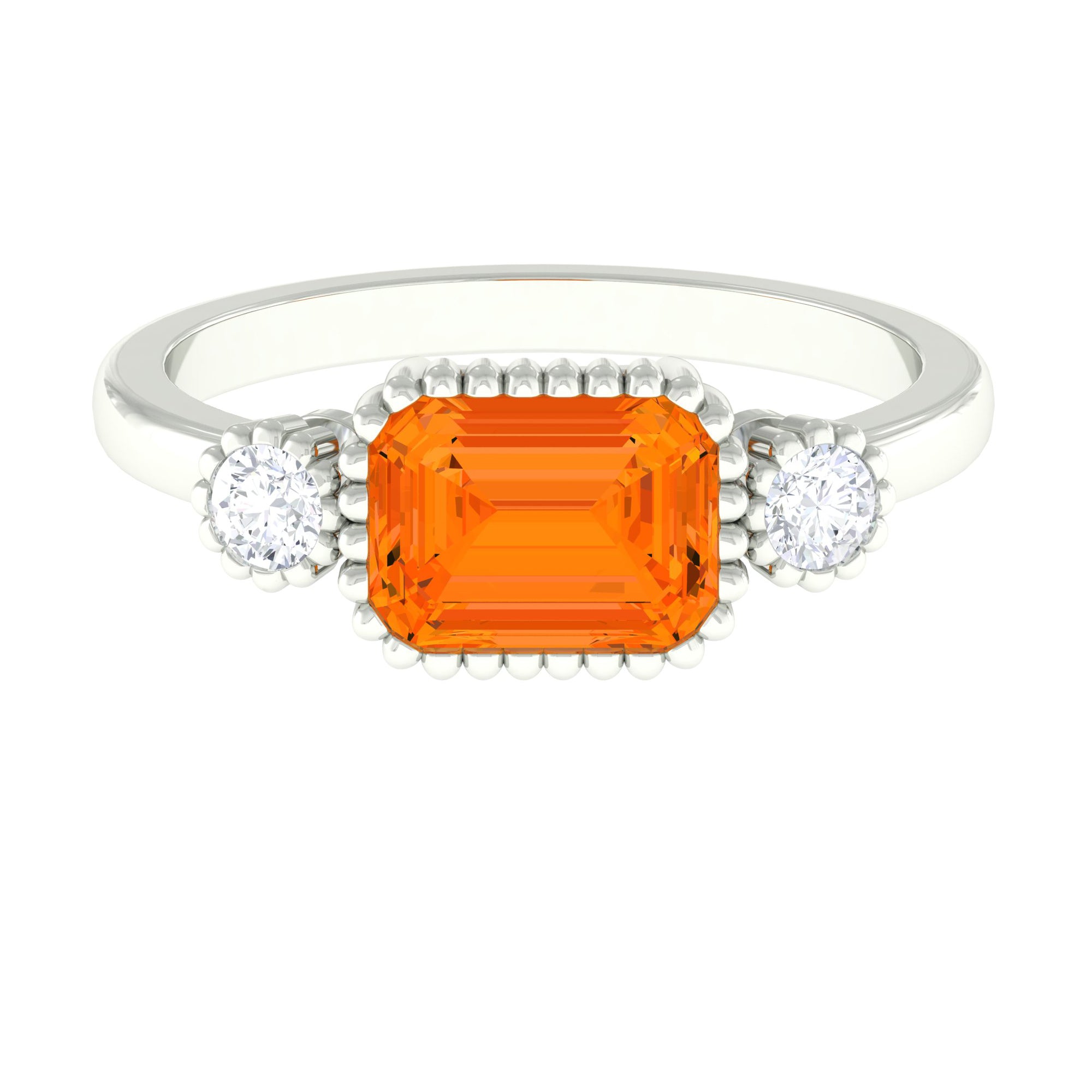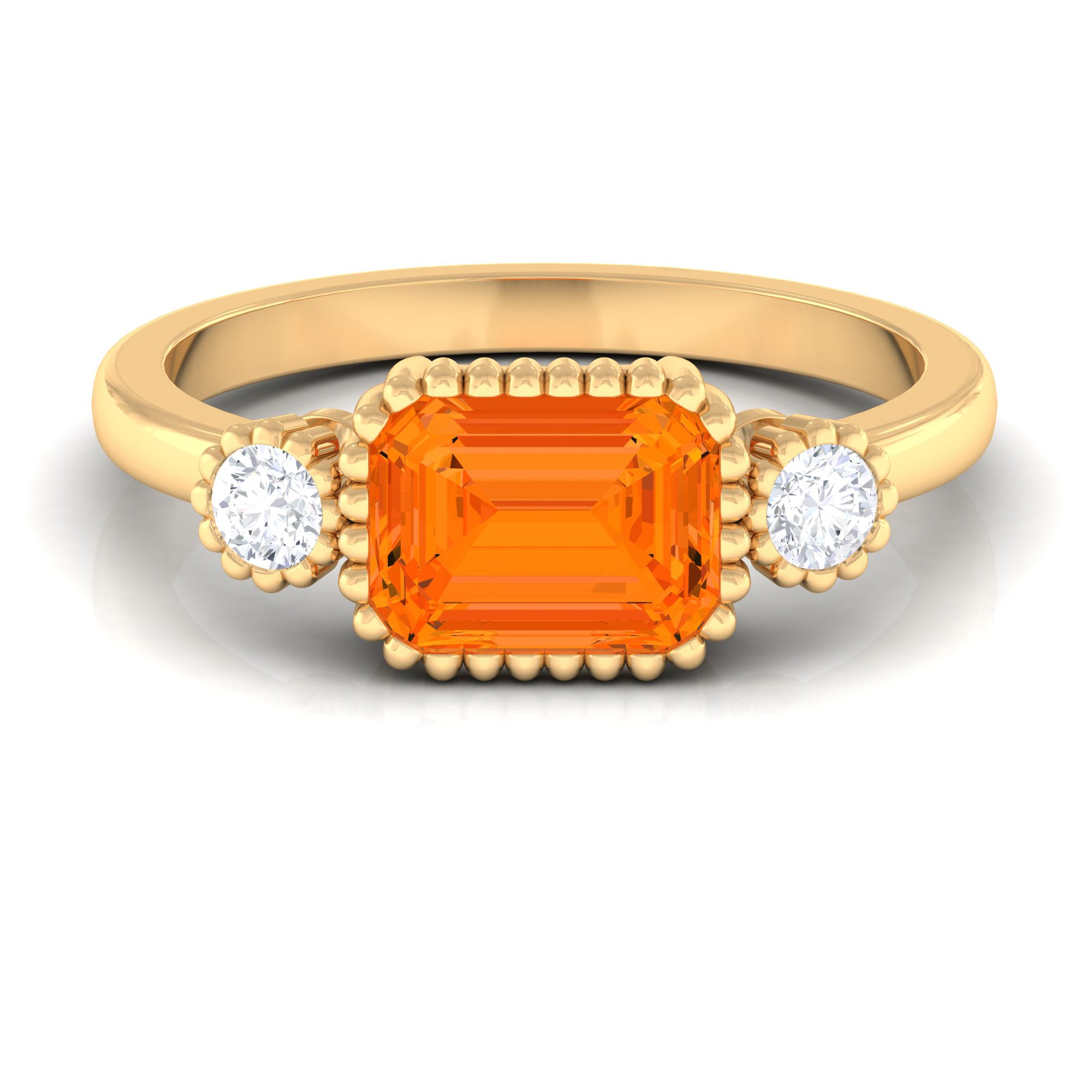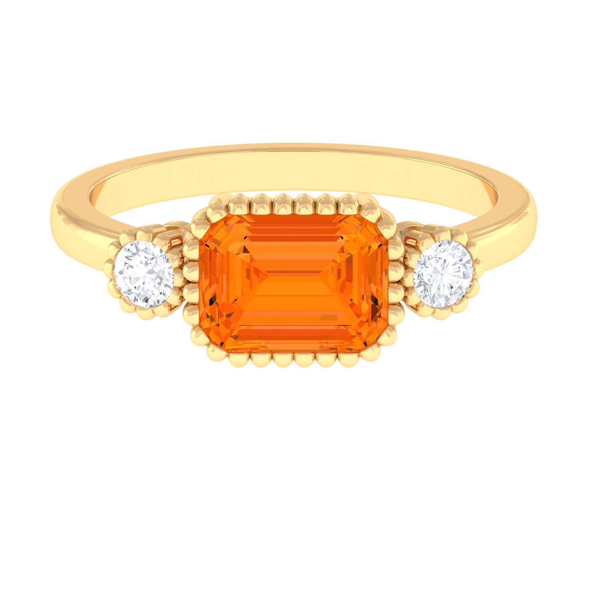 Beaded Gold around the East West set Fire Opal is accentuating the charm of this ring. The Round Diamond, each on both side along with Emerald Cut Fire Opal forms an alluring Three Stone Engagement Ring. Fire Opal Solitaire Ring will elate your pretty lady.
