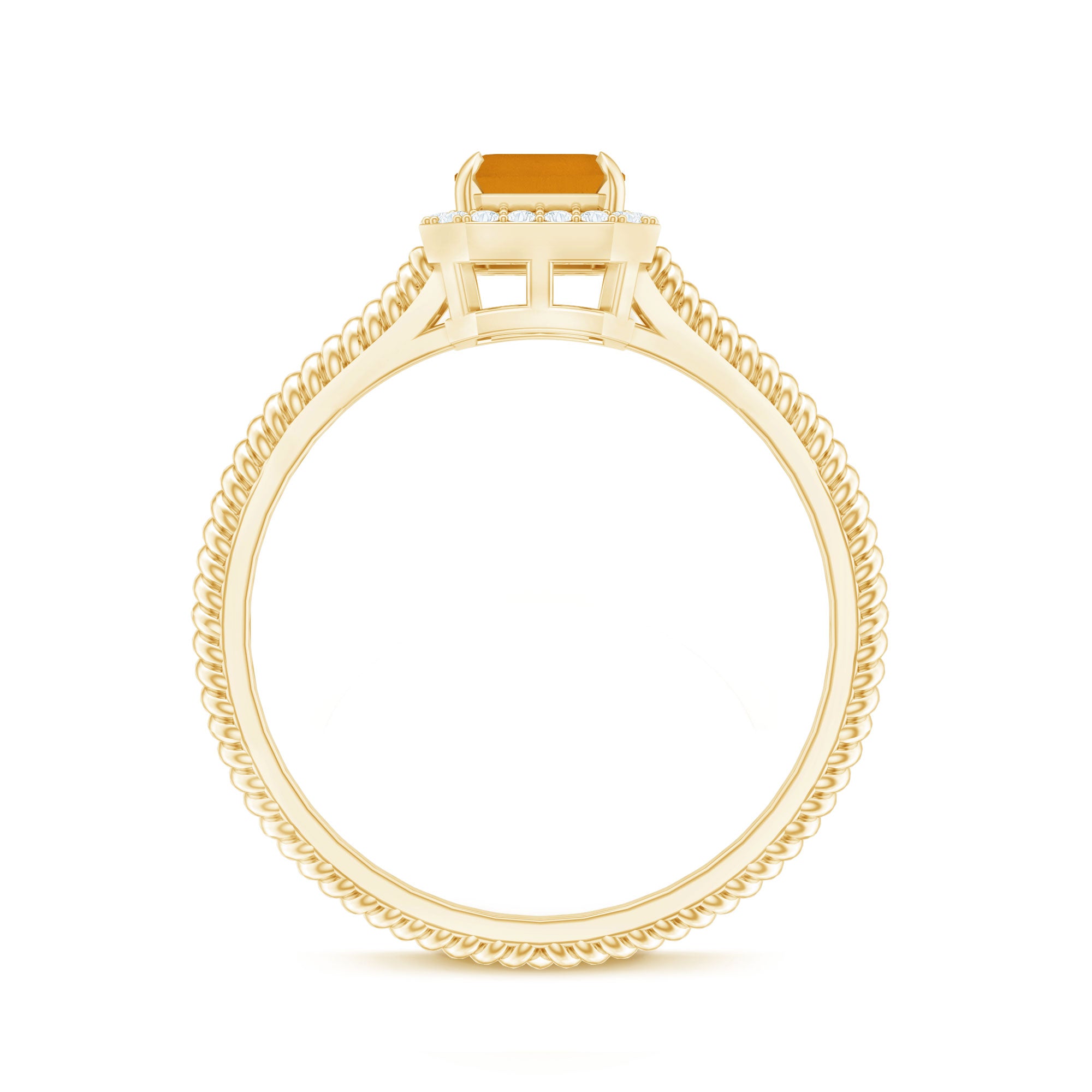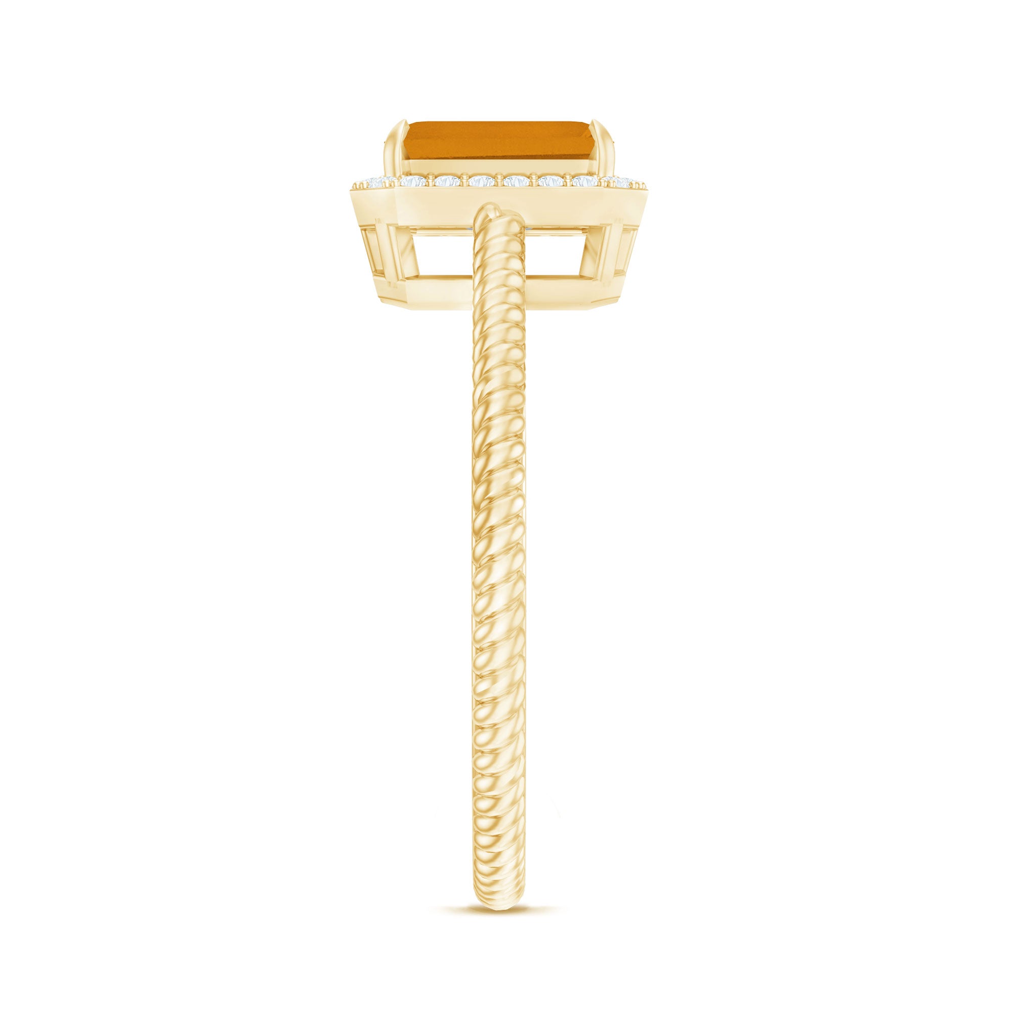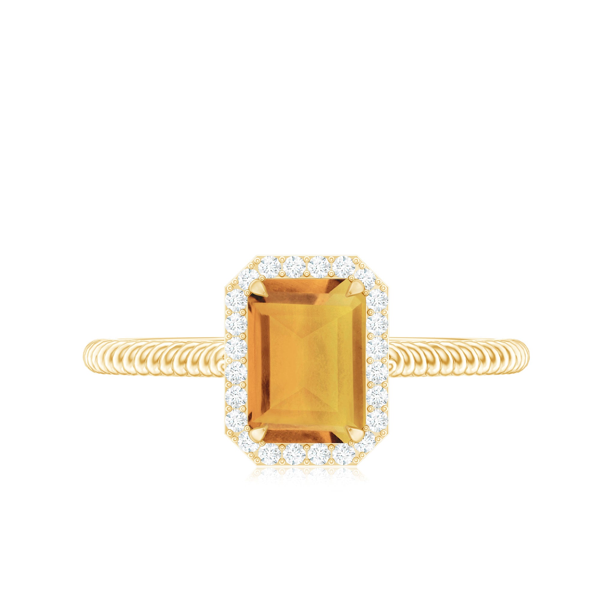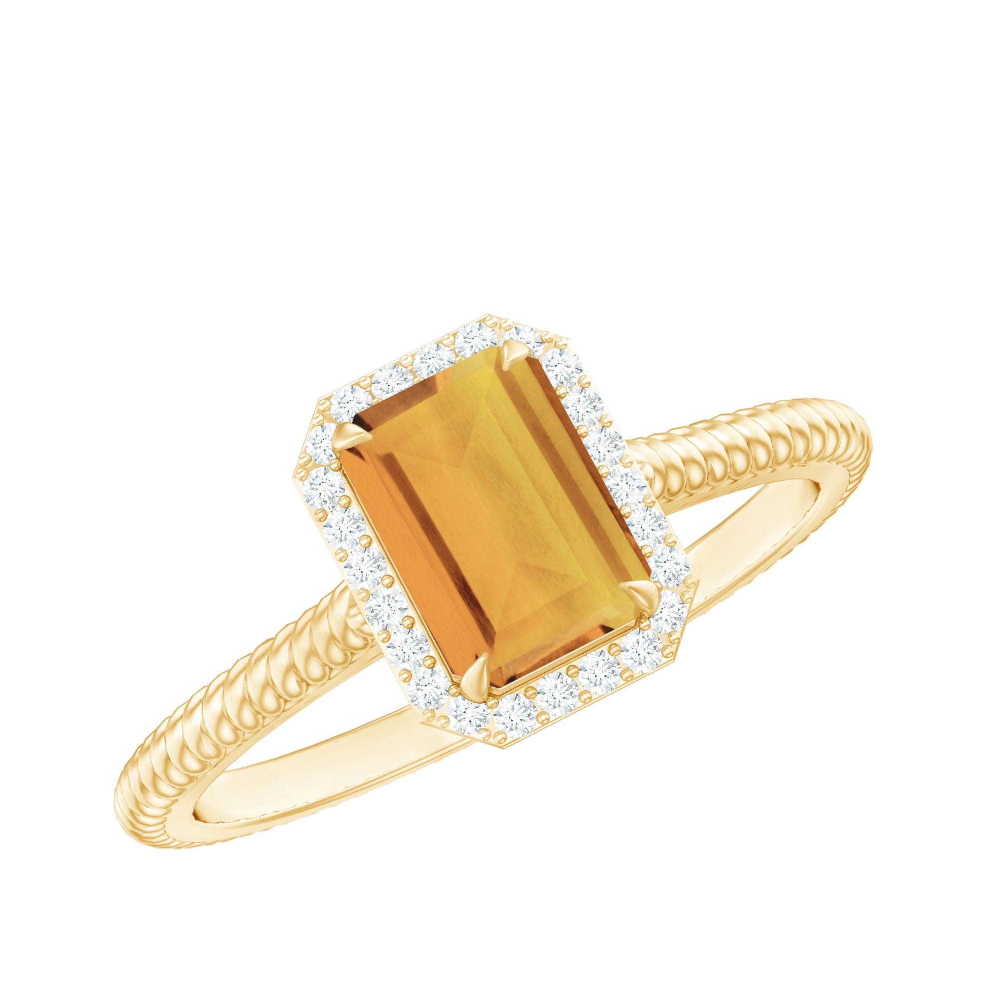 Emerald Cut Citrine Ring shows the serenity of your personality, it is crafted in Gold for luxurious appeal. Citrine Solitaire held in Claw Setting created a strong image of the wearer and along with that Diamond Halo makes this ring look sumptuous. Citrine Engagement Ring showcases brilliance with its rich yellow hue.