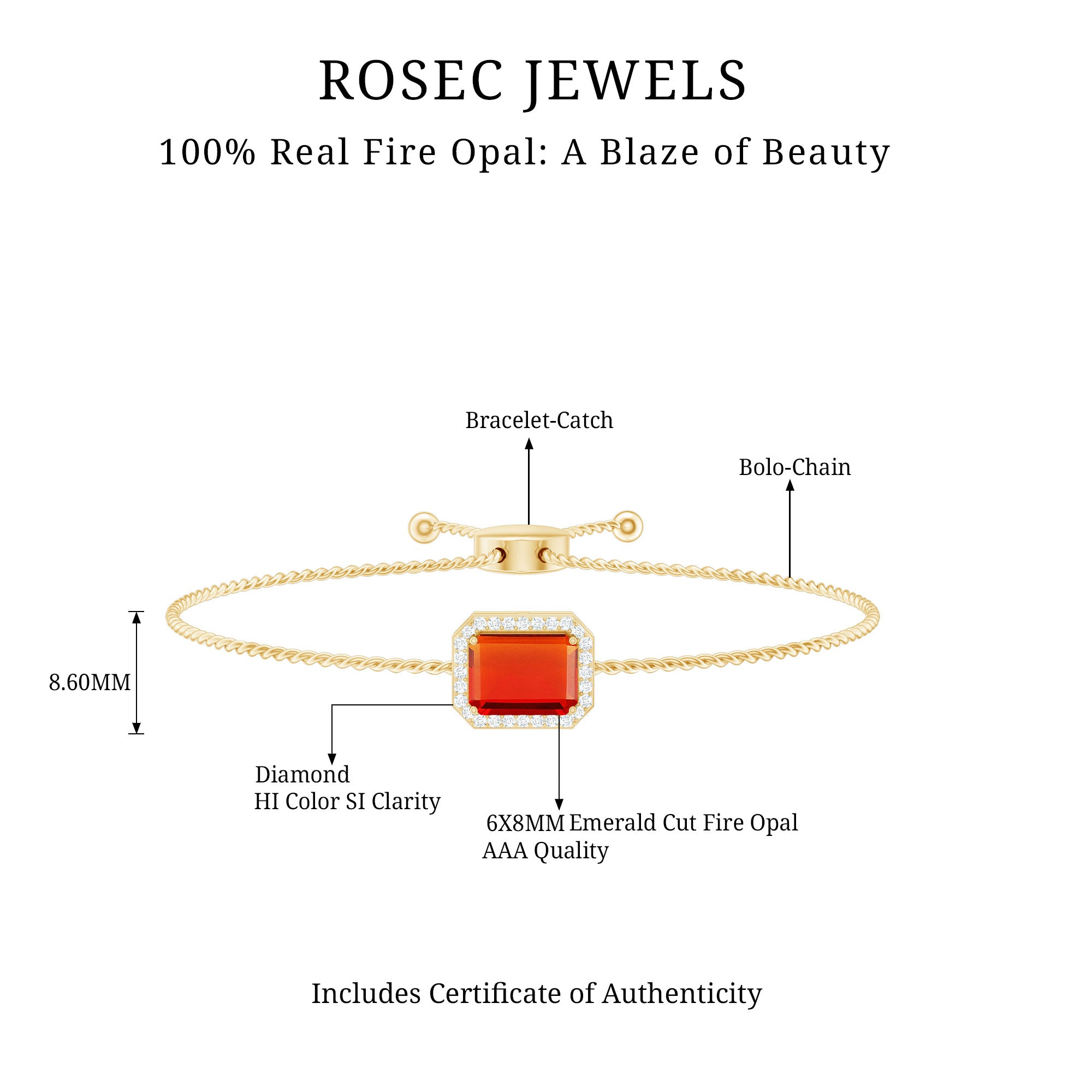 The dazzling beauty of the Bolo Chain Bracelet renders it a perfect selection for your significant occasions and events. It showcases Emerald Cut Fire Opal held in place by a Prong Setting, complemented by Round Diamonds arranged as a Halo. Delight your partner on your anniversary by presenting this Fire Opal Bracelet as a gift to create a memorable experience. The captivating orangish tone and timeless radiance of the diamonds are sure to capture everyones attention and place you in the spotlight. Treat yourself or offer it as a gift to someone special, as it makes for a delightful birthday or anniversary present. This Opal Chain Bracelet, featuring an outstanding design, represents a blend of subtle elegance and stunning beauty. Highlighting exquisite luxury, this Halo Chain Bracelet could serve as the perfect gift for weddings, anniversaries, or any significant occasion for a cherished individual. Furthermore, Fire Opal is associated with the October birthstone, making it a considerate gift for her.
