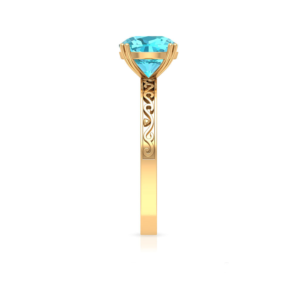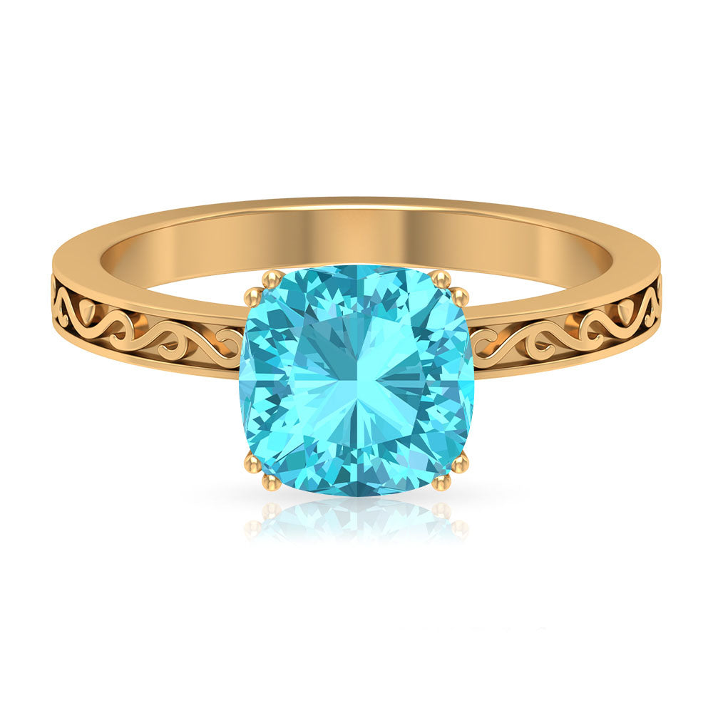 Elegantly designed for your beloved, this Gold Engraved Ring is adorned with Cushion Cut Swiss Blue Topaz Solitaire in French Setting. Filigree detail on the band give an aesthetic appeal to this ring.