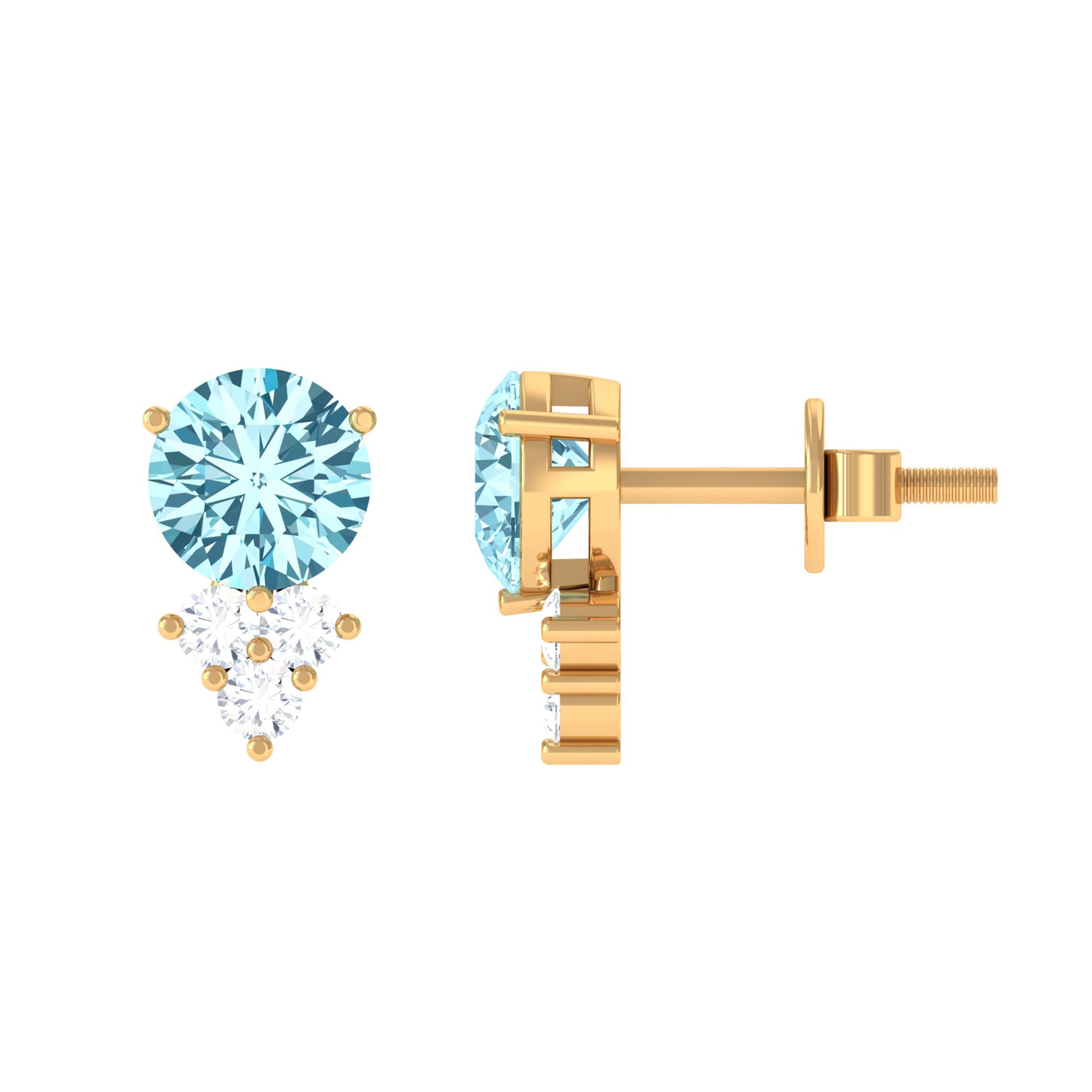 Classic Beautiful Stud Earring embellished with Round Shape Aquamarine set as Solitaire and Round Shape Diamond Trio is set in Prong Setting. This Simple Stud Earring is Composed in Solid Gold.