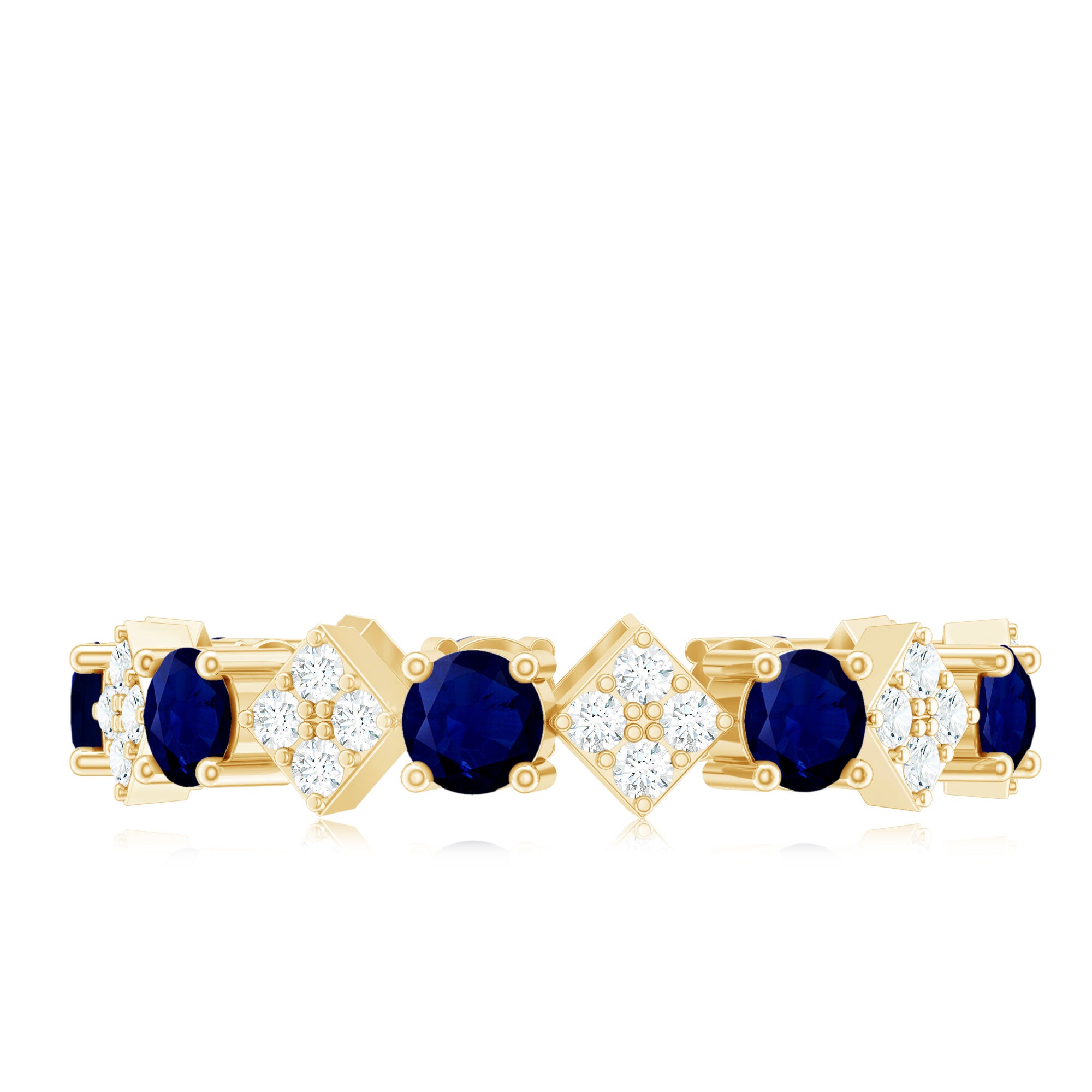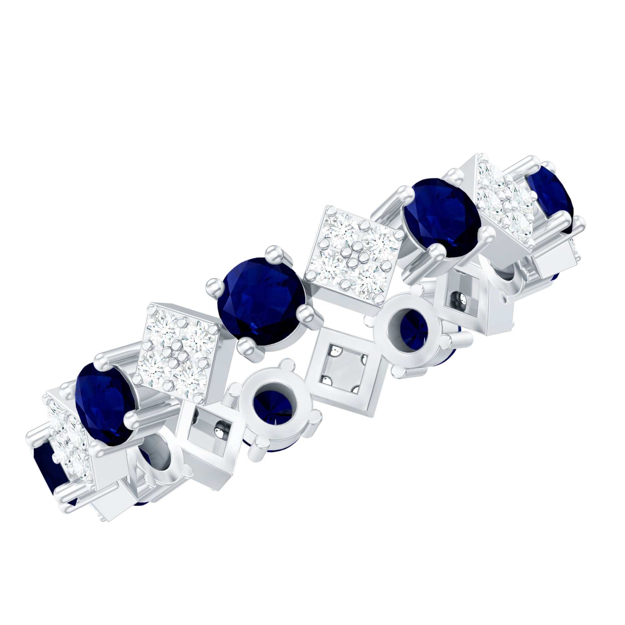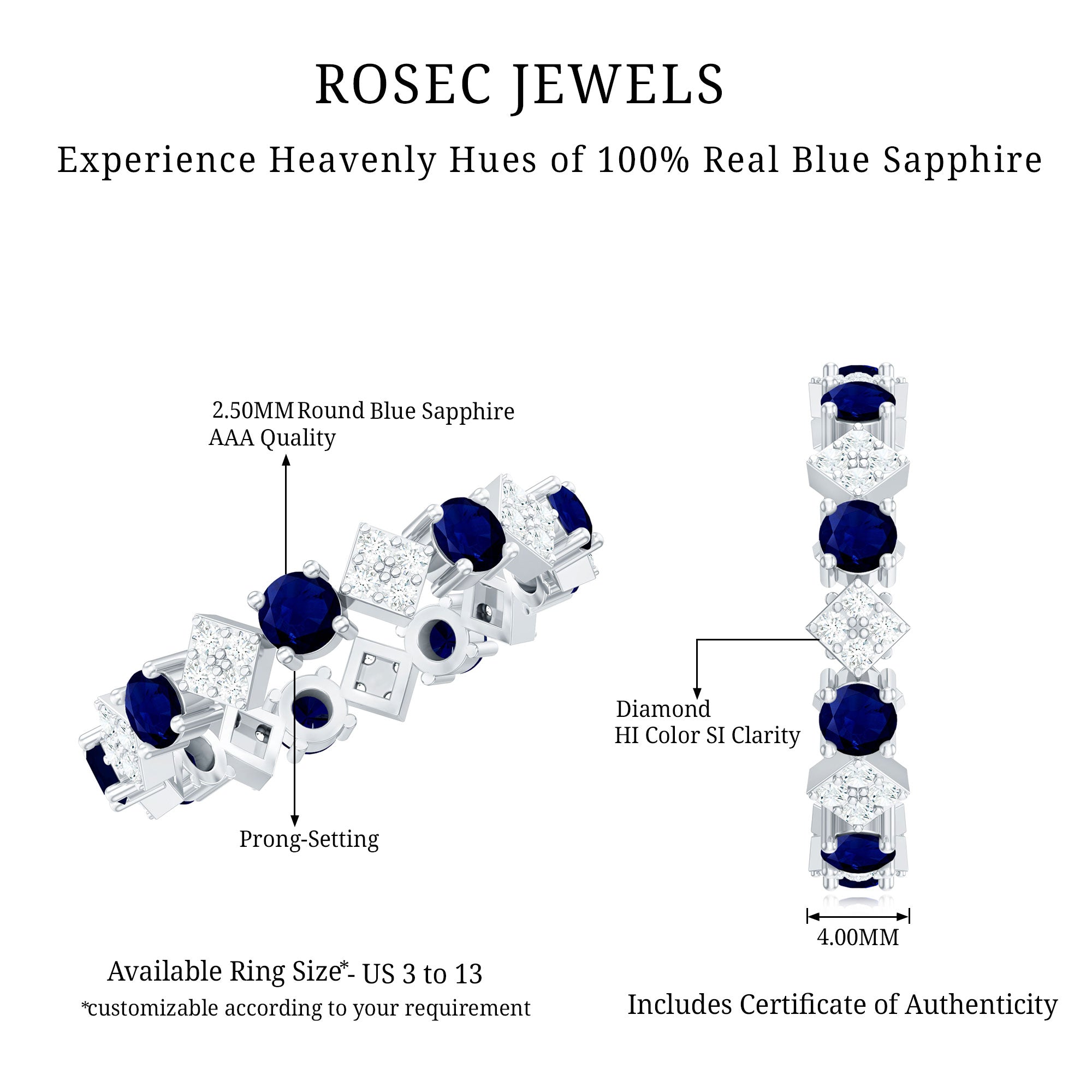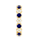 This unique Eternity Ring features a Round Shape Blue Sapphire and Round Diamonds studded on a unique design, adding a touch of elegance. Adorn yourself with this Blue Sapphire Ring, style it with your special attires, and create a lasting impression on everyones minds. This Eternity Ring makes a precious anniversary gift for your better half.
