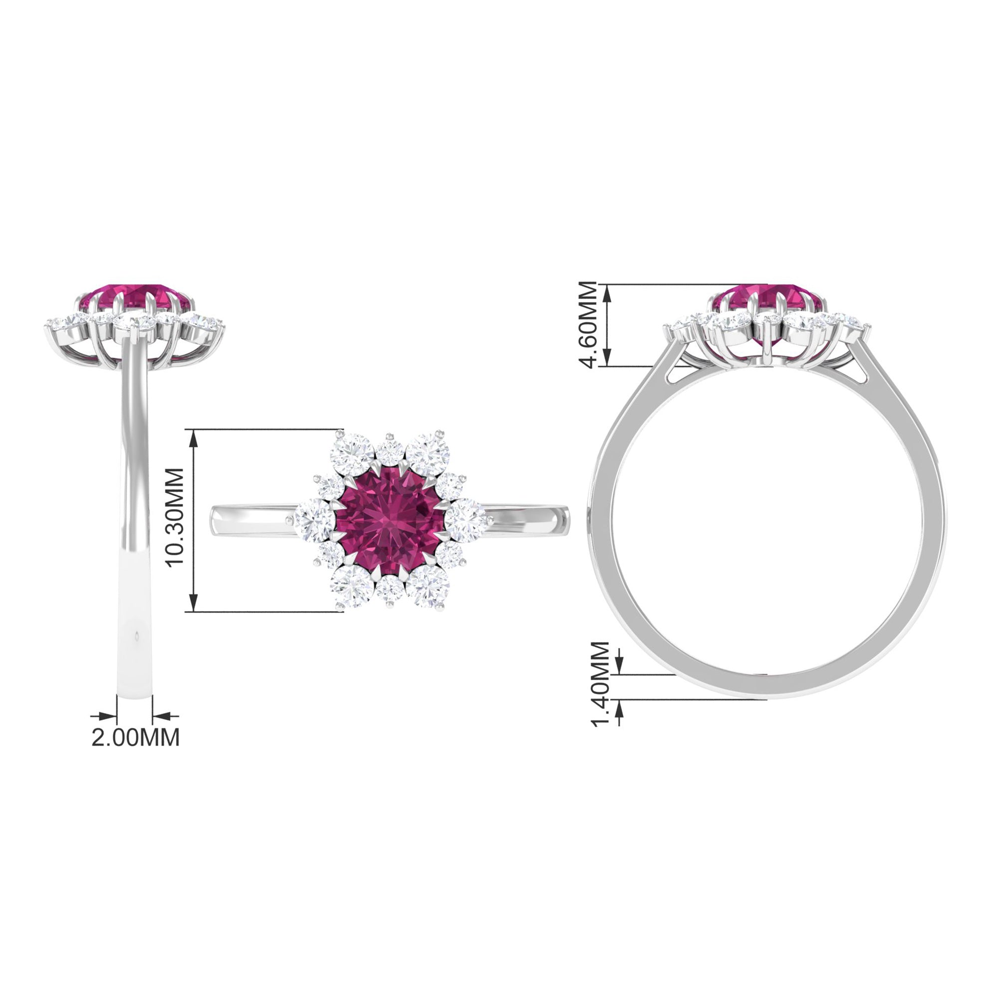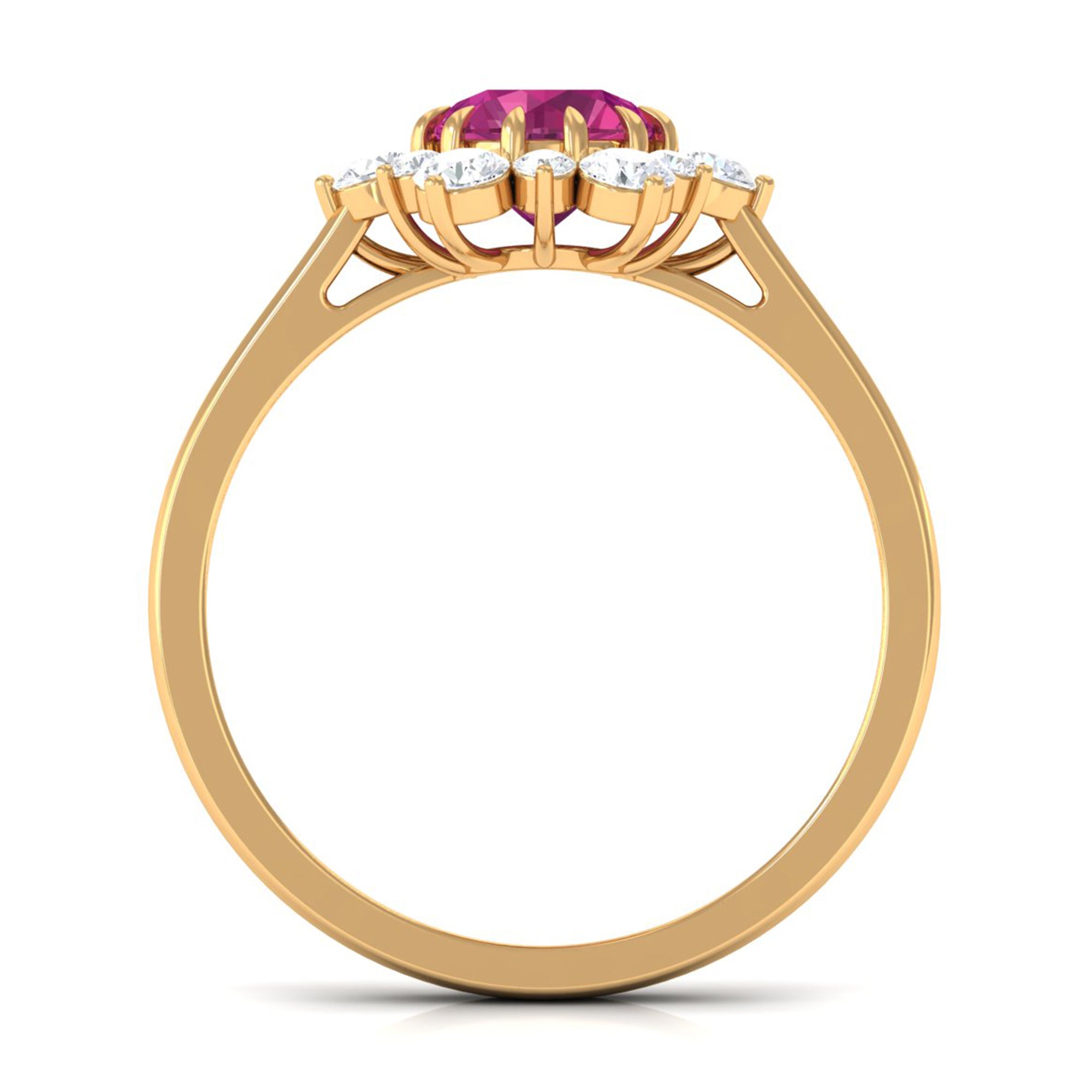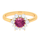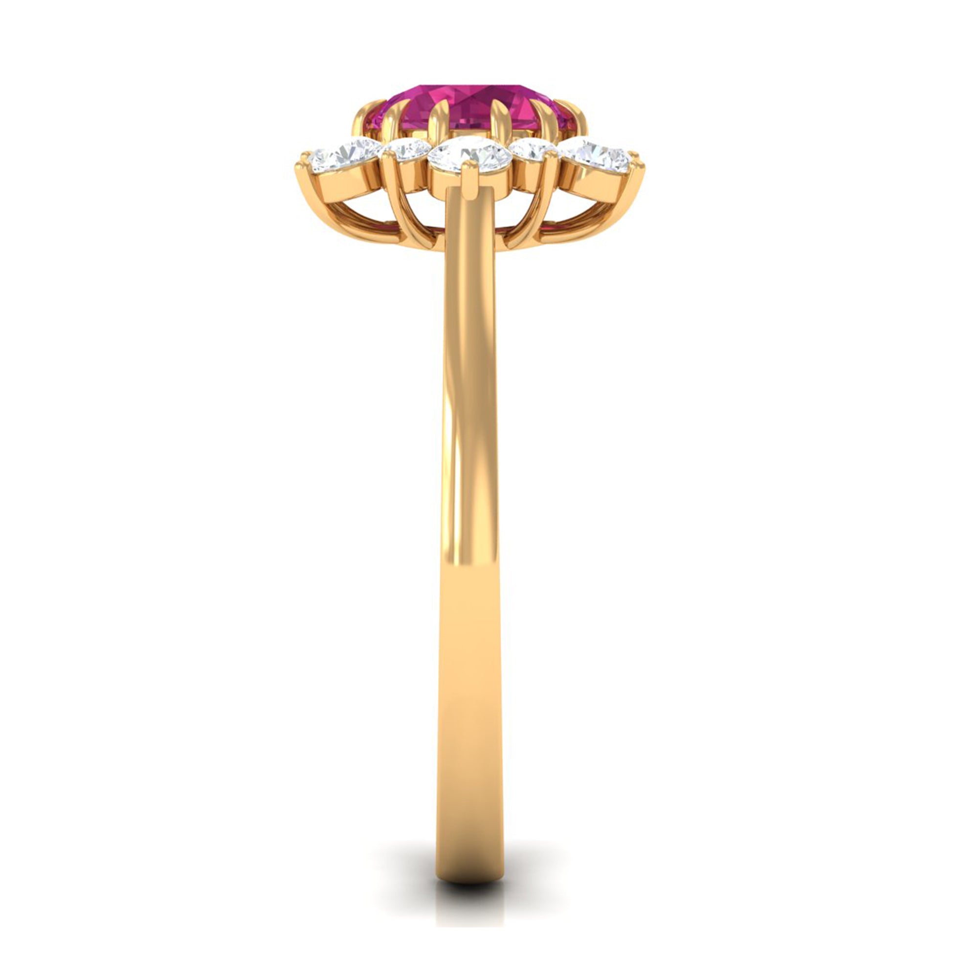 This elegant gold engagement ring for women features a round-cut Pink Tourmaline at its center in a claw setting, surrounded by a dazzling halo of Diamond stones. The stunning Pink Tourmaline and sparkling Diamond combination makes for a truly striking design, perfect for any woman who loves classic, timeless pieces. This Pink Tourmaline engagement ring is a beautiful choice for anyone seeking a stylish and sophisticated way to show their affection and appreciation.