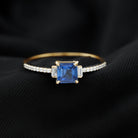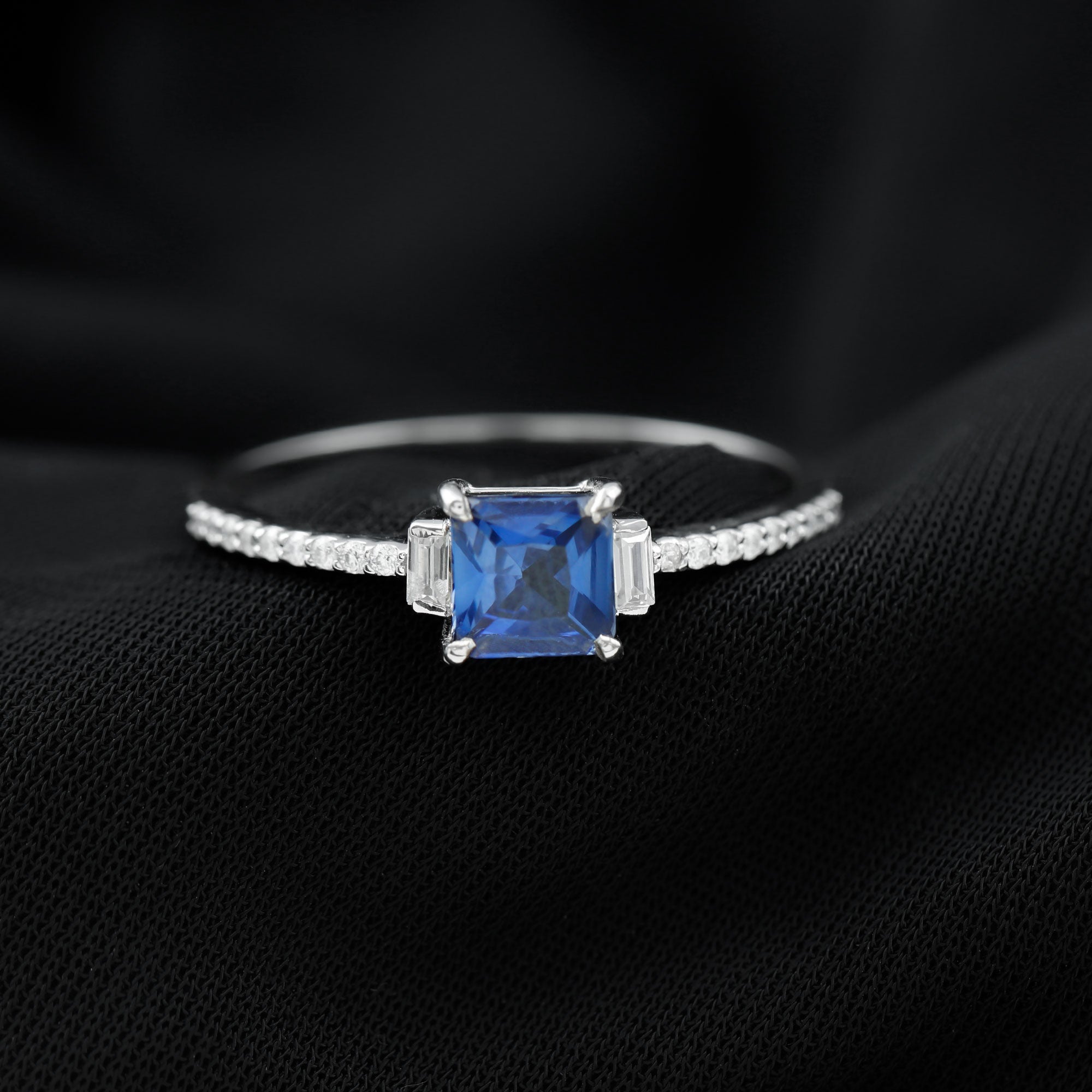 Express your love on a special day with this minimal Promise Ring featuring a Princess Cut Created Blue Sapphire as the solitaire stone, accented with Round and Baguette Cut Diamond side stones. Crafted with Solid Gold, this Valentines Day Ring for Women is a perfect gift to make your beloved feel truly loved.