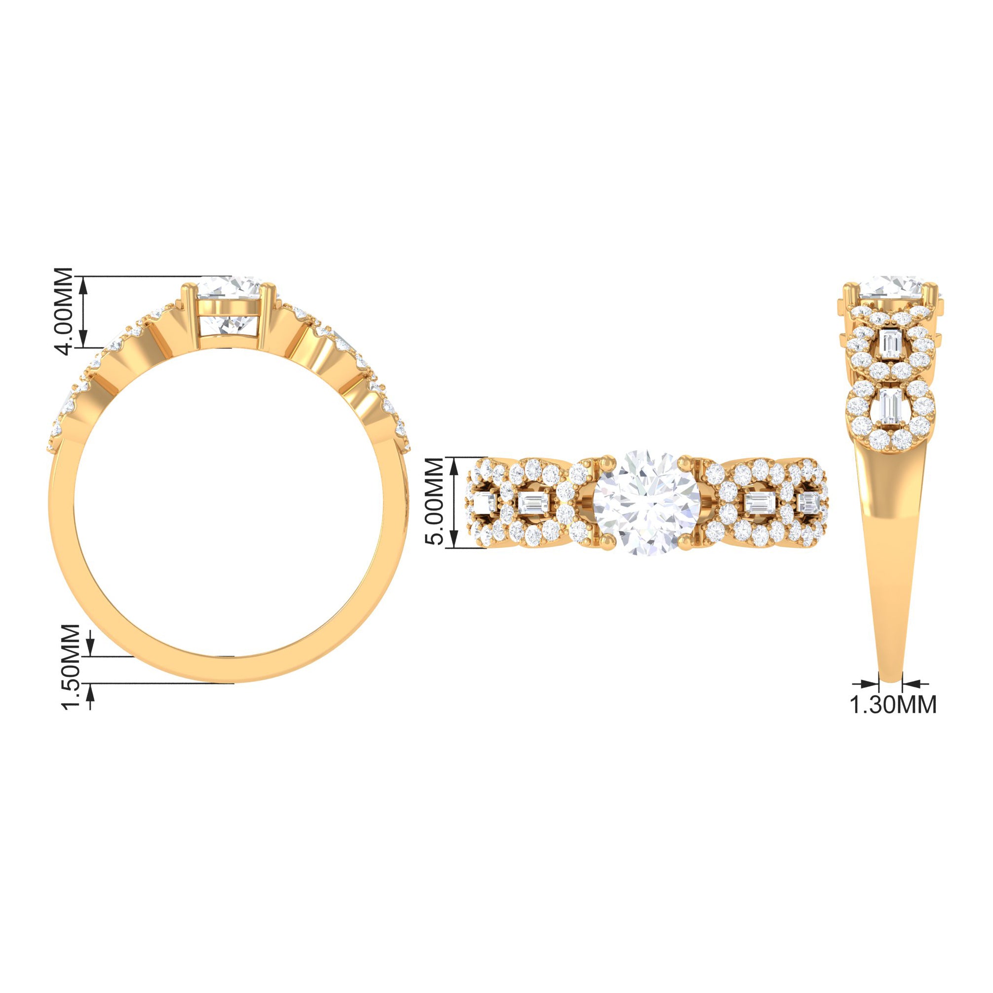 Why settle for an ordinary Moissanite Engagement Ring when you can have this masterpiece, full of sparkle and modern charm. At the center of this remarkable design rests a dazzling 6 MM round moissanite set securely in prong setting, radiating a fiery brilliance that captures attention from every angle. The central stone is beautifully complemented by an intricate arrangement of round and baguette moissanites along the band, creating a luxurious and balanced composition. This Designer Engagement Ring speaks of refined artistry and detailed craftsmanship. The timeless detailing and stunning sparkle makes it an ideal choice for someone who appreciates bold elegance and thoughtful design. Whether viewed from the top or admired from the side, the brilliance of the stones and the finesse of the setting offer an enchanting experience. Perfect for a proposal or a meaningful gift, this Round Cut Engagement Ring is more than just a symbol of love - it is a statement of sophistication and individuality, designed to be treasured for a lifetime.