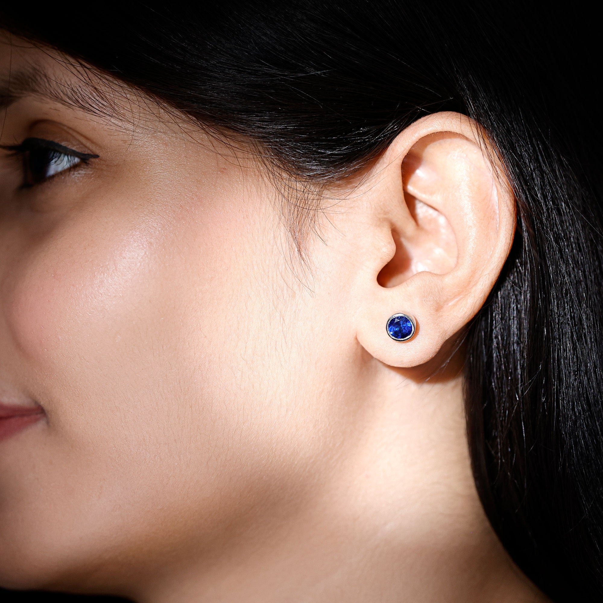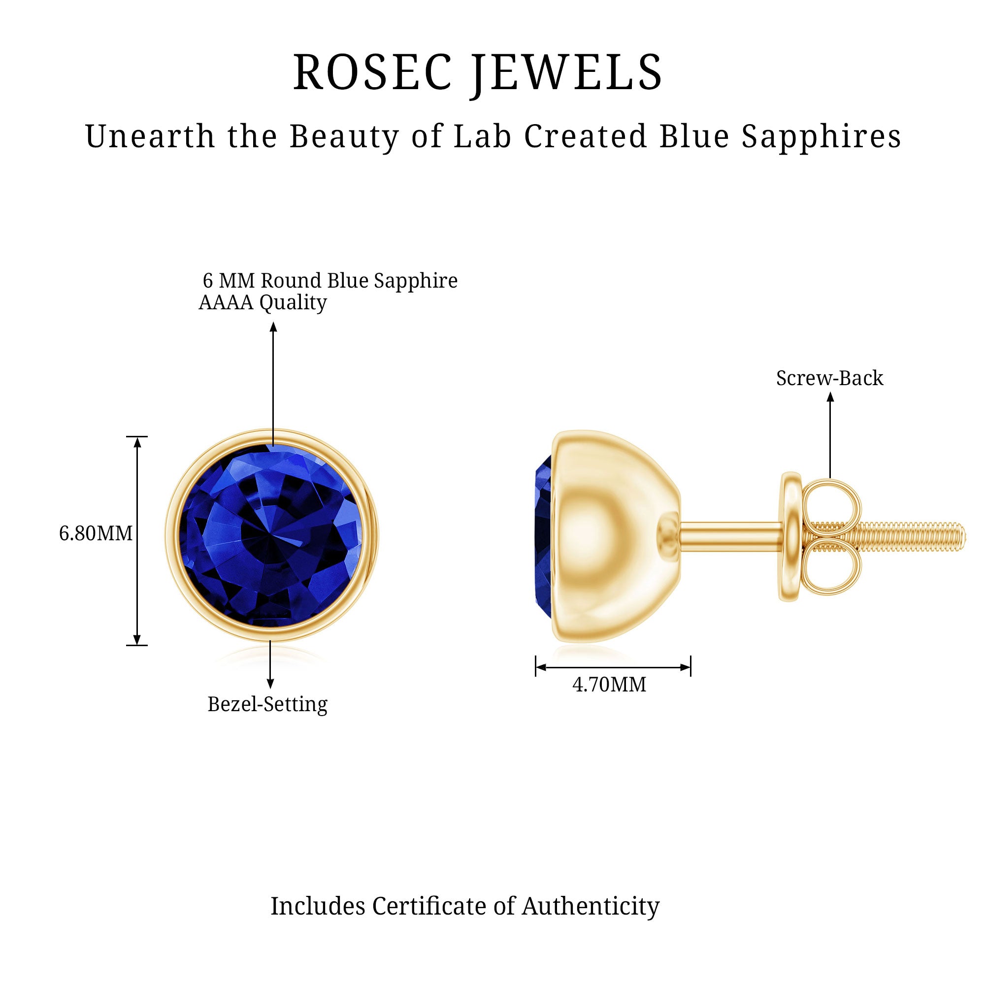 Brighten up your style with these one-of-a-kind Certified Created Blue Sapphire Earrings. The round Created Blue Sapphire gemstone in a bezel setting provides a gorgeous, beautiful look. Available in White Gold, Rose Gold, and Yellow Gold, this Blue Gemstone Earring adds a charming touch. It makes an ideal anniversary gift for your significant other.