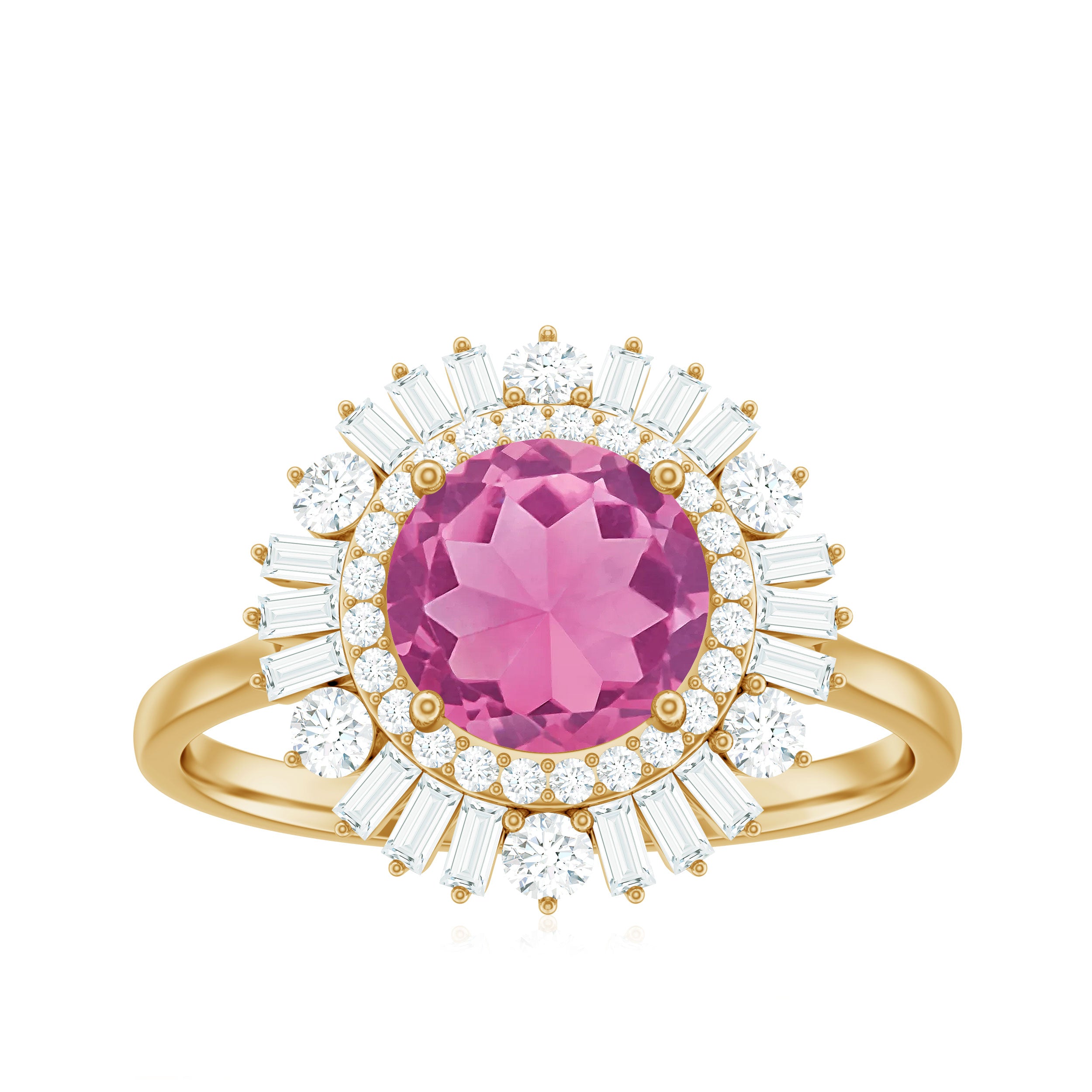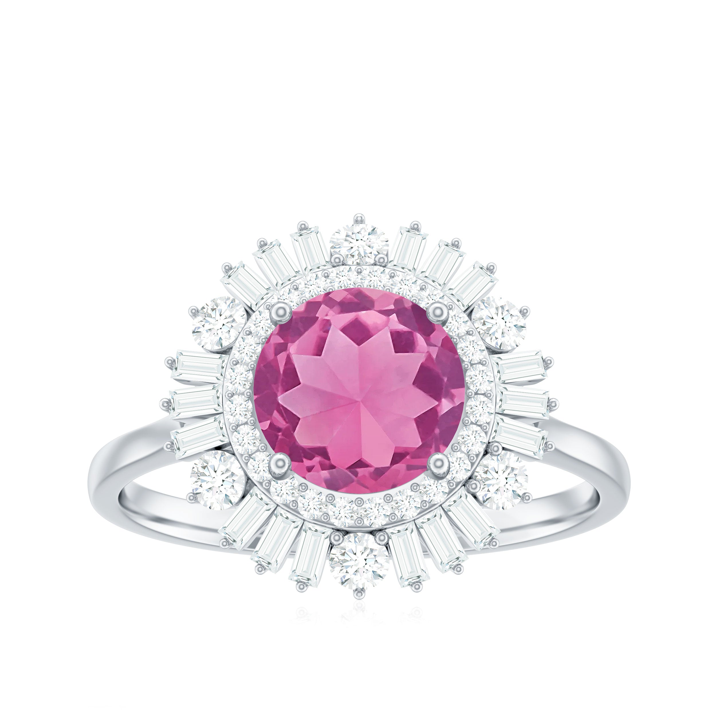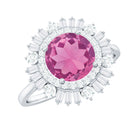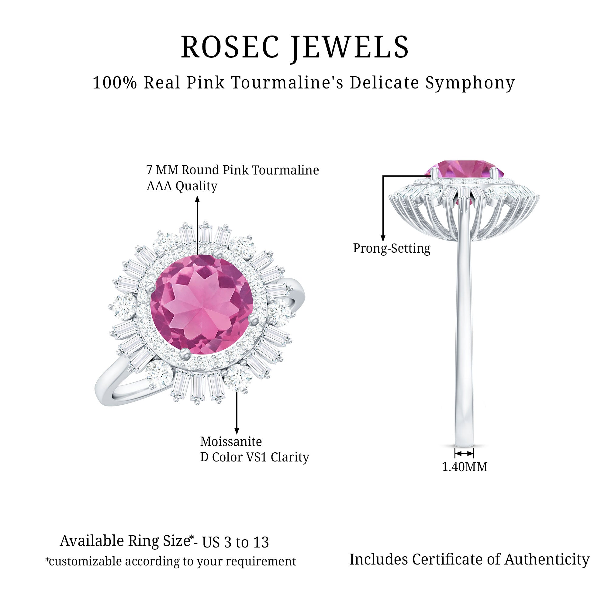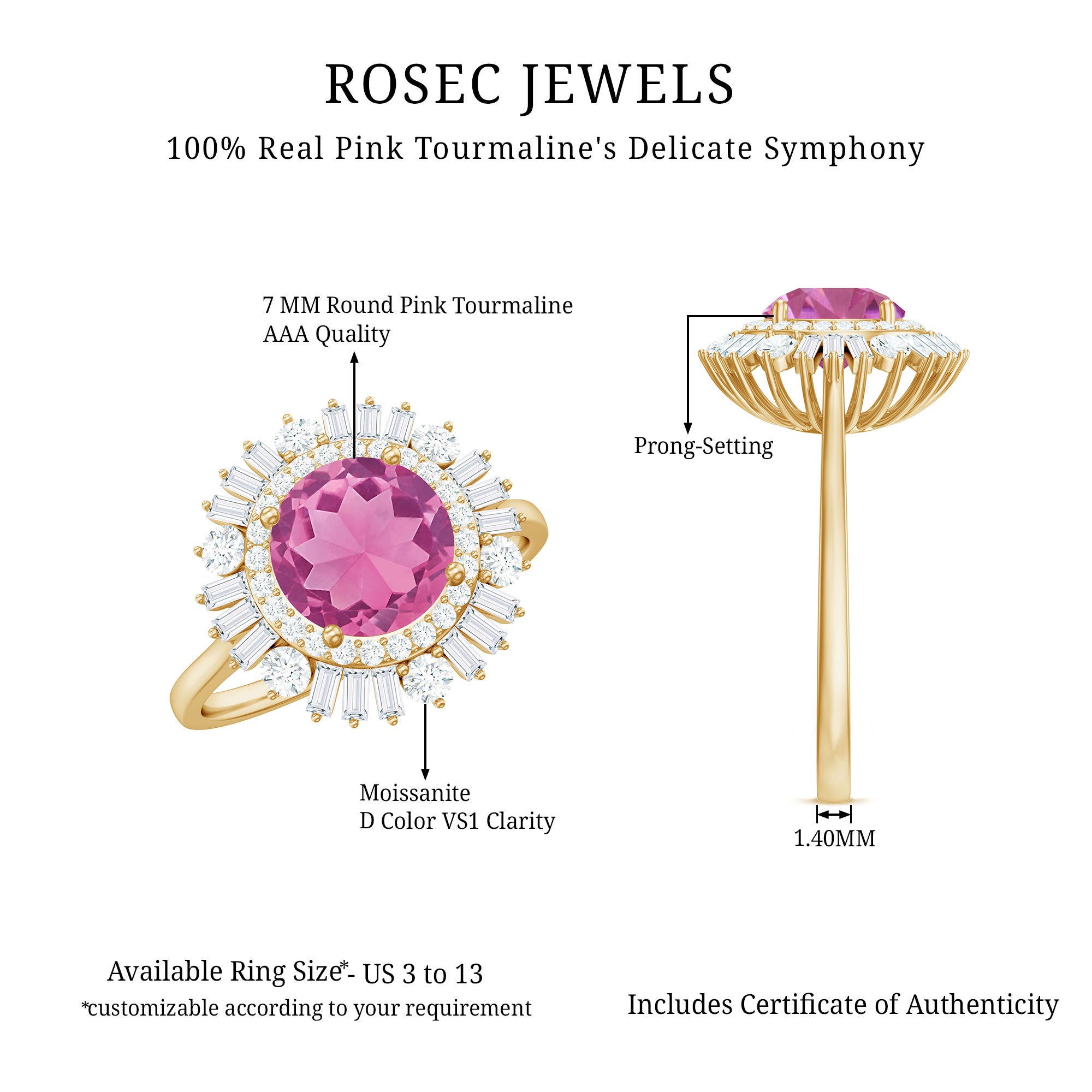This stunning cocktail ring features a round shape pink tourmaline center stone set in prong setting. Surrounding the center stone are two halos of shimmering baguette and round shape moissanite gemstones, adding extra sparkle and dimension to the piece. The intricate design and feminine color palette make this ring a perfect statement piece for any special occasion.