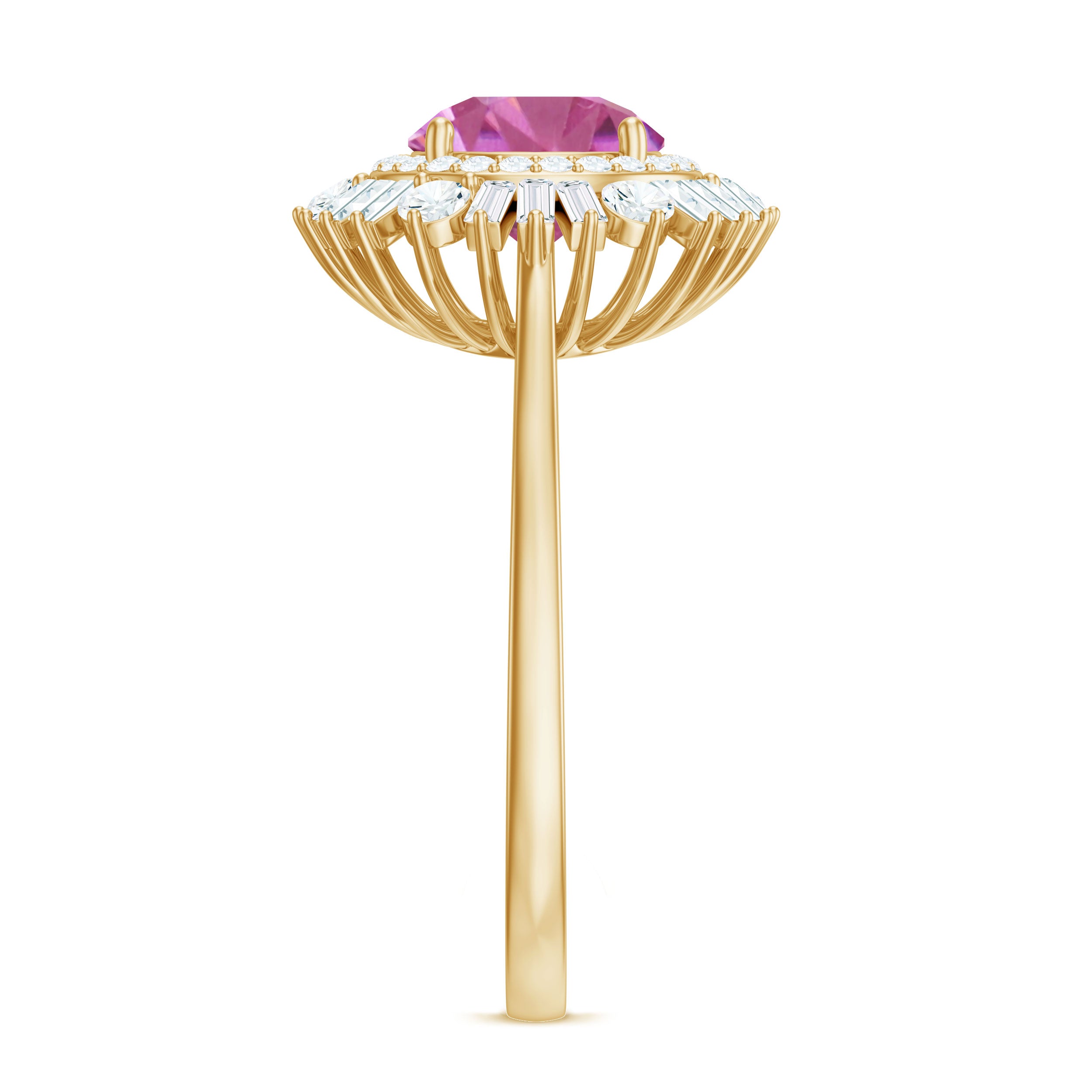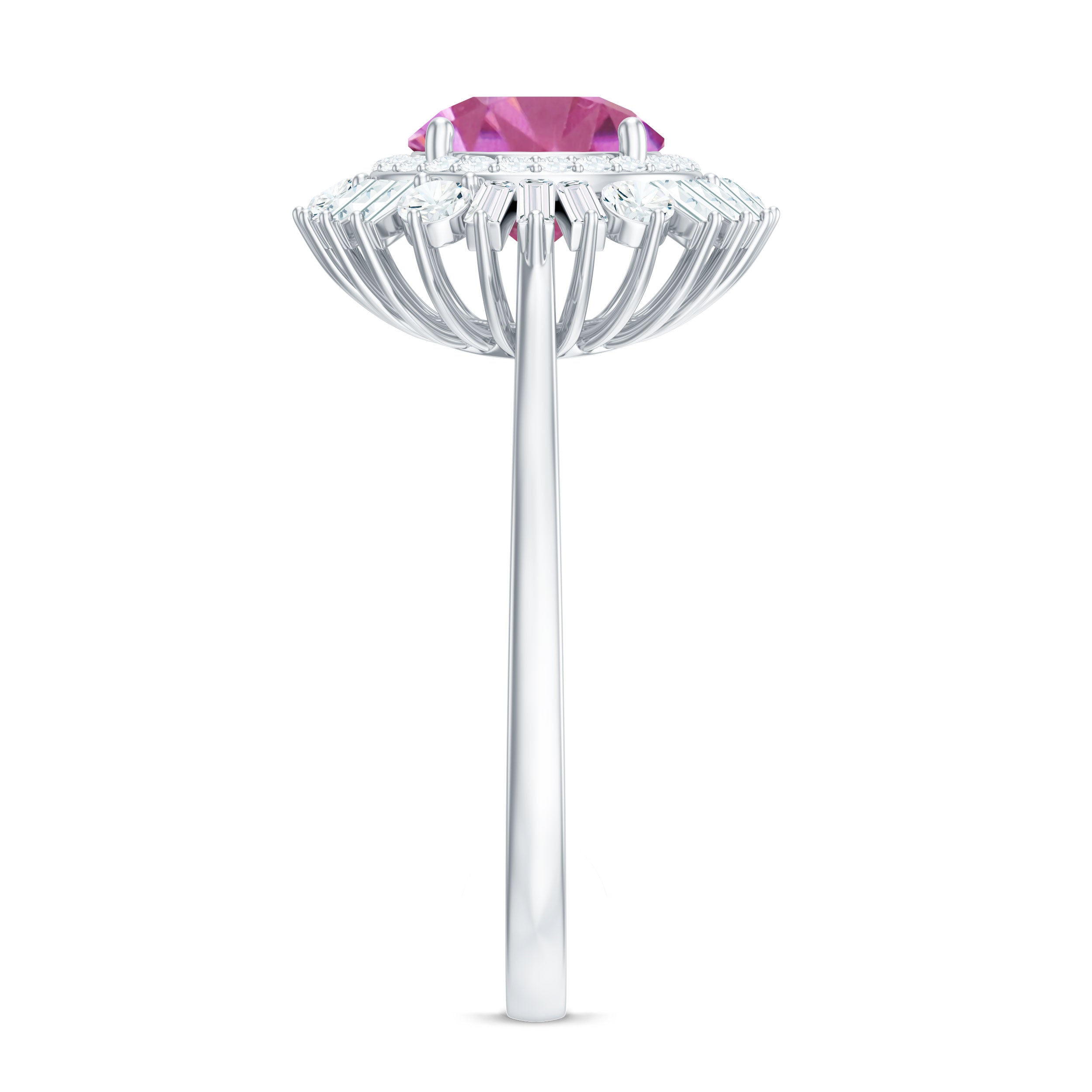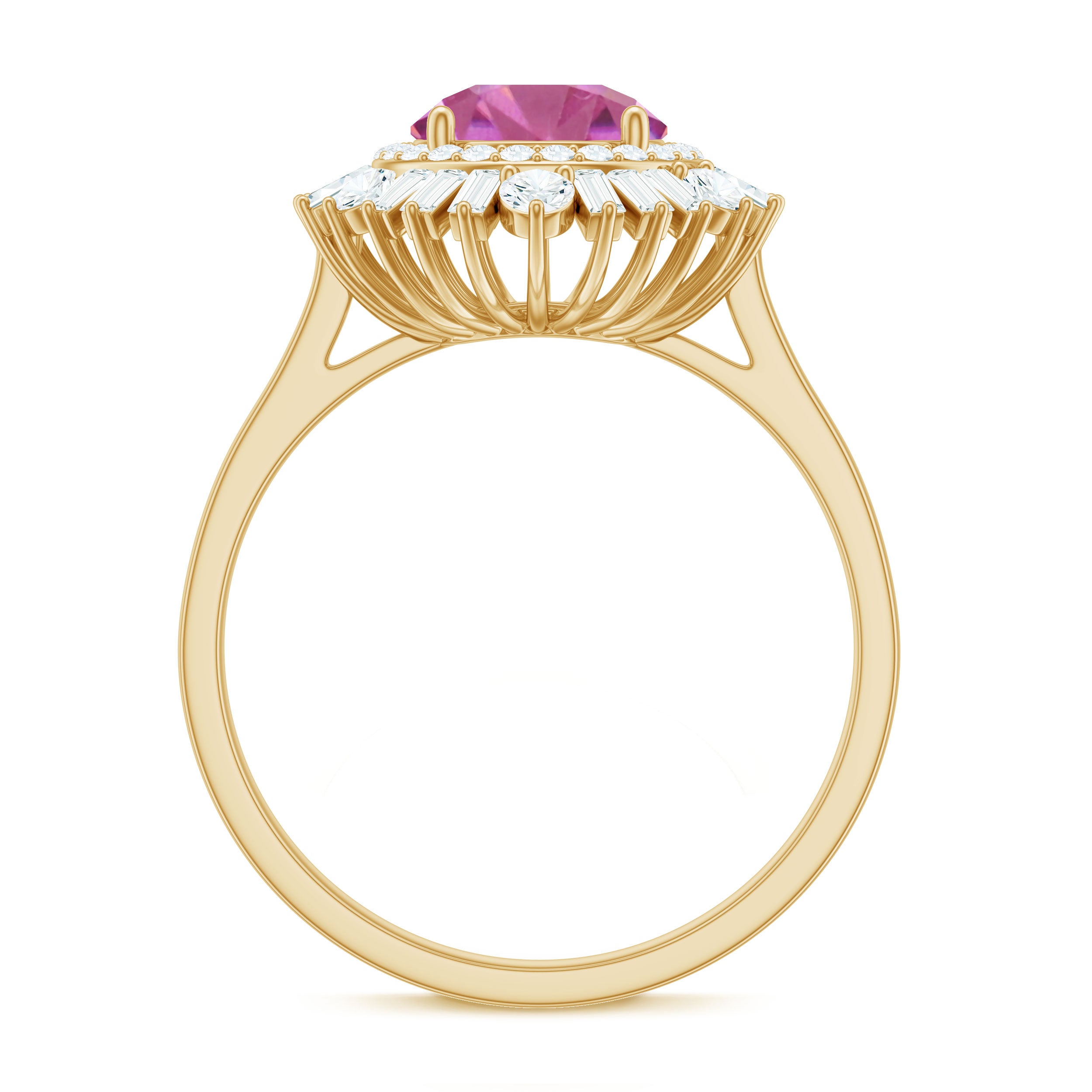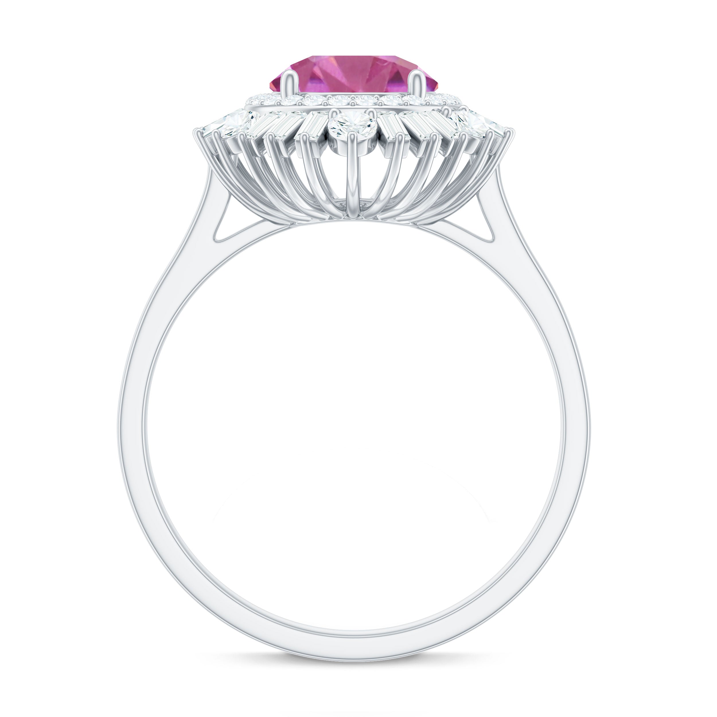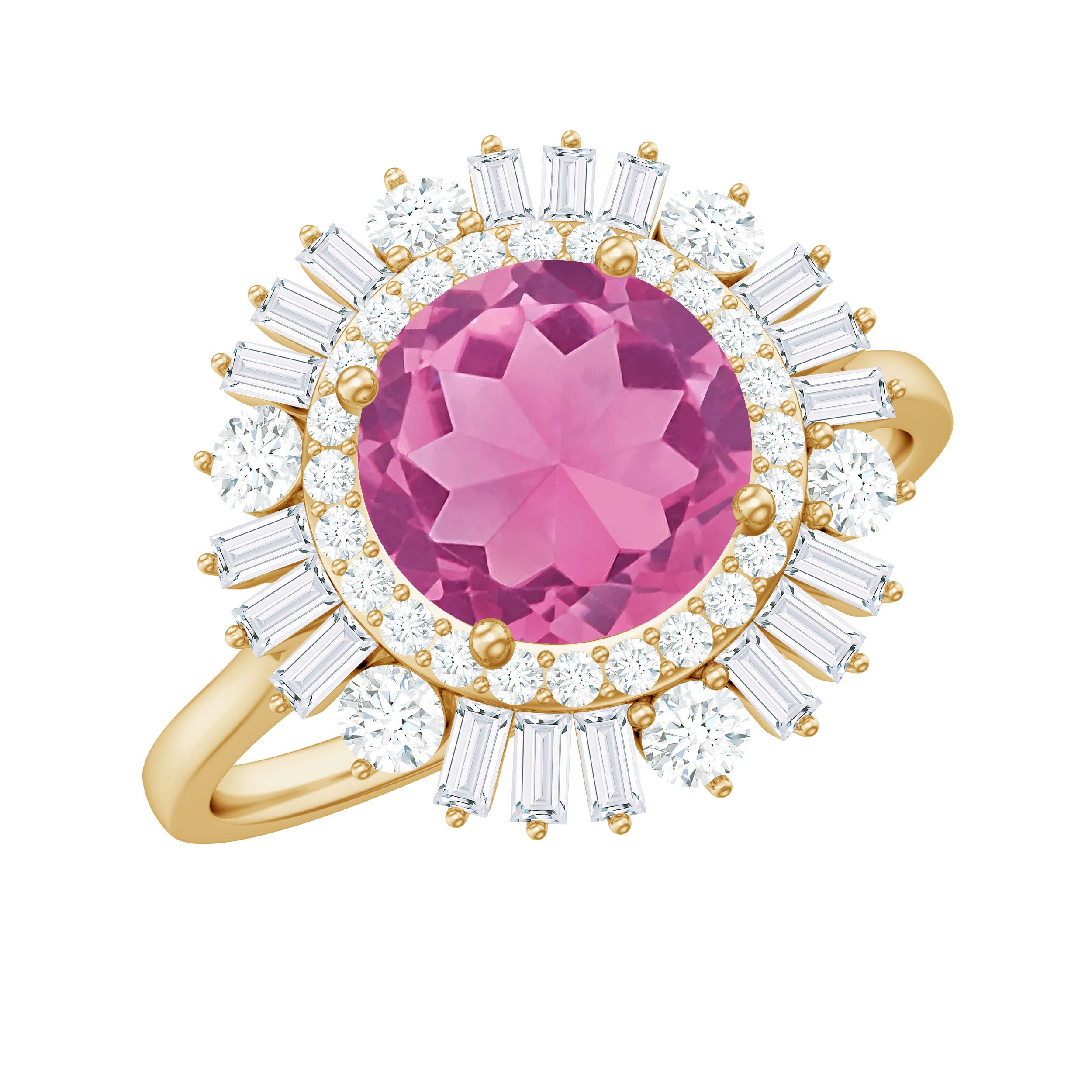 This stunning cocktail ring features a round shape pink tourmaline center stone set in prong setting. Surrounding the center stone are two halos of shimmering baguette and round shape moissanite gemstones, adding extra sparkle and dimension to the piece. The intricate design and feminine color palette make this ring a perfect statement piece for any special occasion.