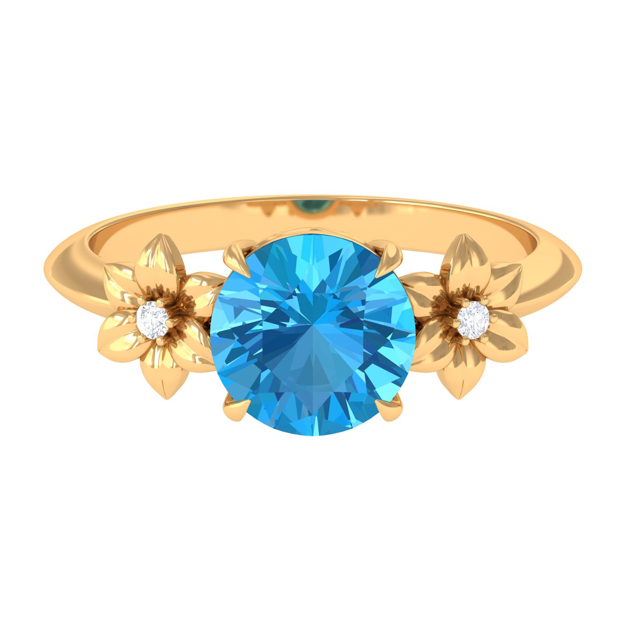 2 CT Round Swiss Blue Topaz Solitaire Flower Engagement Ring with Diamond