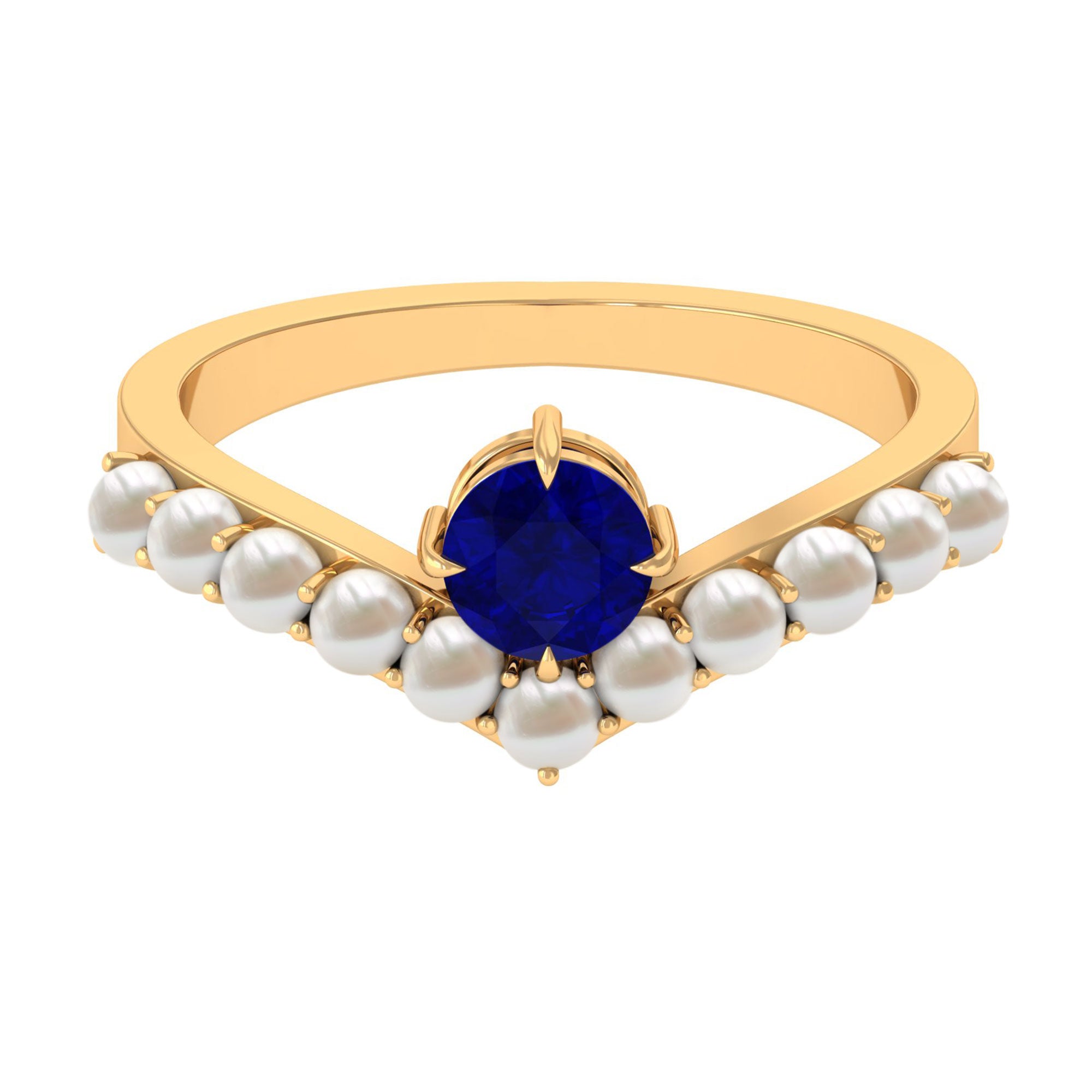 Wear eye-catching Blue Sapphire and Freshwater Pearl Chevron Ring to your next event. This Blue Sapphire Solitaire Ring is casted in Round Cut Blue Sapphire in 4 Claw Prong Diagonal Setting with Freshwater Pearl. Composed of Solid Gold, this Natural Blue Sapphire Ring is a perfect surprise for your loved ones.