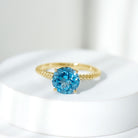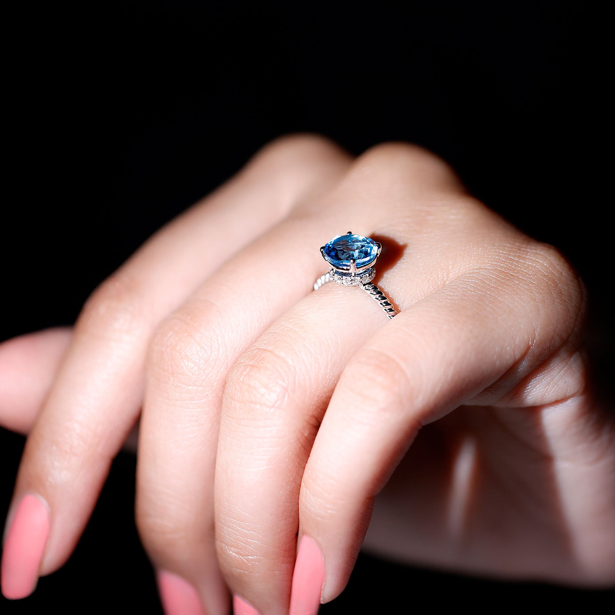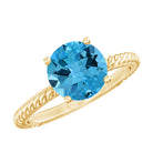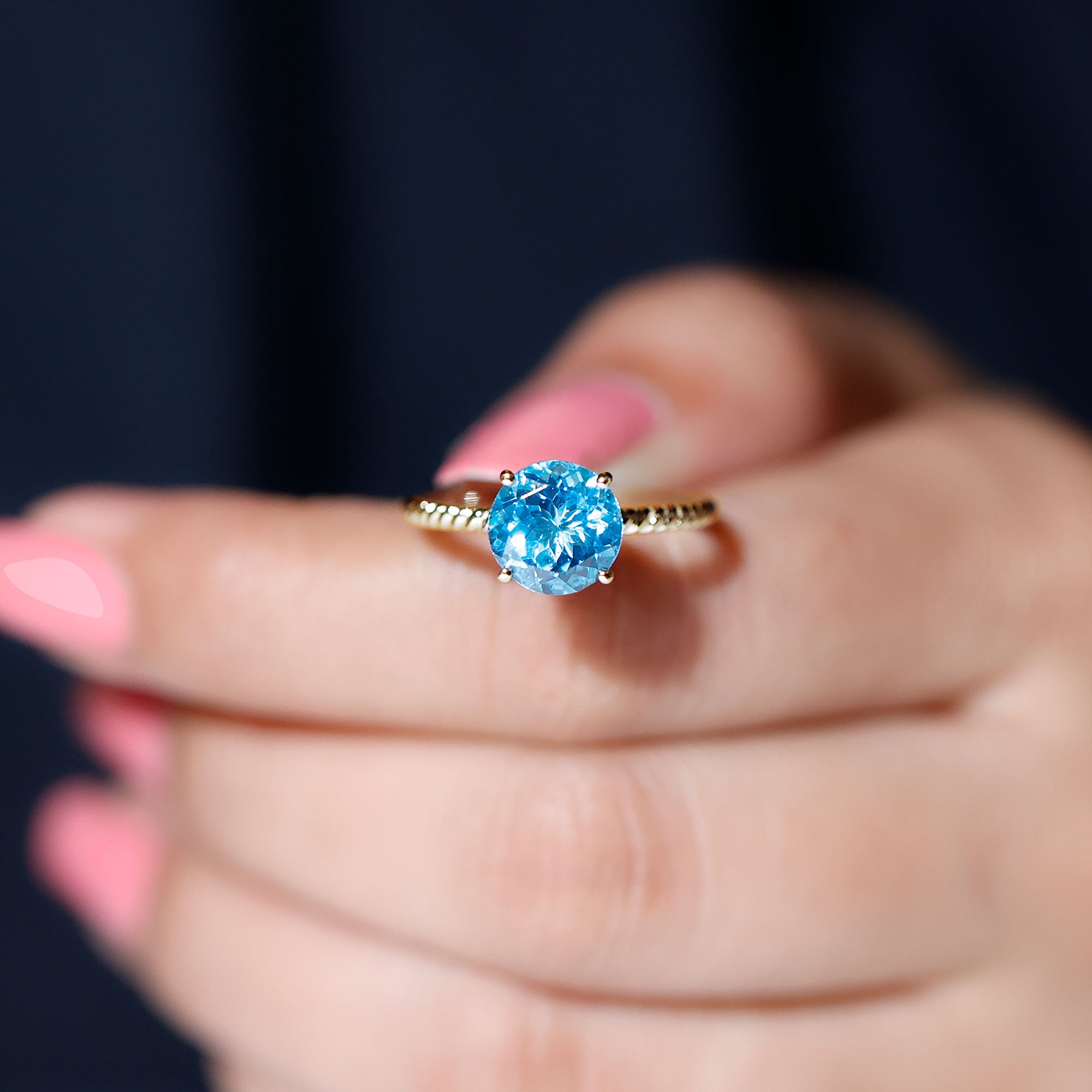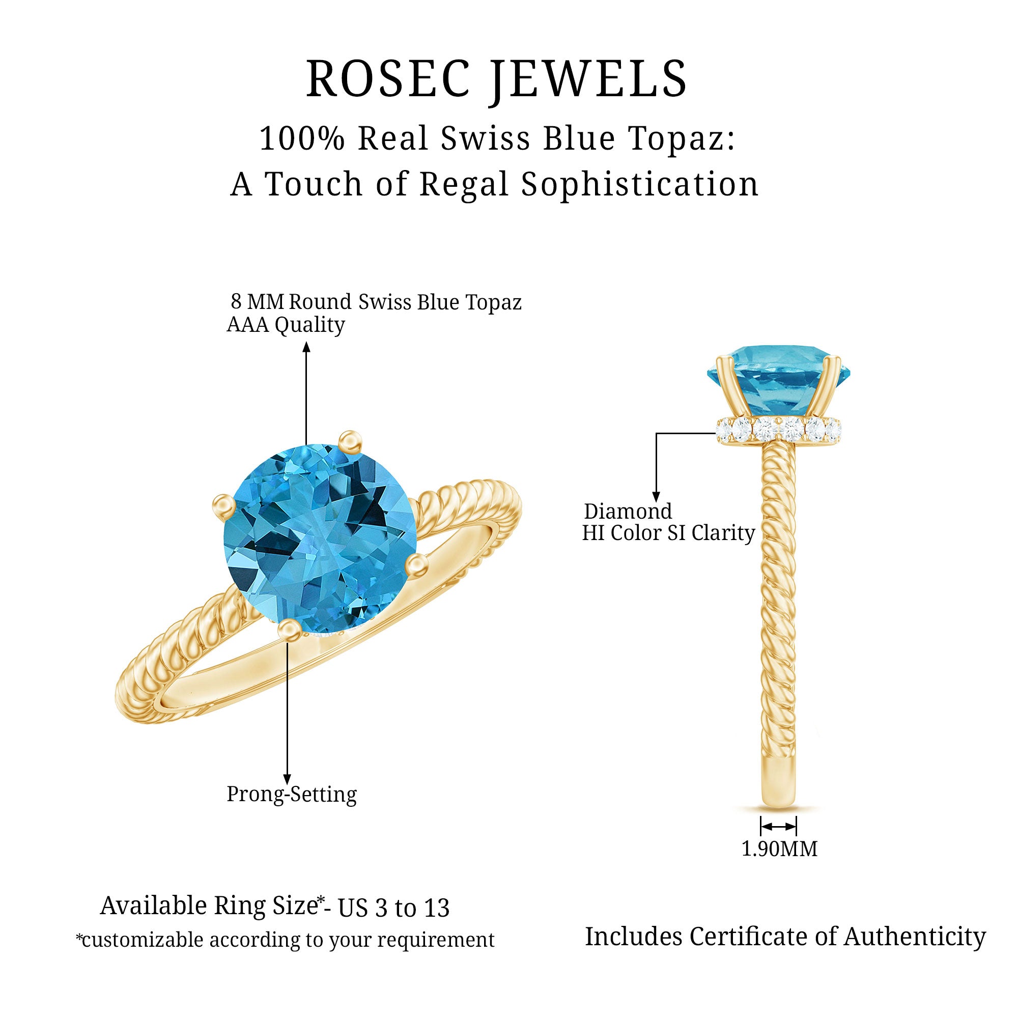 Get this mesmerizingly beautiful ring and gift this to your lady love and make her day even more special. This Solitaire Ring is adorned with Round Shape Swiss Blue Topaz Gemstone set as a Solitaire in Prong Setting over Twisted Rope Frame and also decorated with Hidden Halo Diamond.