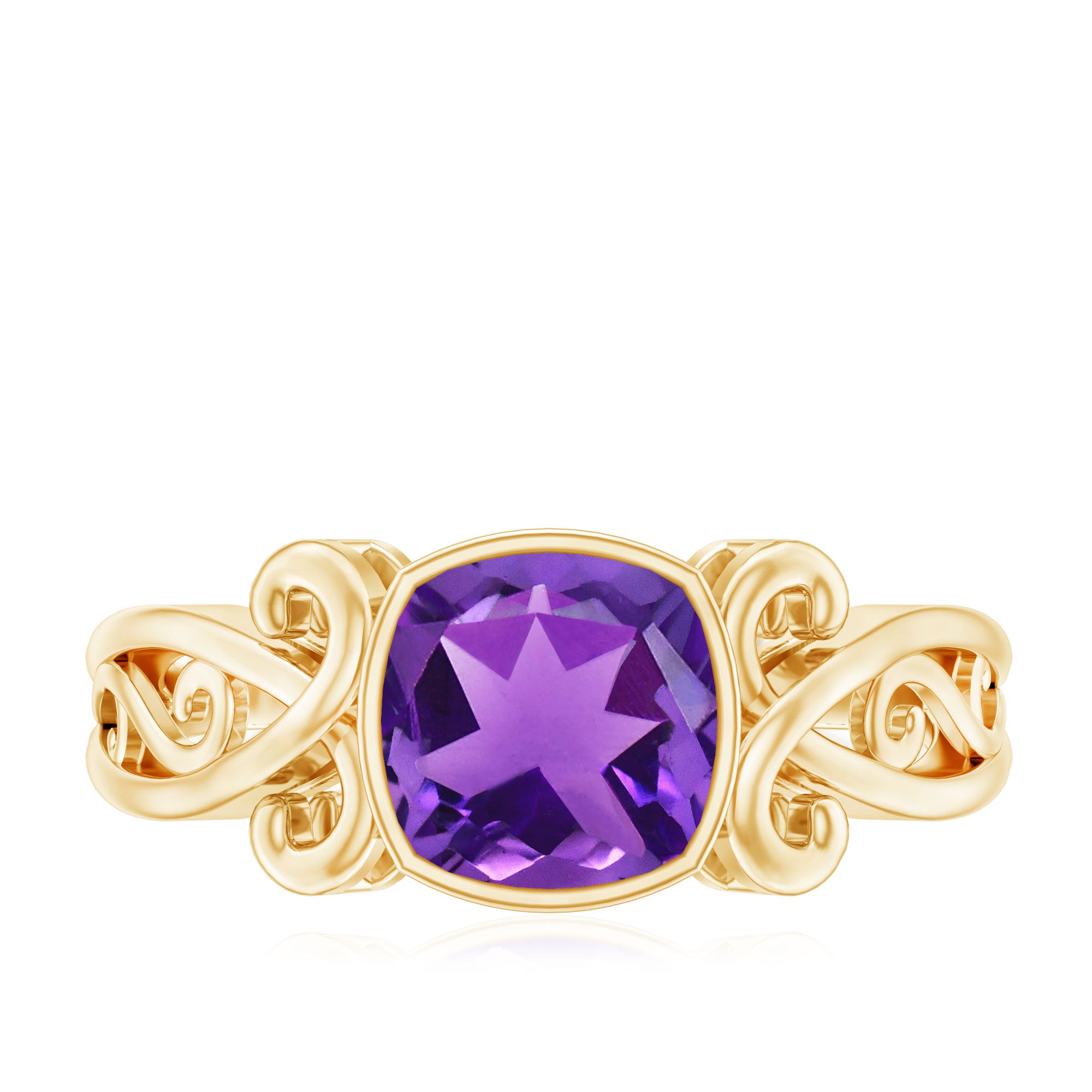 Featuring a charming gold mount, this Cushion Solitaire Ring is an exquisite piece of jewelry. The ring boasts a dazzling Cushion Cut Amethyst that is set in a bezel setting, creating a stunning solitaire design. The gold vintage design further adds to its magnificence. Give your special lady the gift of elegance with this gold bezel set amethyst ring this valentines.