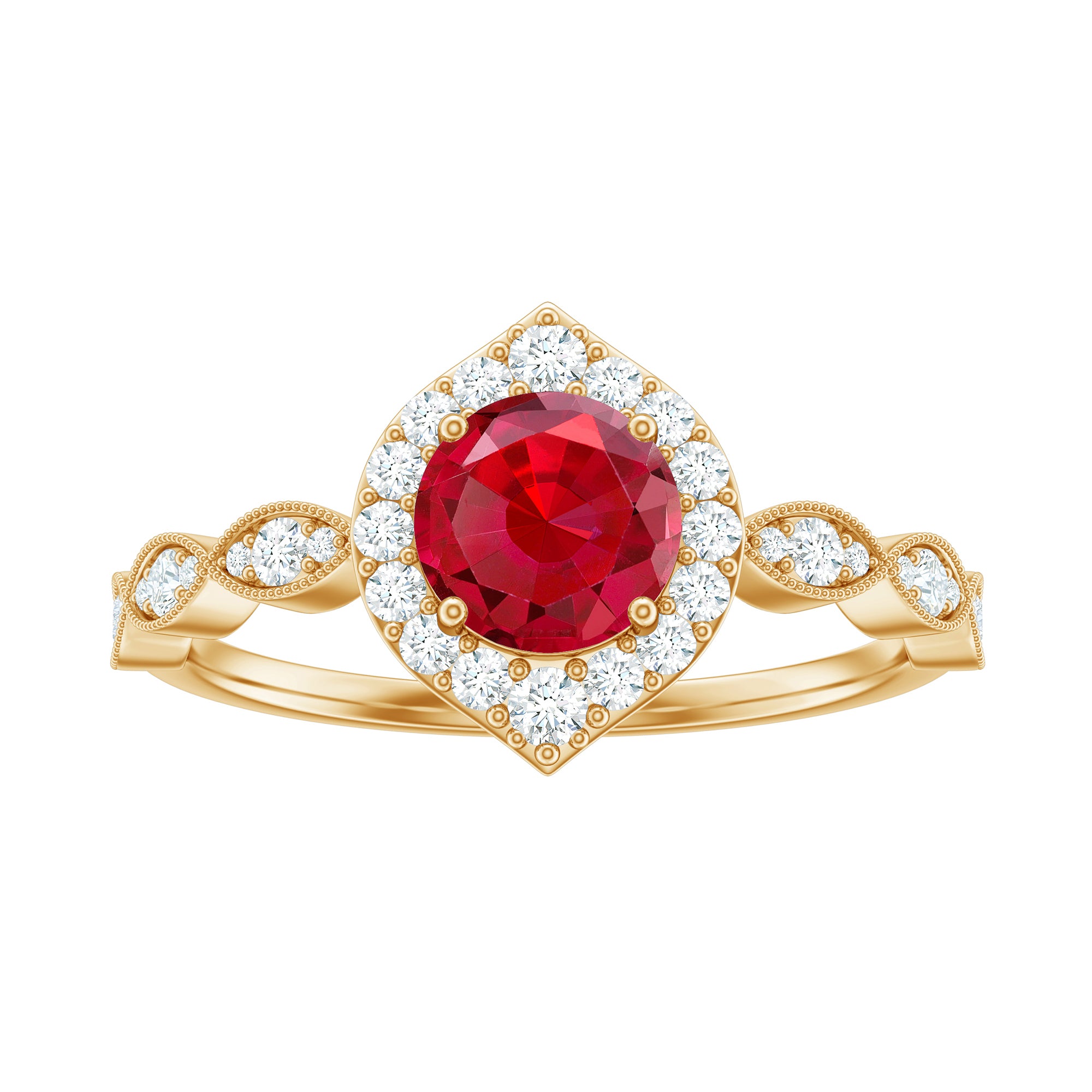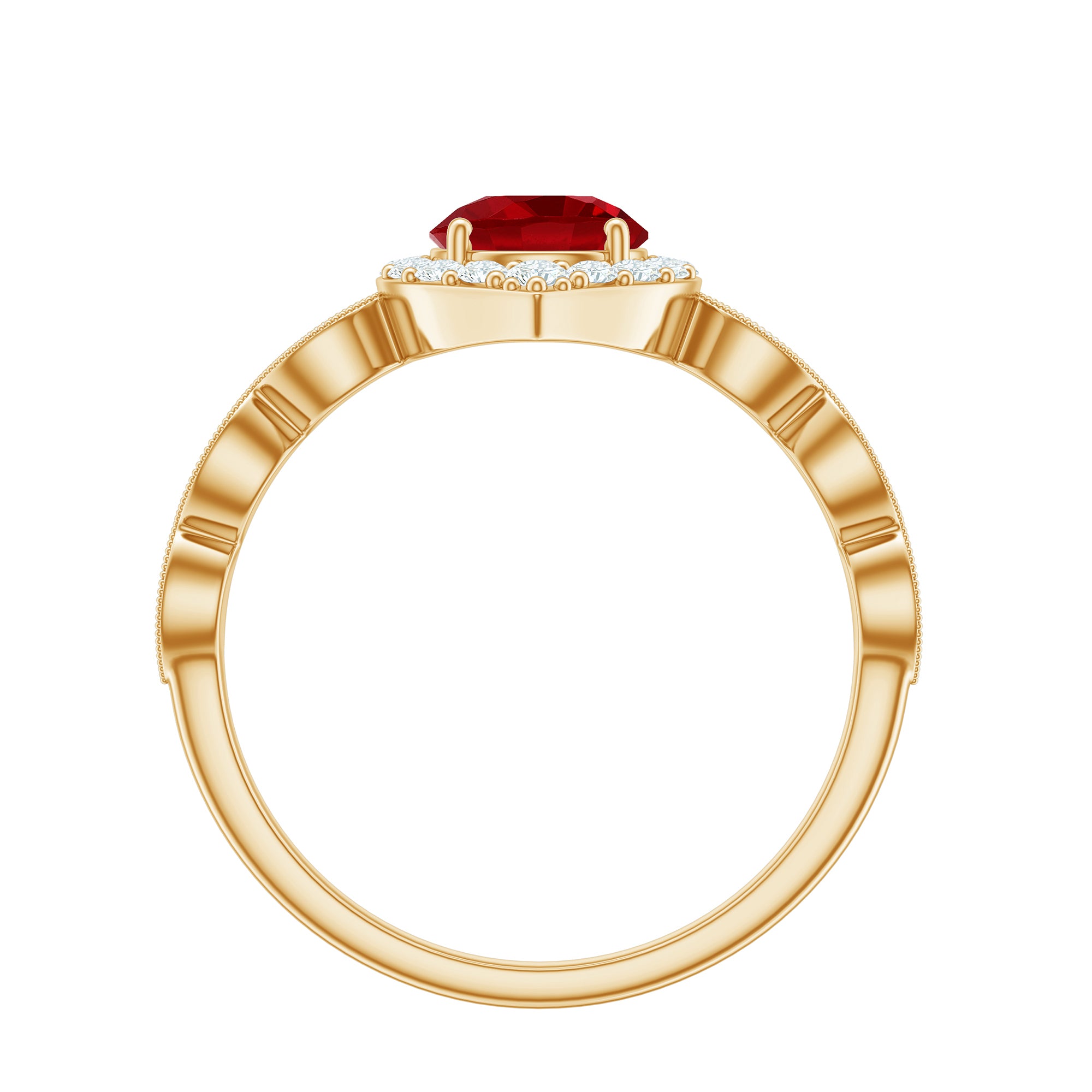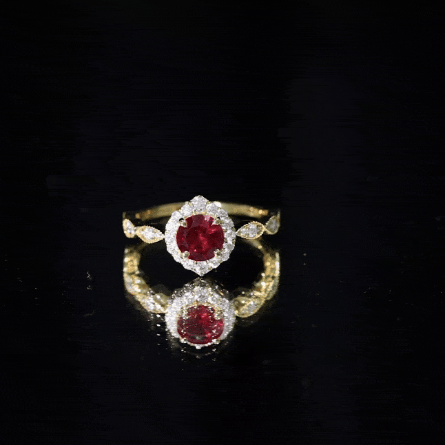 This beautiful Vintage Lab Created Ruby and Moissanite Ring features a round-cut created ruby in a prong setting with moissanite accents. Made of solid gold, it is a gorgeous piece of jewelry that she will love wearing all day long. Present this ring and watch her heart skip a beat.