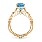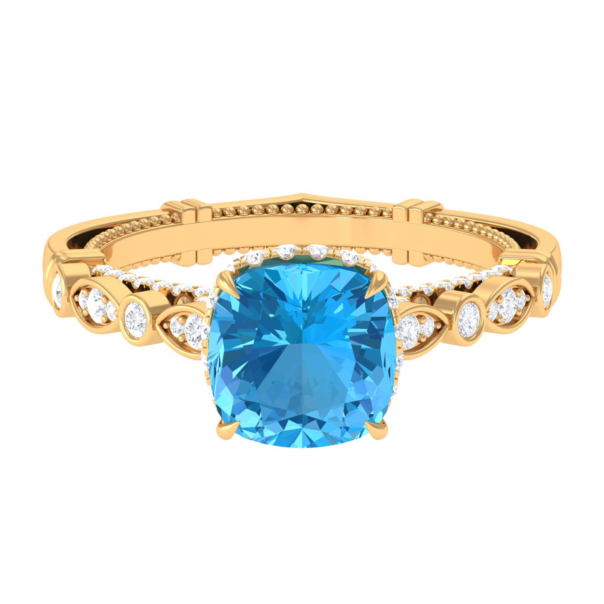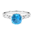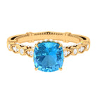 It is an Antique Engagement Ring for Women, adorned in Gold and features a Cushion Cut Swiss Blue Topaz embellished in Claw Setting with Round Brilliant Moissanite embellished in Prong Setting.