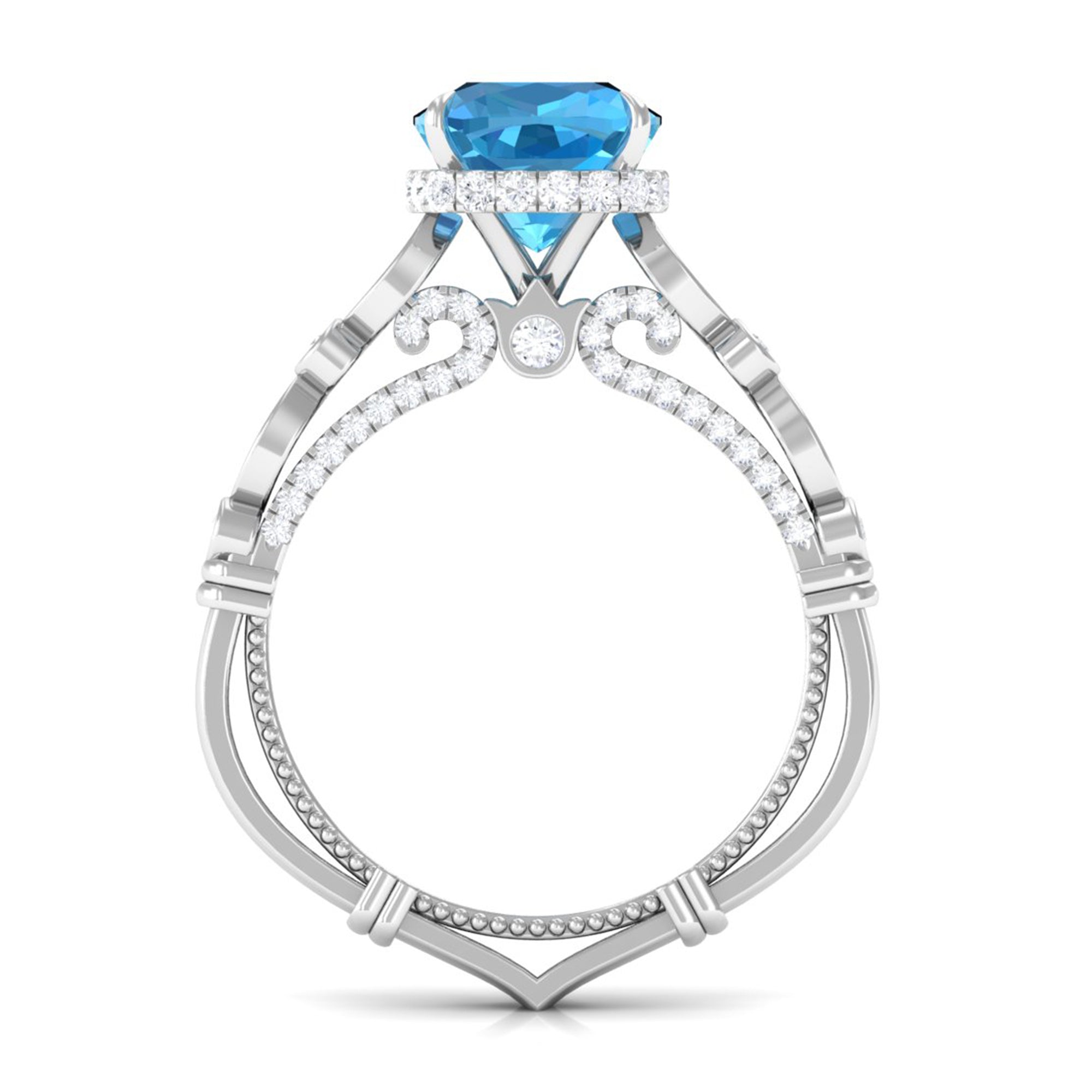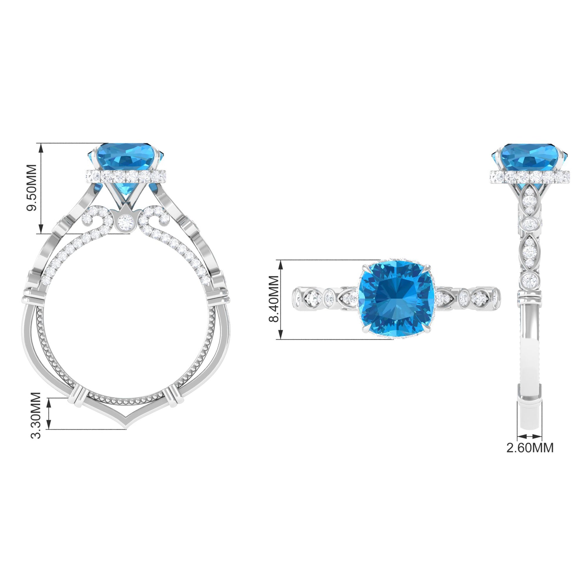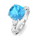 3.25 CT Cushion Cut Swiss Blue Topaz Solitaire and Moissanite Side Stone Ring