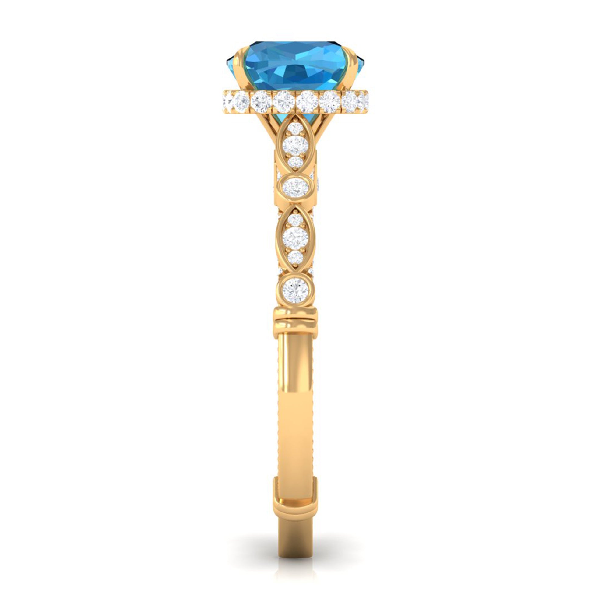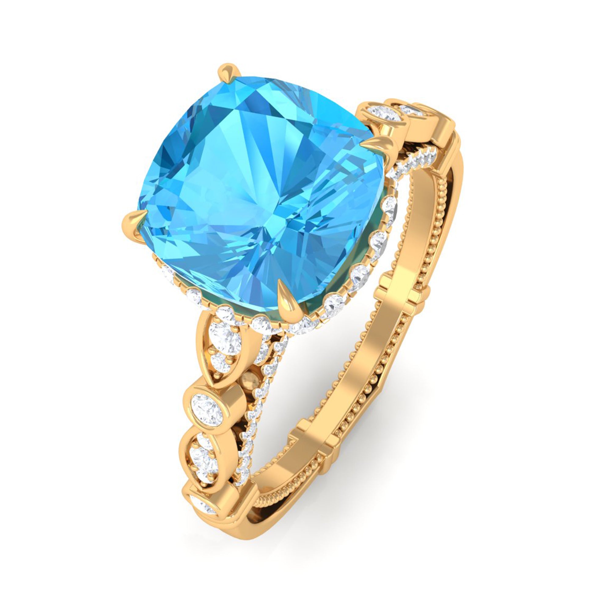 It is an Antique Engagement Ring for Women, adorned in Gold and features a Cushion Cut Swiss Blue Topaz embellished in Claw Setting with Round Brilliant Moissanite embellished in Prong Setting.