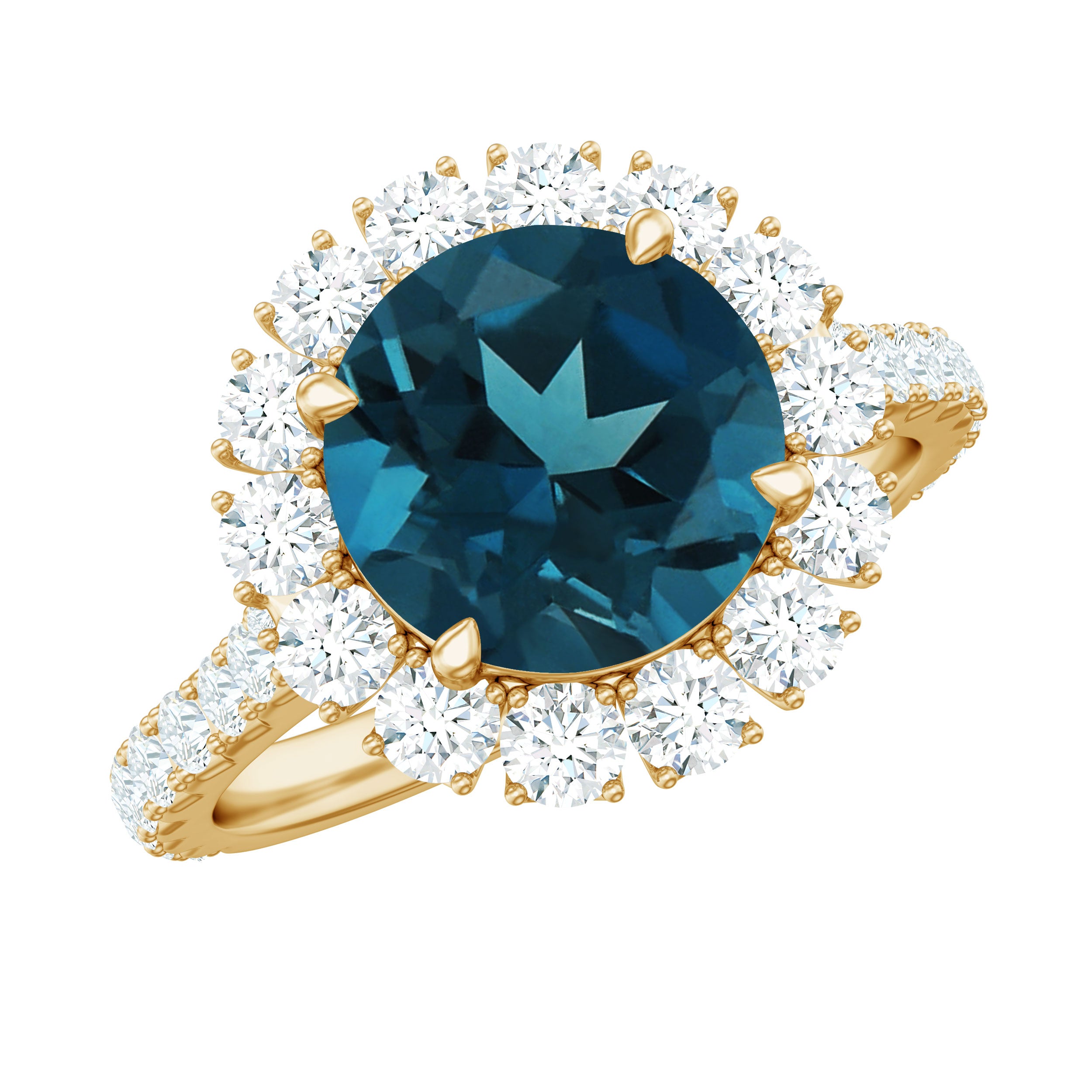 Express your affection with the highest level of sophistication by offering this exquisite London Blue Topaz Engagement Ring. The Round Cut London Blue Topaz is the focal point, radiating a mesmerizing color that will surely make hearts race with joy. The Moissanite Floating Halo encircling the blue topaz contributes an enchanting brilliance, producing a stunning contrast. This Halo Engagement Ring elegantly merges traditional and contemporary styles, serving as an ideal emblem of your love and dedication. With its captivating allure, this Real London Blue Topaz Ring is destined to win the heart of your beloved and forge a memorable occasion. London Blue Topaz is a unique gemstone, recognized as the birthstone for the month of December. This Round Engagement Ring is ideal for various occasions, including engagements, weddings, birthdays, and festive events. Its bold yet sophisticated design also renders it a lovely option for daily wear, enhancing any outfit with a touch of elegance. Whether you wish to commemorate a significant occasion or express your love and commitment, this Blue Topaz Halo Ring is certain to leave a lasting impression. It merges timeless sophistication with meaningful symbolism, making it a cherished item for anyone who adorns it. Featuring certified AAA quality london blue topaz and D-VS1 quality genuine moissanites, this Womens Engagement Ring presents both aesthetic appeal and significance in a single exquisite design.