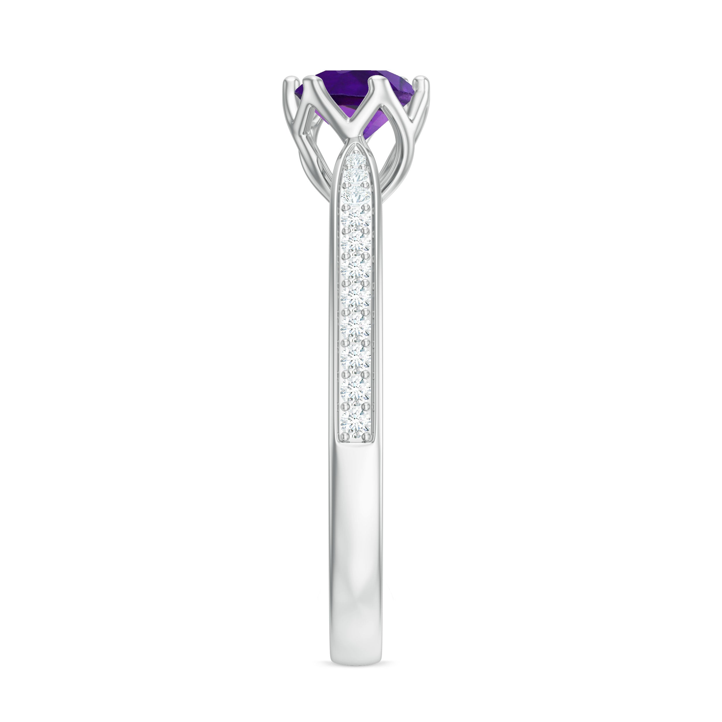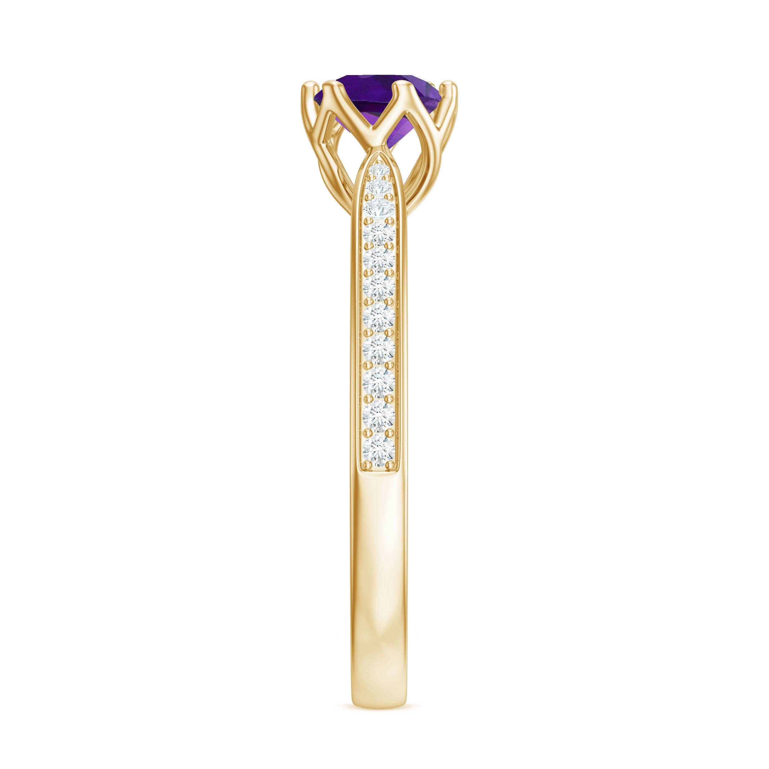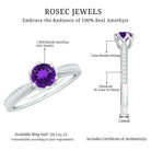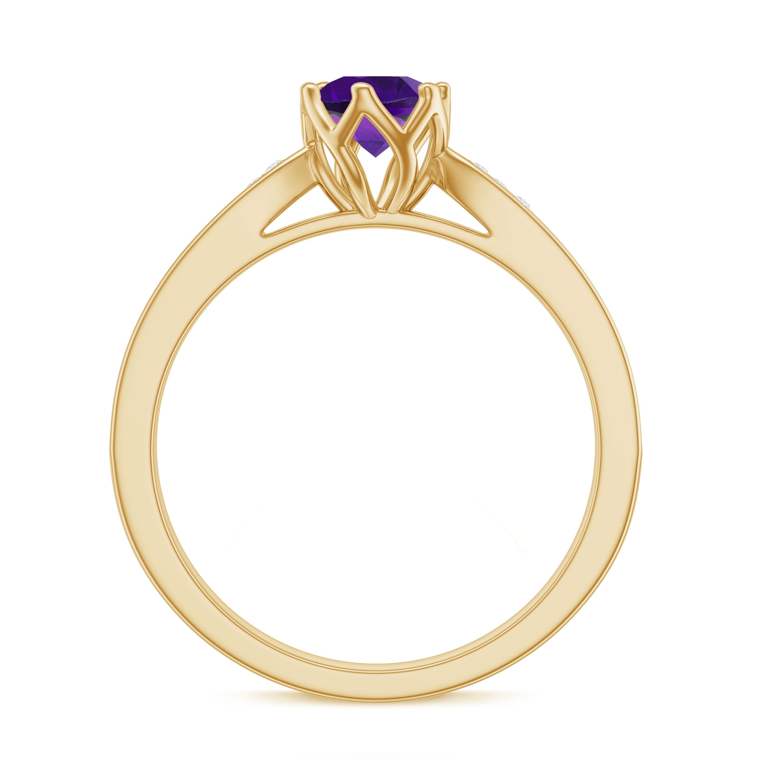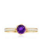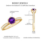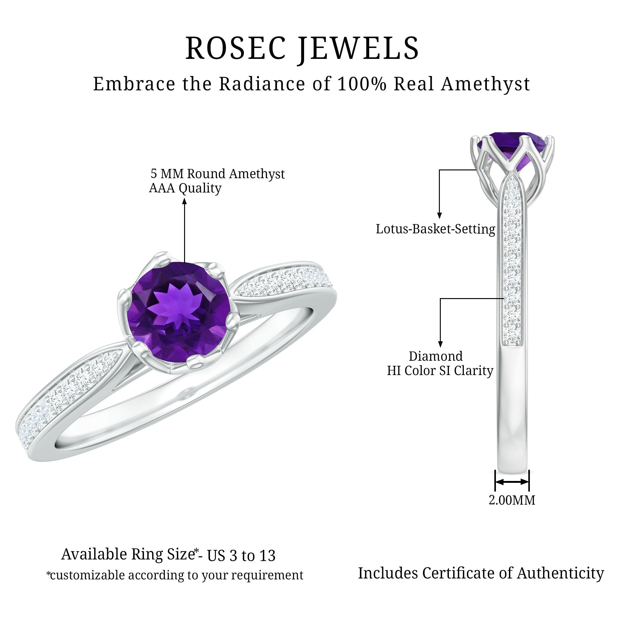 Solitaire Engagement Ring is encased with 5 MM Round Shape Amethyst as Solitaire and Round Diamond stones set as Accents. This Engagement Ring is composed of Solid Gold in Prong Setting. Perfect Wedding Anniversary Gift for Women.