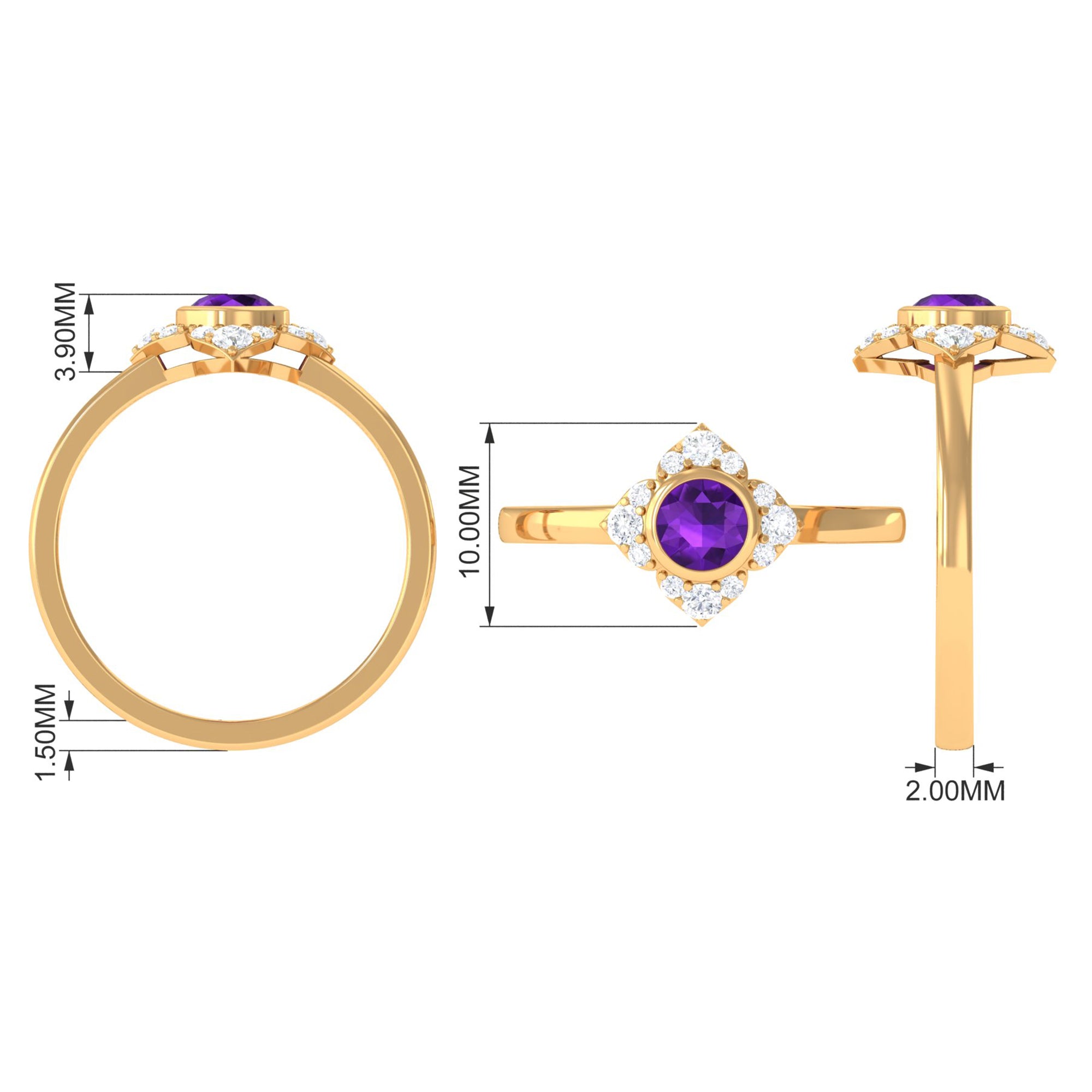 Surprise your special someone with the Floral Halo Engagement Ring, a stunning jewelry piece that is sure to capture her heart. This exquisite Flower Engagement Ring showcases a dazzling round-cut Amethyst stone set in a secure bezel setting, nestled within a beautiful floral petal design. The Amethyst stone is surrounded by a sparkling halo of round-cut Diamond, adding a touch of glamour and sophistication to this magnificent Ring. Expertly crafted from premium gold metal, this Amethyst Engagement Ring is sure to withstand the test of time. Give the gift of timeless elegance with this gorgeous Floral Halo Engagement Ring.