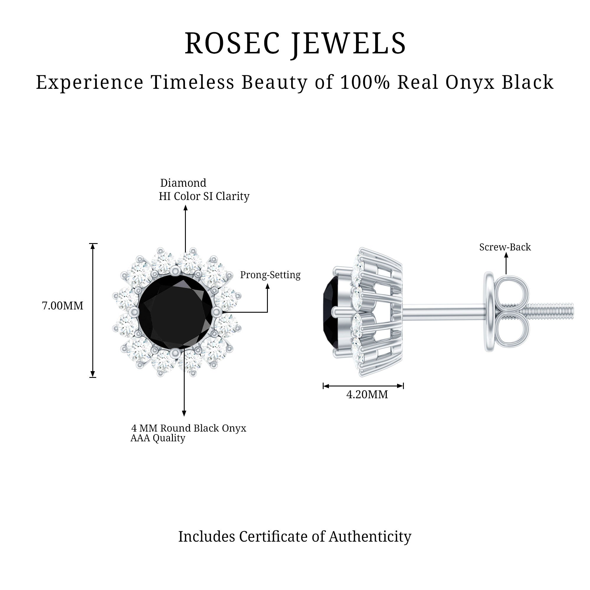 Enhance your look with our timeless Halo Earrings, perfect for any occasion. These Onyx Earrings are crafted to last a lifetime and adorned with a stunning Round Shape Black Onyx centerpiece surrounded by a halo of sparkling Round Shape Diamond stones. With a Screw Back Closure, these Stud Earrings will stay securely in place. Whether you choose to wear them with your casual or formal outfits, these Stud Earrings are sure to leave a lasting impression on everyone around you. They also make a great birthday gift for your loved one.