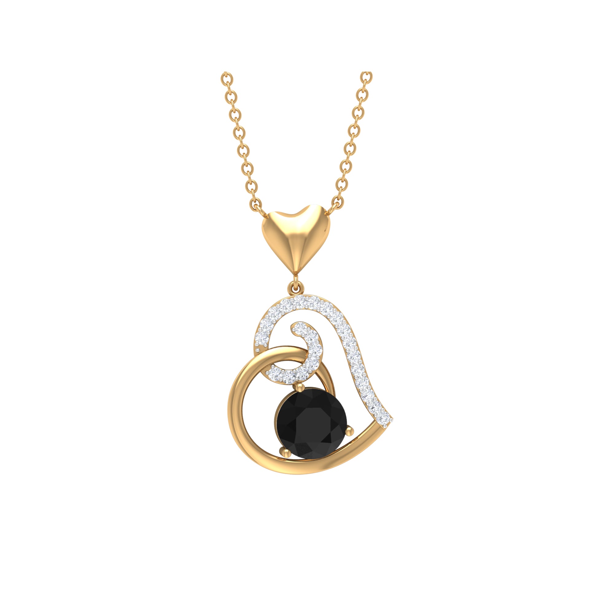 Be Dazzle with these beautiful Heart Drop Pendant embellished with Round Shape Black Onyx as Solitaire in 3 Prong Setting and Round Shape Diamond in Prong Setting, Crafted in Solid Gold.