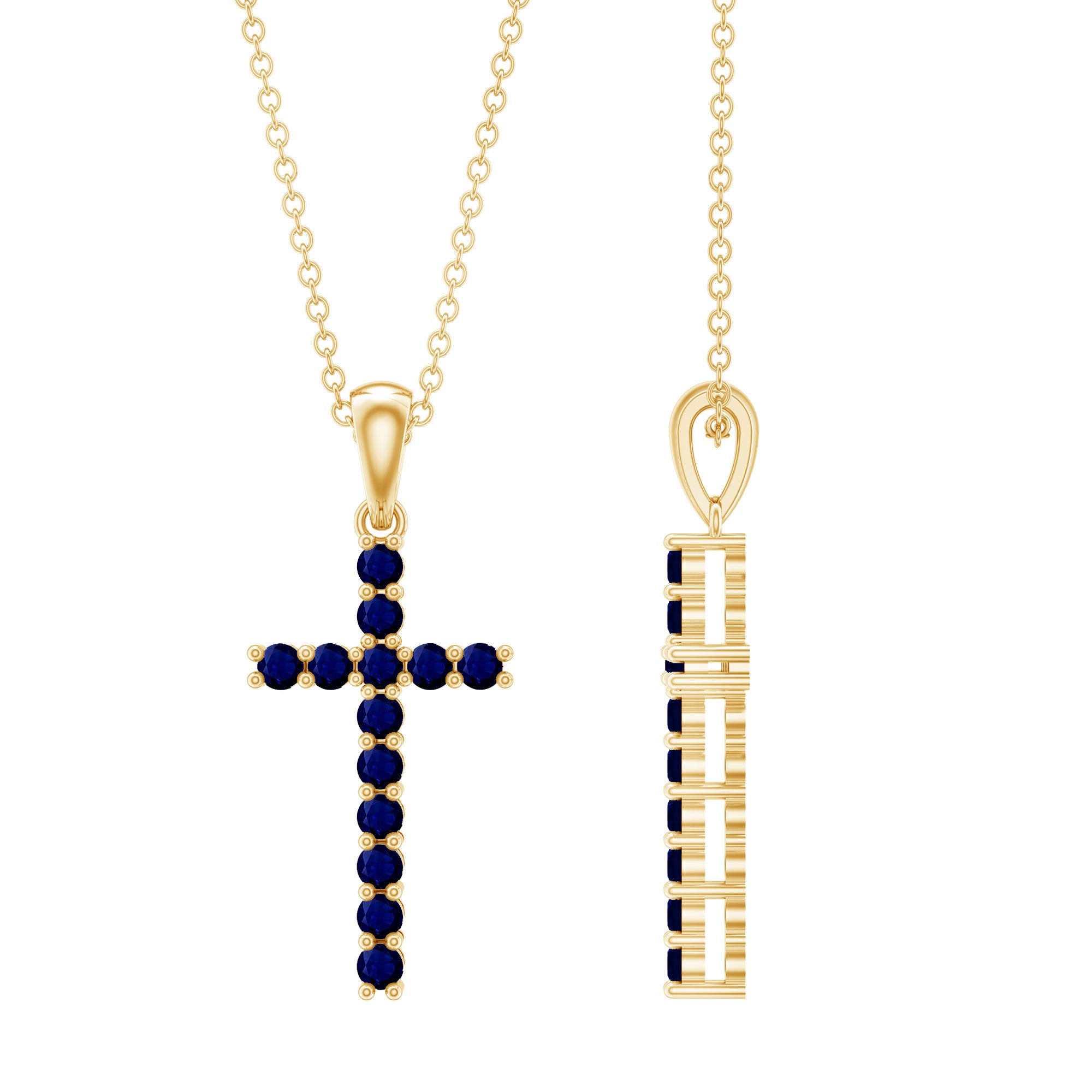 Faith and style come together beautifully in the Sapphire Cross Necklace. The Christian Pendant is curated with genuine round shaped blue sapphires of AAA quality, held securely in prong setting. The cross design represents a powerful symbol of faith and devotion, making it meaningful for anyone who holds their beliefs close to their heart. Designed as a minimal and stackable charm, the Blue Sapphire Pendant suits all genders and ages, allowing anyone to wear it with pride and comfort. It can be worn alone for a simple look or layered with other necklaces to create a personalized style. The Religious Necklace hangs from a delicate cable chain attached by a sturdy bail, ensuring it stays in place throughout the day. Crafted with care, this Cross Locket offers both spiritual significance and fashionable appeal, making it popular not only among those devoted to their faith but also among trendsetters who appreciate meaningful jewelry. Coming in a beautiful jewelry box along with a certificate of authenticity, this Blue Sapphire Cross Pendant makes a thoughtful gift for special occasions or a treasured addition to your own collection.