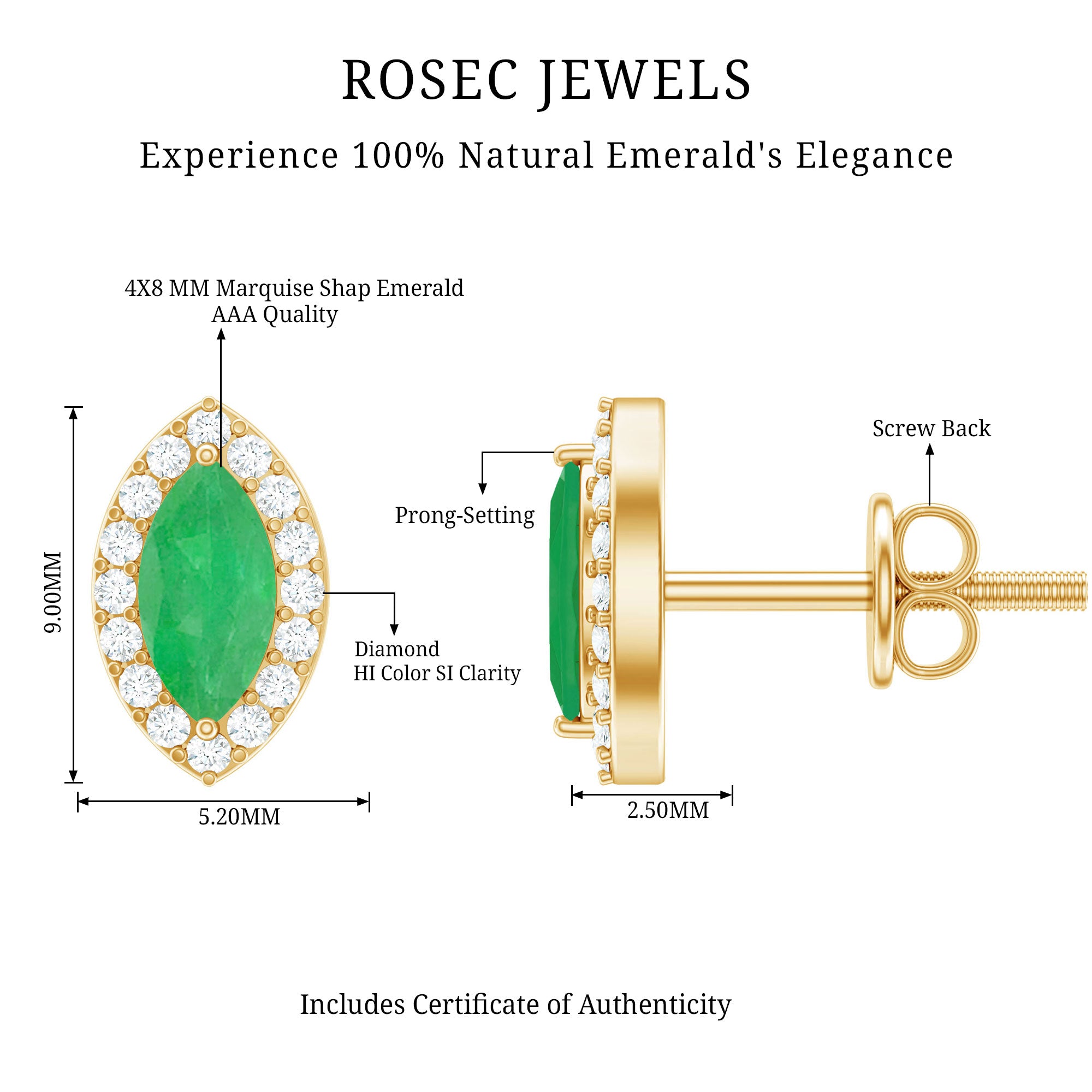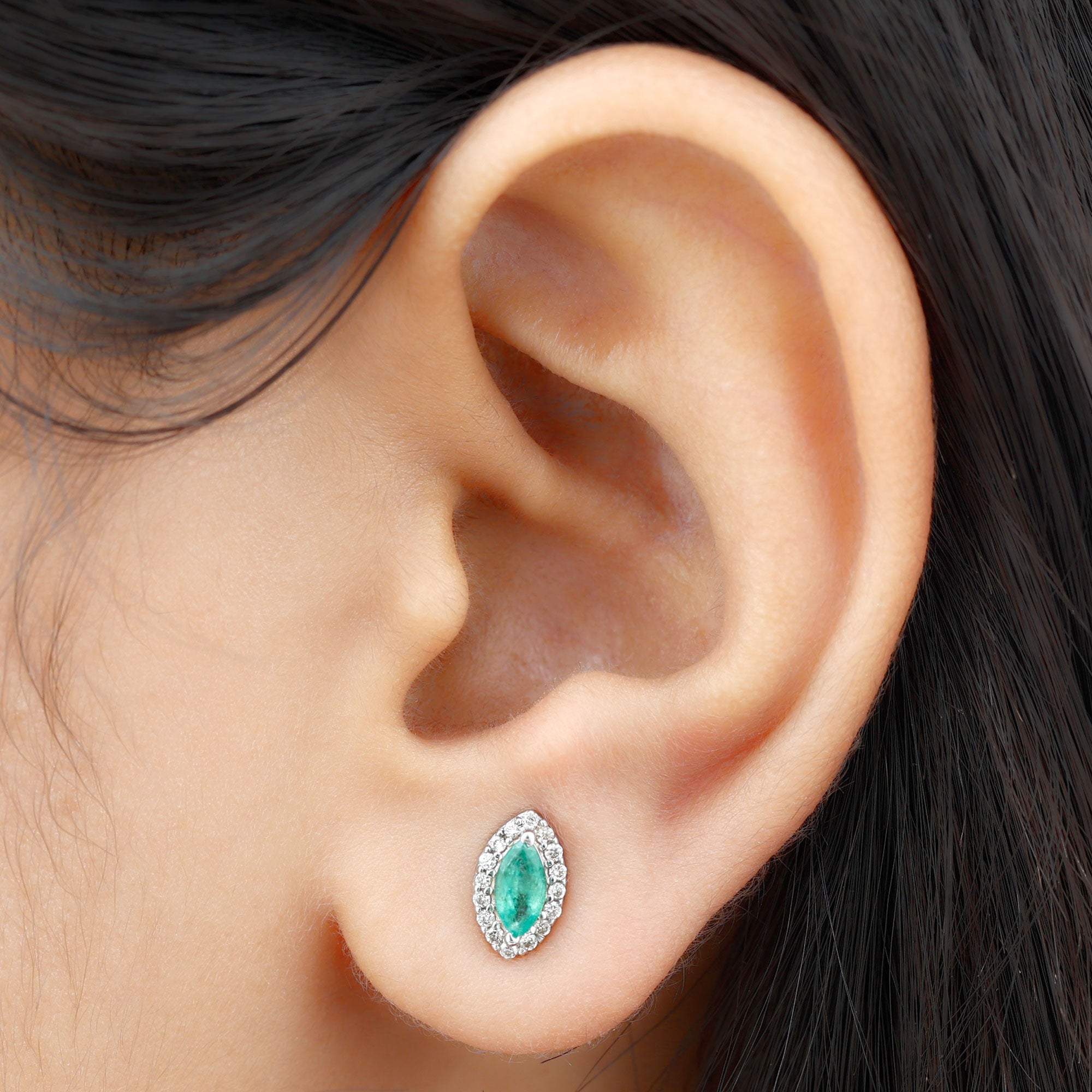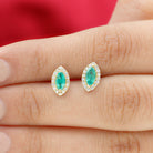 Flaunt your style with these beautiful Diamond Accent Stud Earrings. These are embellished with 3X6 MM Marquise Cut Emerald in 2 Prong Setting as Center Stone, Diamond Accent around Marquise Shape Emerald and Solid Gold composition make this pair of stud earring more Adorable.