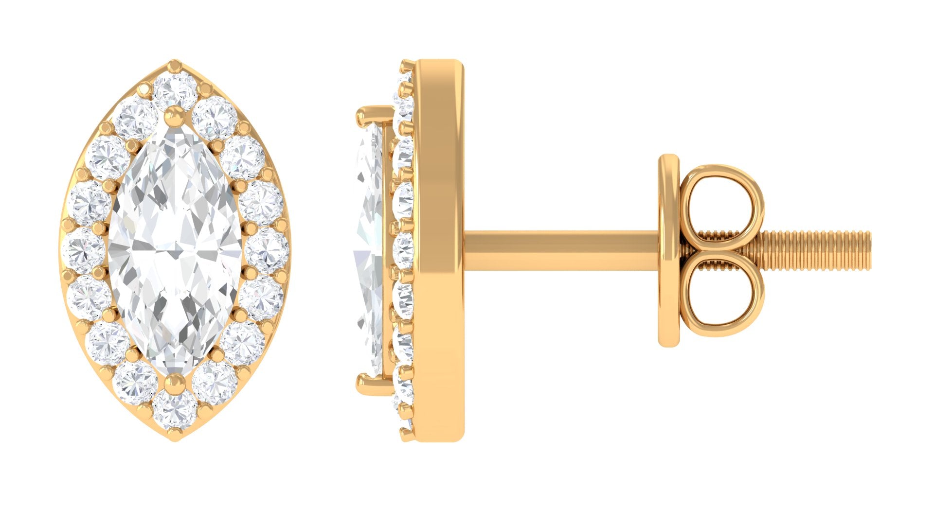 Show off your individuality with these unique stud earrings featuring marquise-cut moissanite in an accent setting, surrounded by a halo of round-cut moissanite. Made with gold and featuring screw-back closures, these moissanite stud earrings are a must-have addition to any jewelry collection.