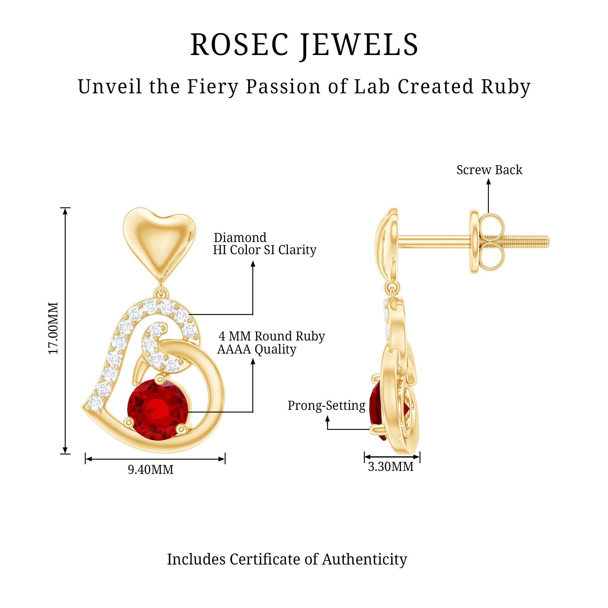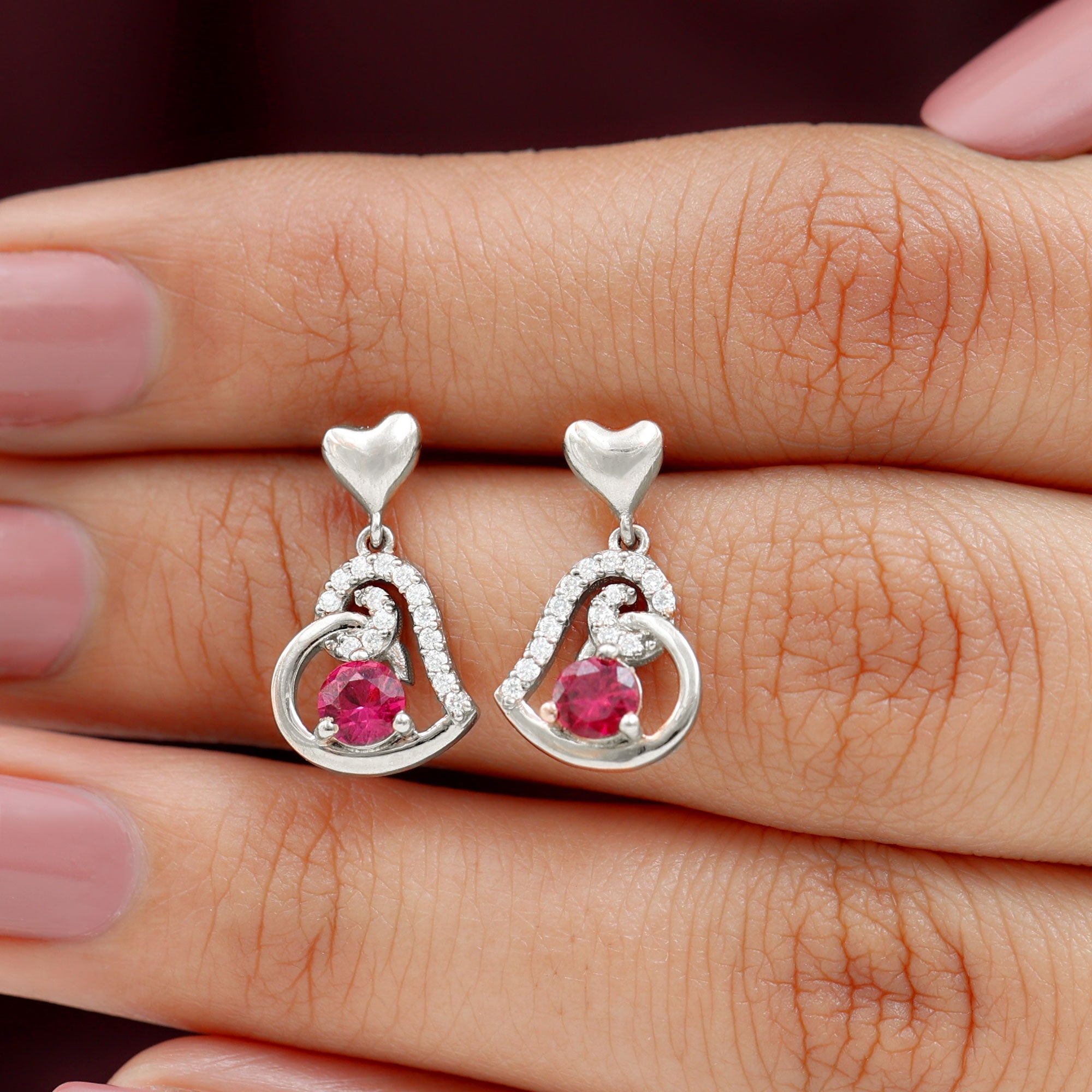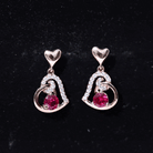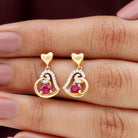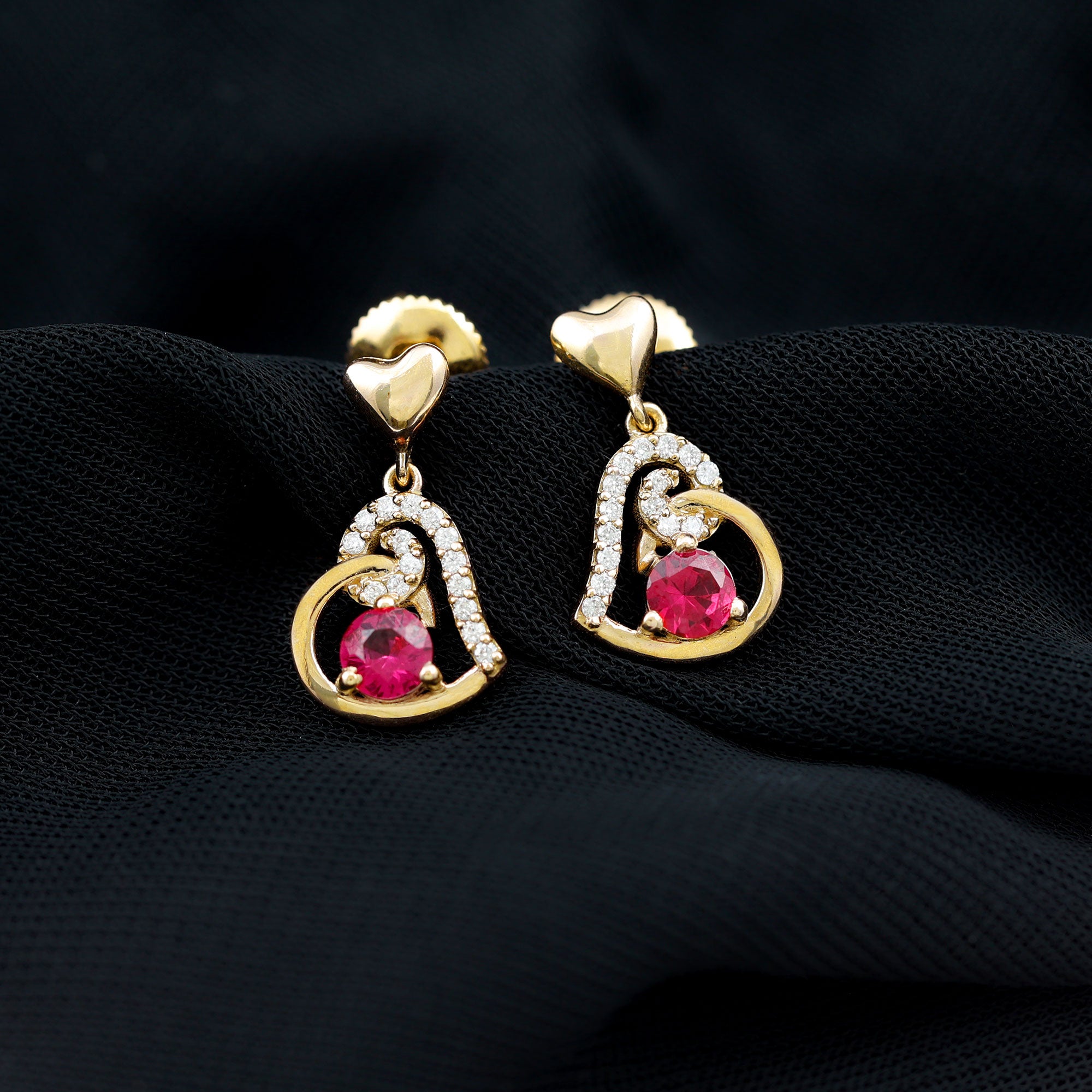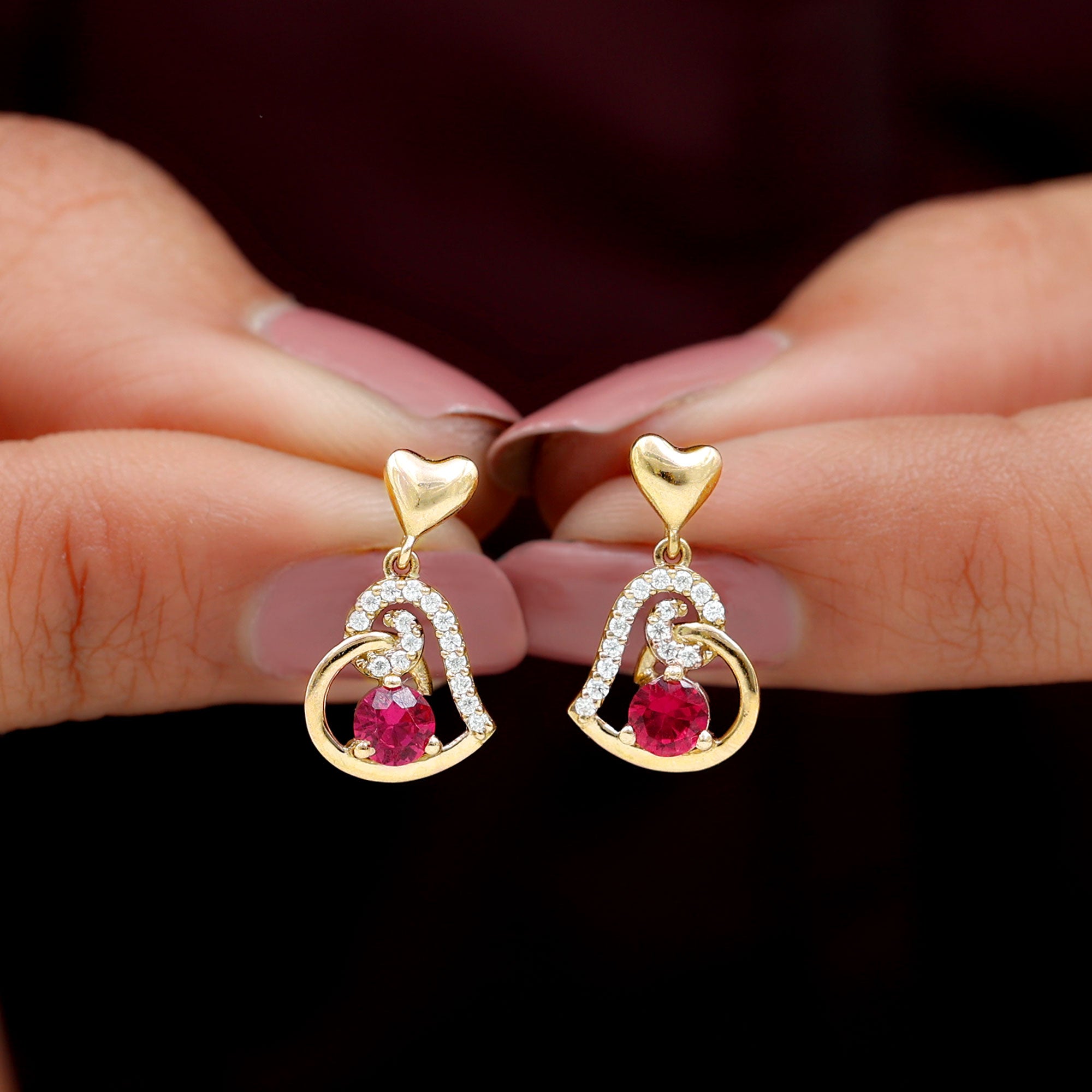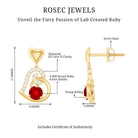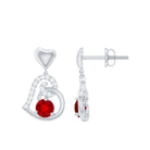 Be Dazzle and Flaunt your Style with these Unique Design Heart Drop Earrings. The Drop Earrings are embellished with Round Shape Created Ruby as Center Stone in 3 Prong Setting. Tiny Round Shape Diamond studded Beautifully on Solid Gold crafted Heart in Accent Setting that make it more Attractive.