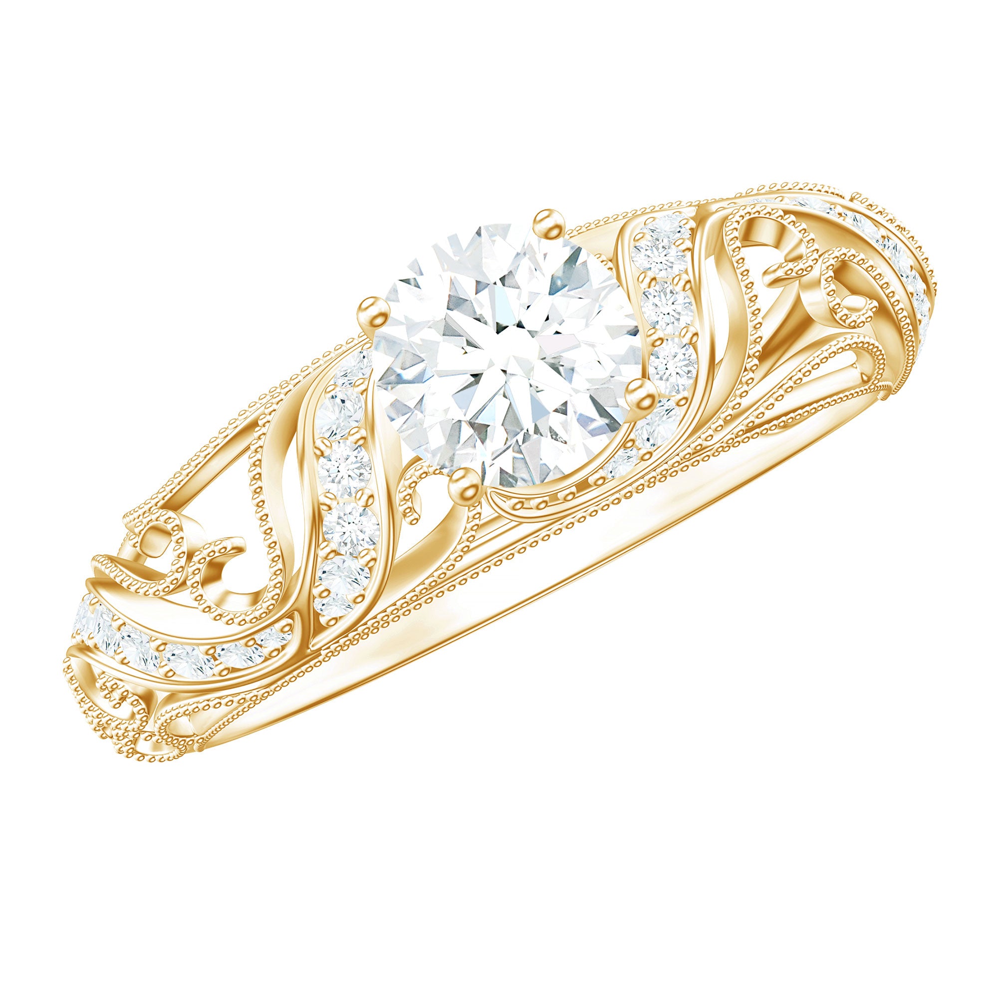 This striking quirky Zircon Ring will leave your jaw down. The 5 MM Round Cut Zirconia in Prong Setting with Beaded Details on Vintage Inspired Engagement Ring, evokes a sense of timeless elegance. So, bend down on your knee and propose to her with this mesmerizing CZ Engagement Ring Jewelry which surely she would admire her whole life. The ring carries a total weight of 3/4 Carat with the quality of AAAA Clarity. All our gemstones are certified and undergo a strict quality check.