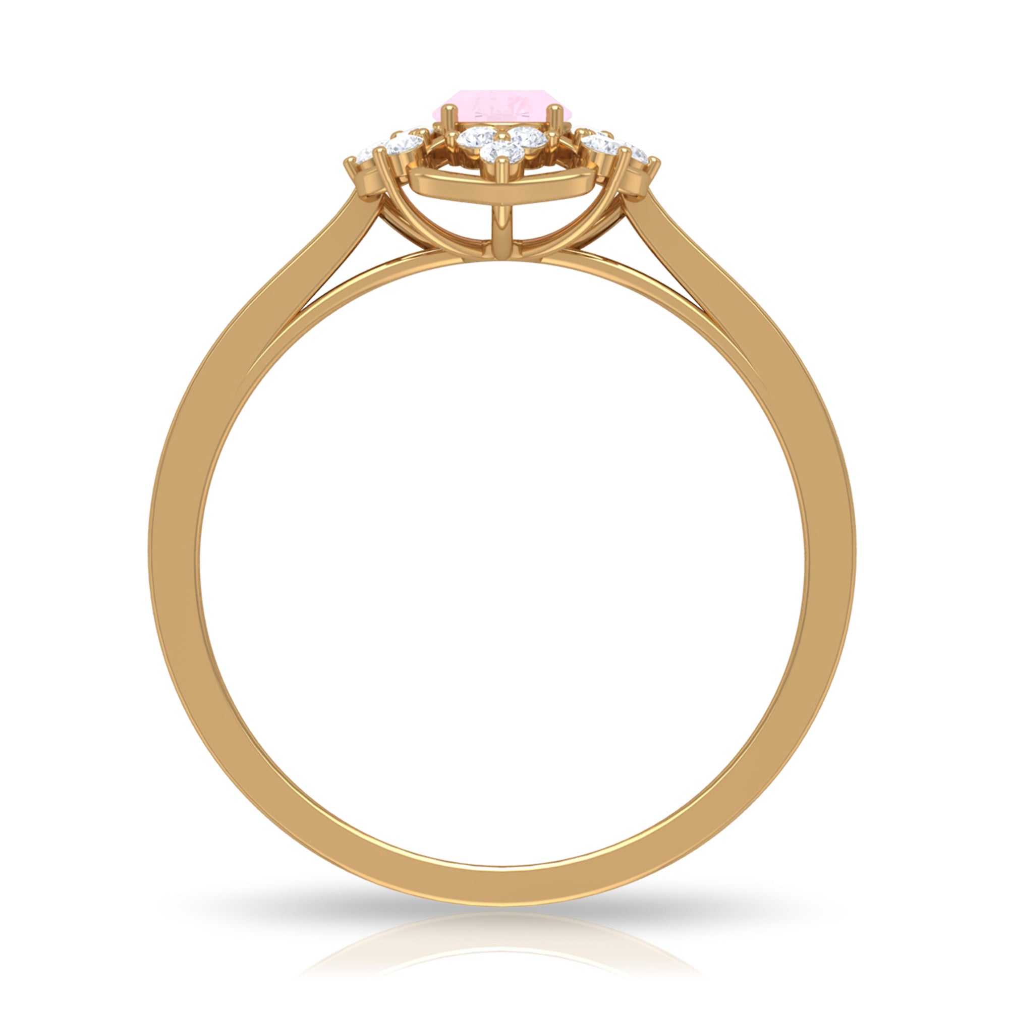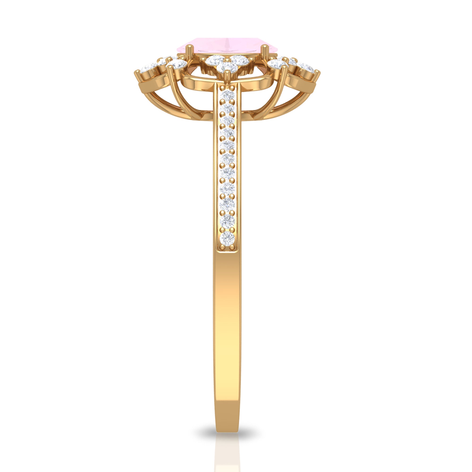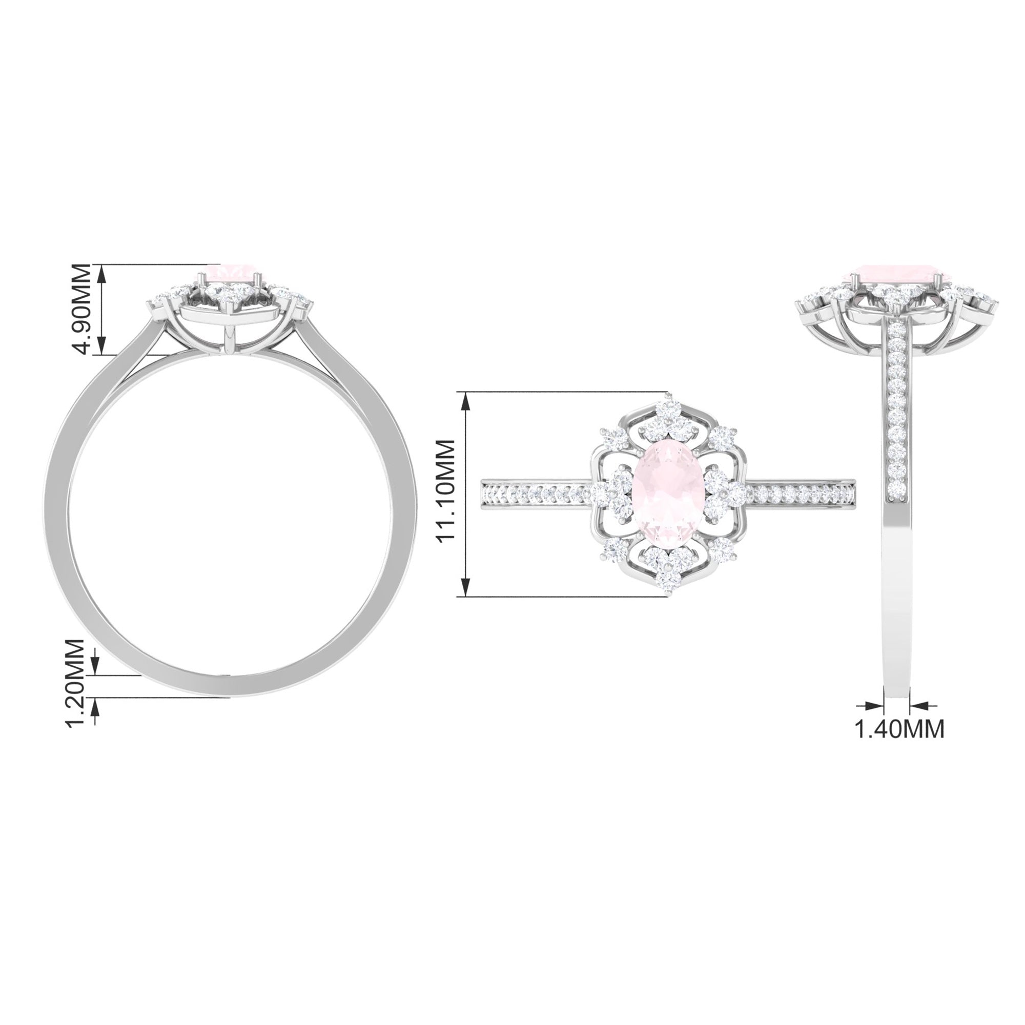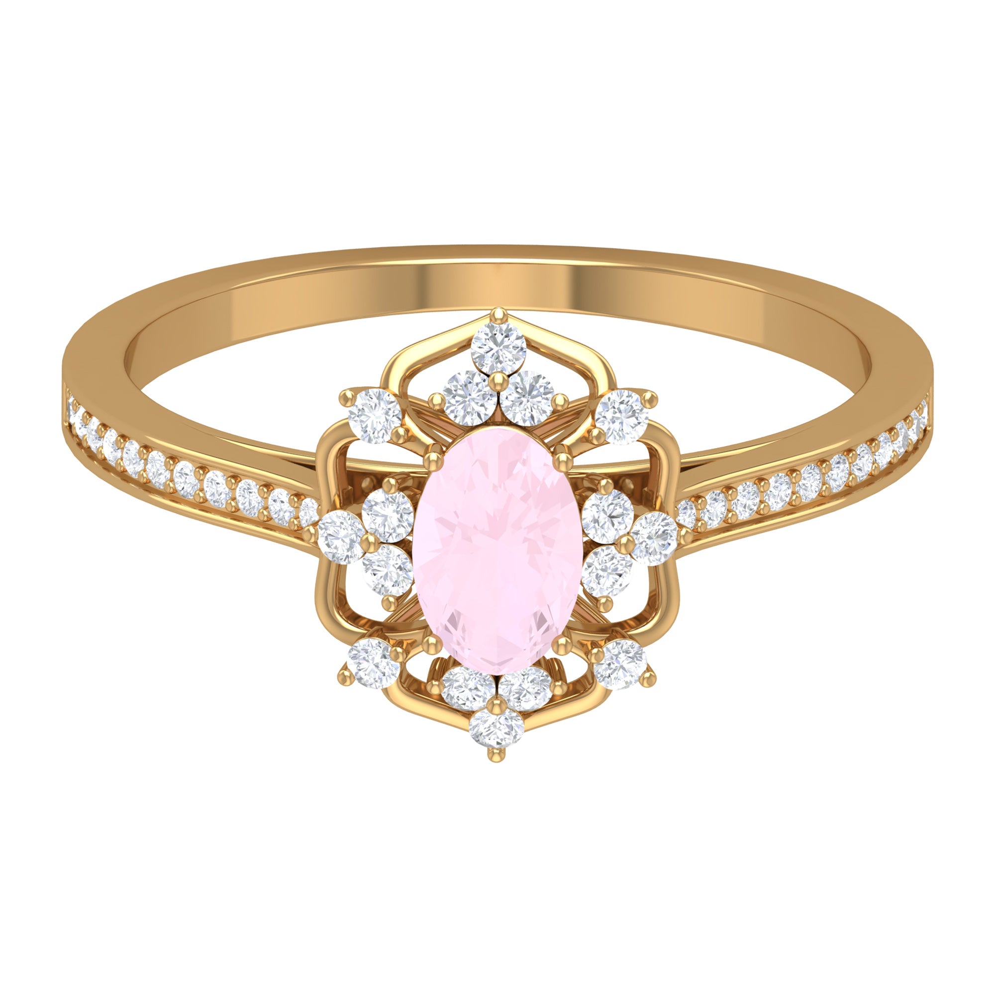 Intensify your look with this Engagement Ring is adorned with Oval Shape Rose Quartz set as a solitaire in a prong setting and Round Shape Diamond accent in a prong setting. This Estate Engagement Ring is mounted in solid gold.