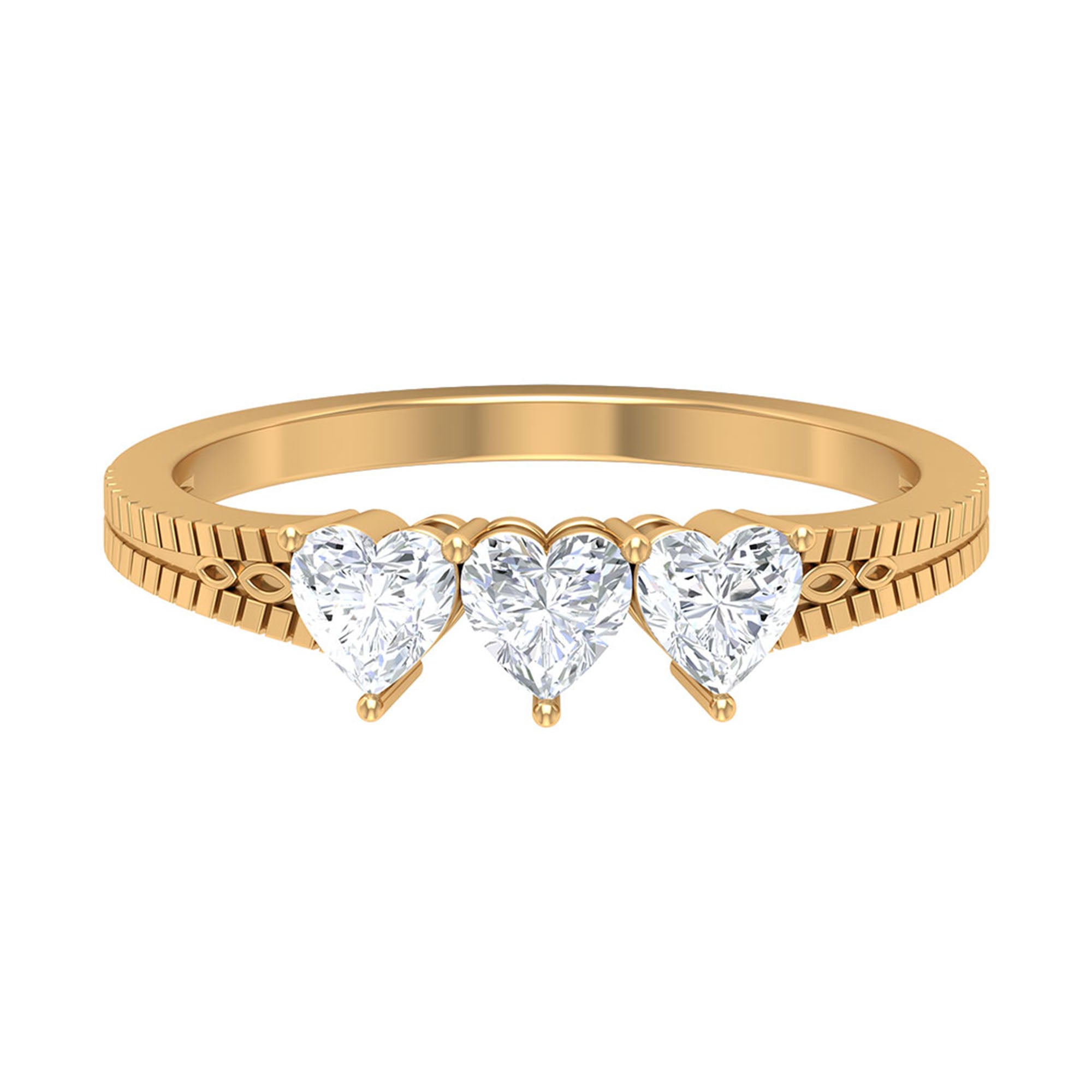 This Three Stone Promise Ring Has Heart Shape Zircon are set in Prong Setting with Carved Embellishment, crafted in Gold Metal. This CZ Promise Ring is a perfect way to begin a new chapter in your life and is a perfect piece to have.