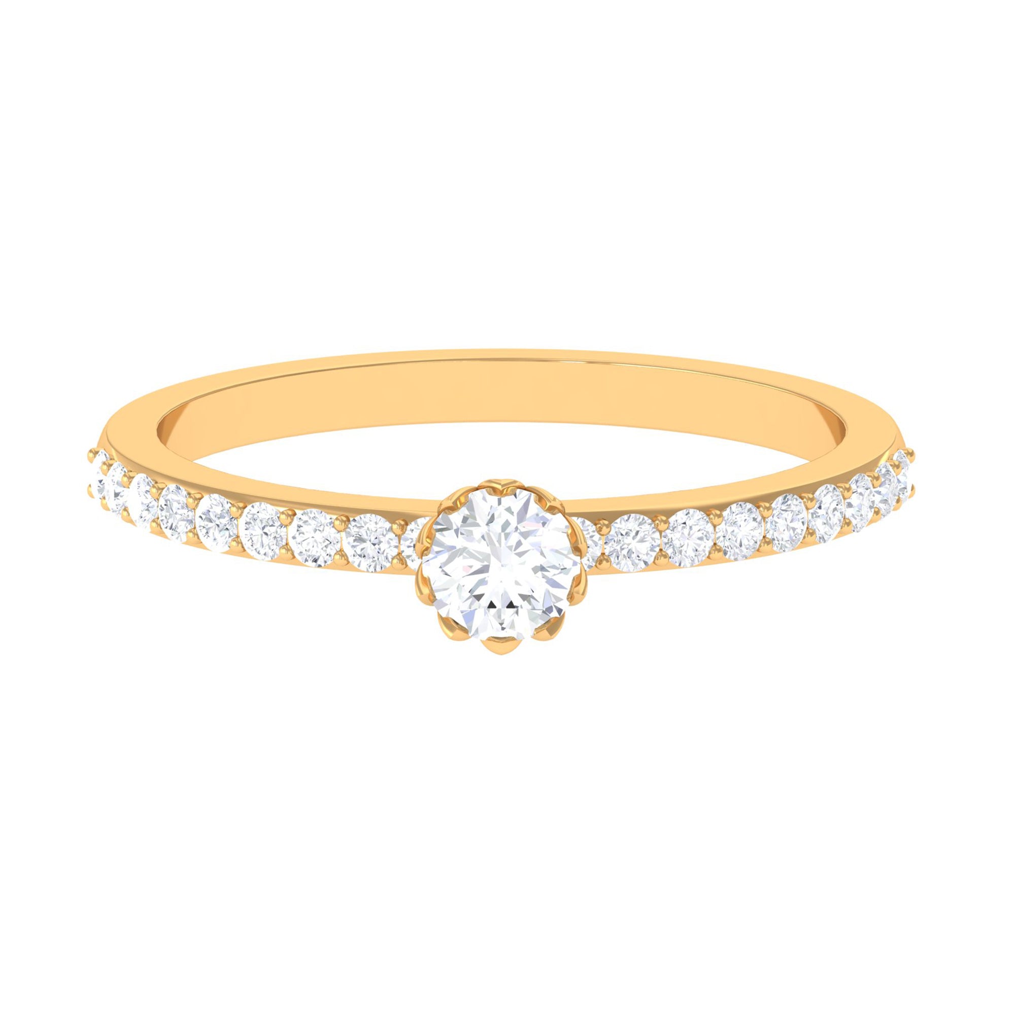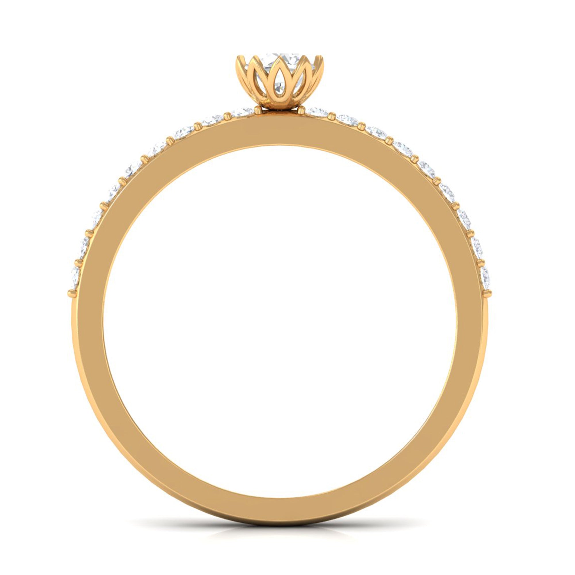 Connotation everlasting love, Zircon Solitaire Engagement Ring is captivatingly held in Lotus Basket Setting with Side Stones. The elegance of Simulated Diamond give a brilliance appeal to your occasions. Crafted in Gold, this Round Cubic Zirconia Ring is a timeless fine jewelry that every women love to wear.