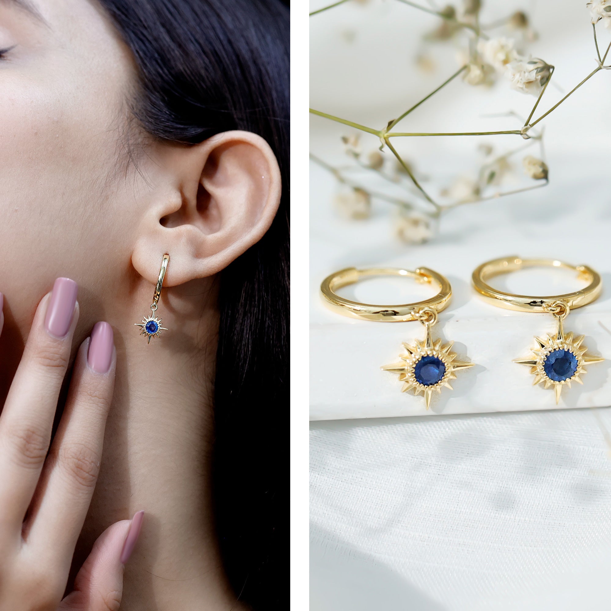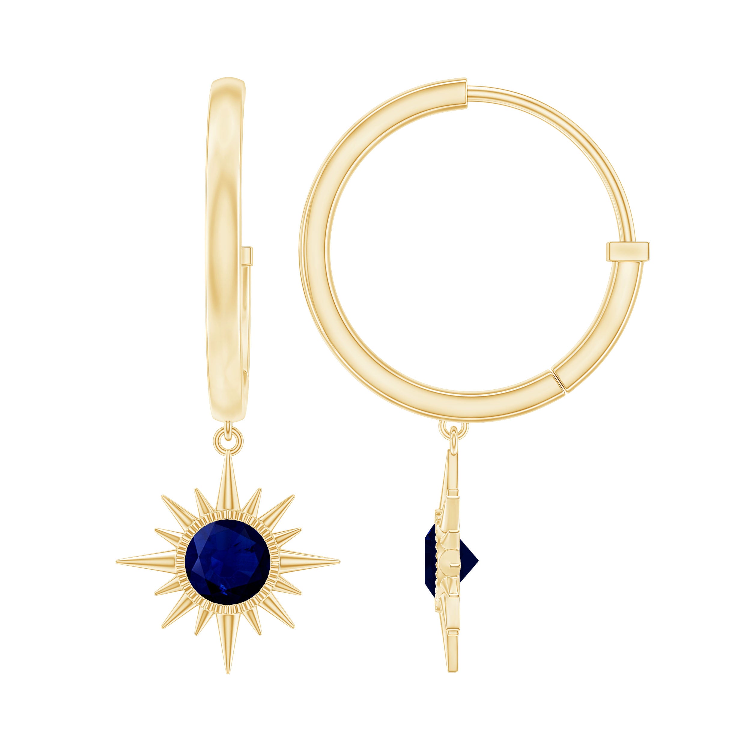 Flaunt with these beautiful Sunburst Drop Hoop Earrings adorned with Round Cut Blue Sapphire set in Milgrain Bezel Setting. These Stud Earrings are Composed of Solid Gold.