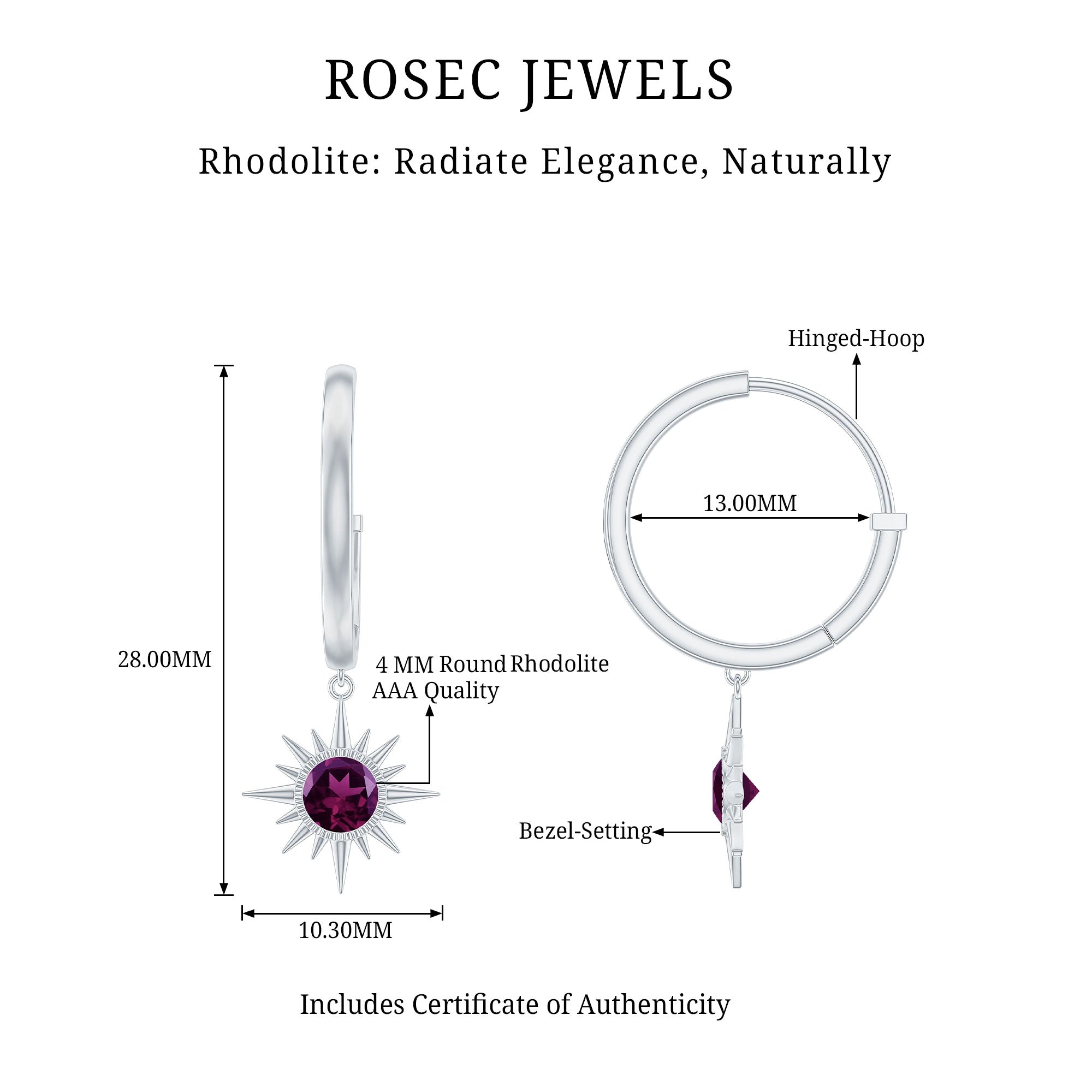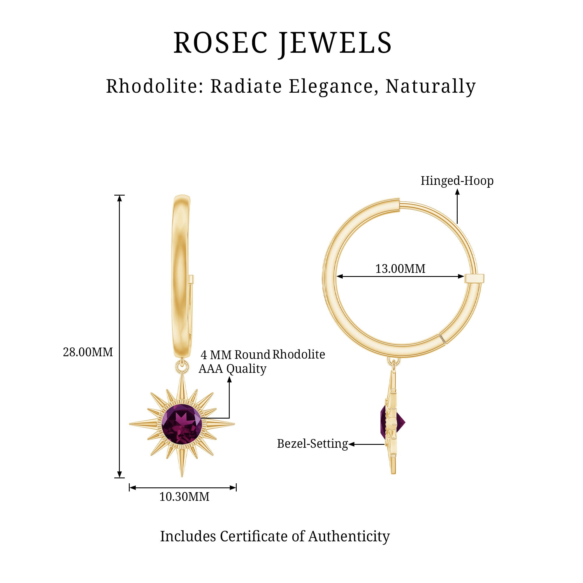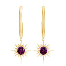 Flaunt with these beautiful Sunburst Drop Hoop Earrings adorned with Round Cut Rhodolite set in Milgrain Bezel Setting. These Stud Earrings are Composed of Solid Gold.