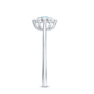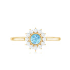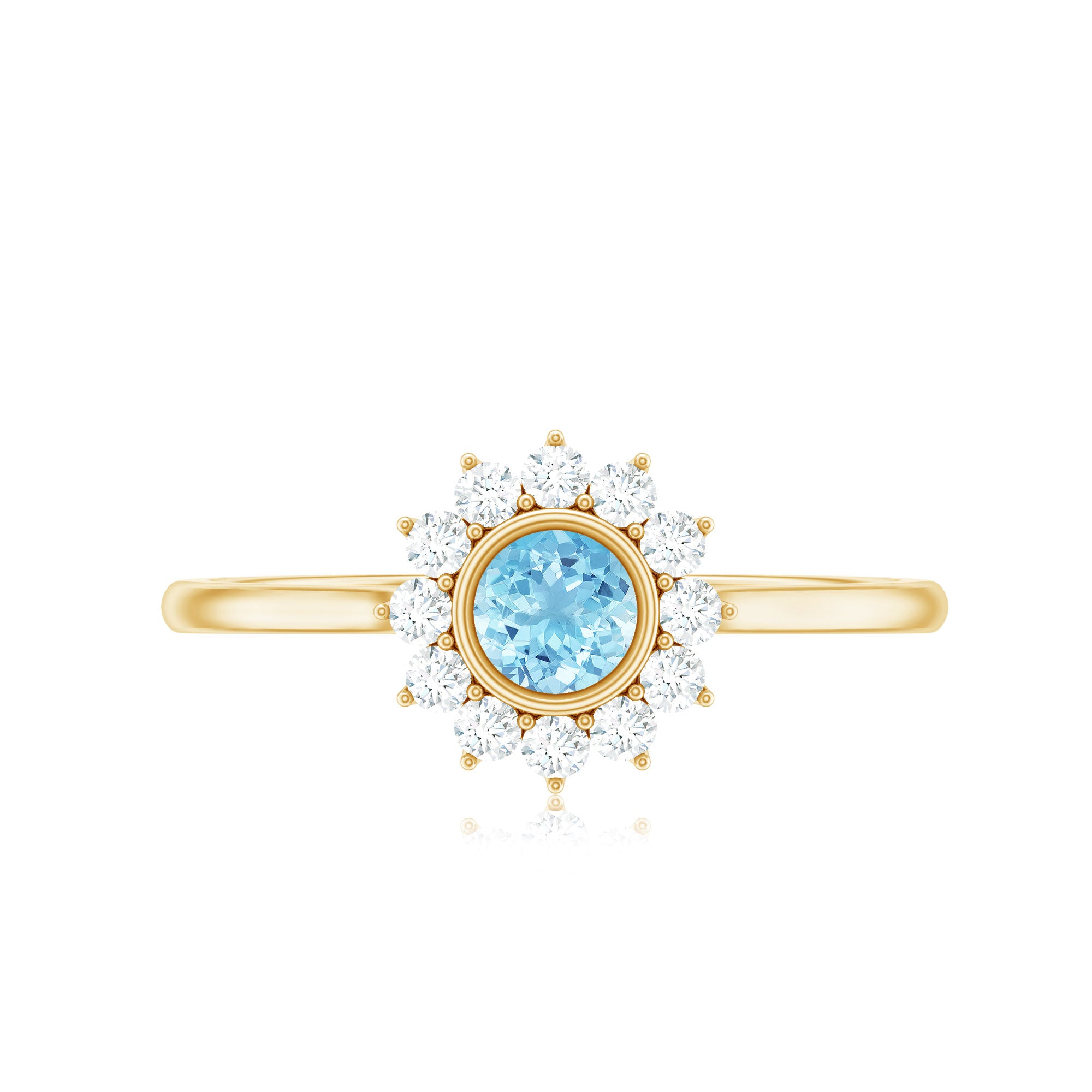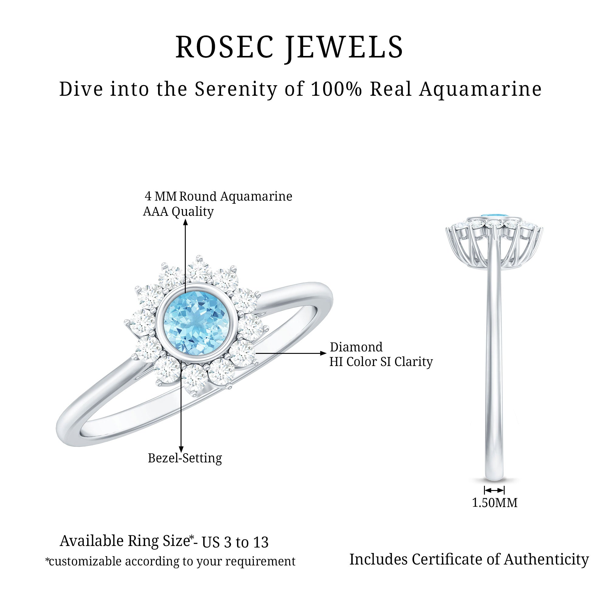 Make her go awe with this lovely Halo Promise Ring as a present. This Promise Ring is adorned with Round Shape Aquamarine in the center in a bezel setting with a Round Diamond as halo.
