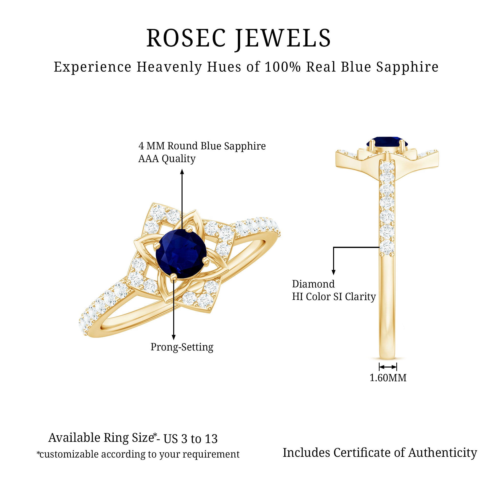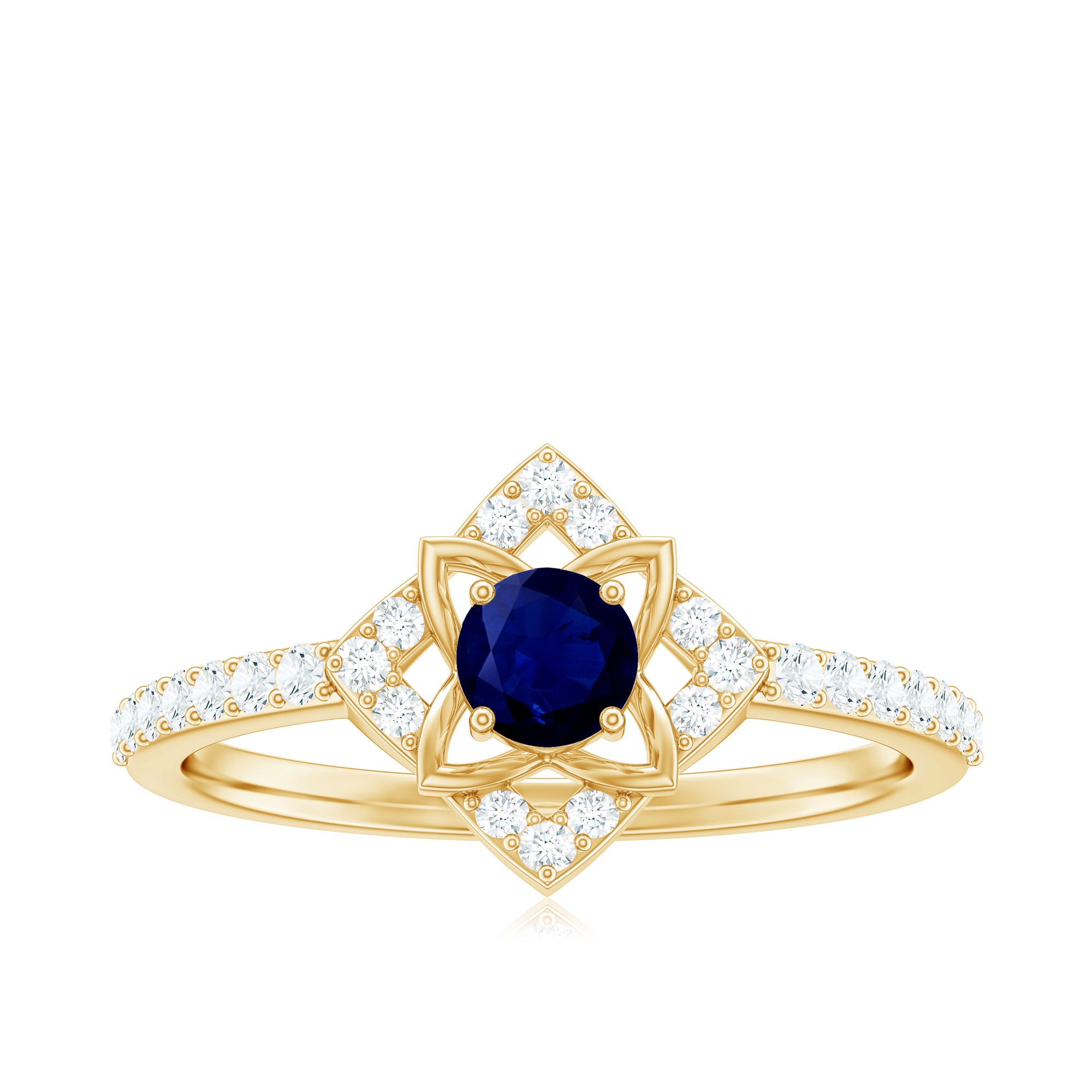 Look ethereal and classic with Blue Sapphire Floral Ring. Attractively Designed in a Floral Pattern and adorned with Round Shape Blue Sapphire and Diamond Accents, this Ring is perfect for special evenings.