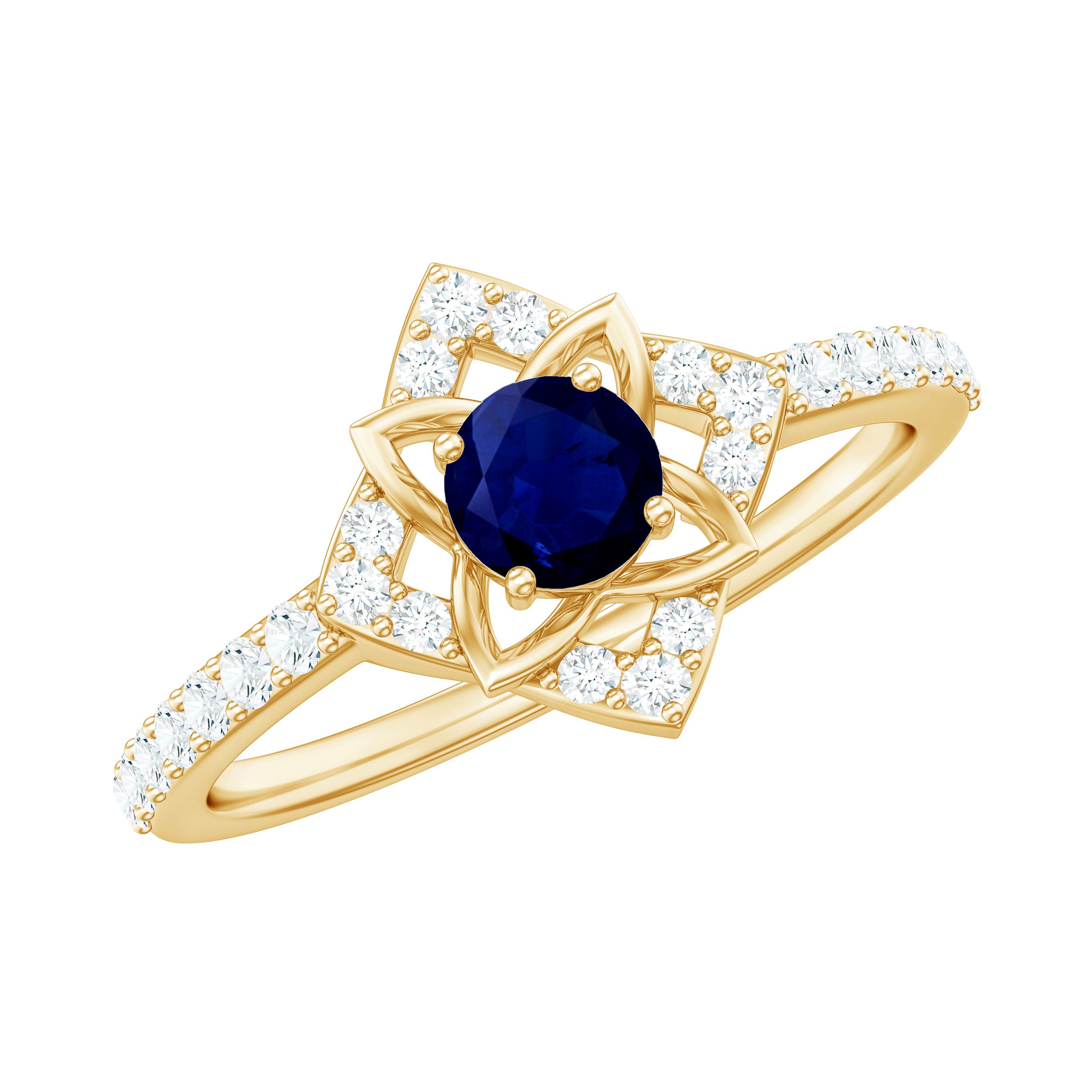 Look ethereal and classic with Blue Sapphire Floral Ring. Attractively Designed in a Floral Pattern and adorned with Round Shape Blue Sapphire and Diamond Accents, this Ring is perfect for special evenings.