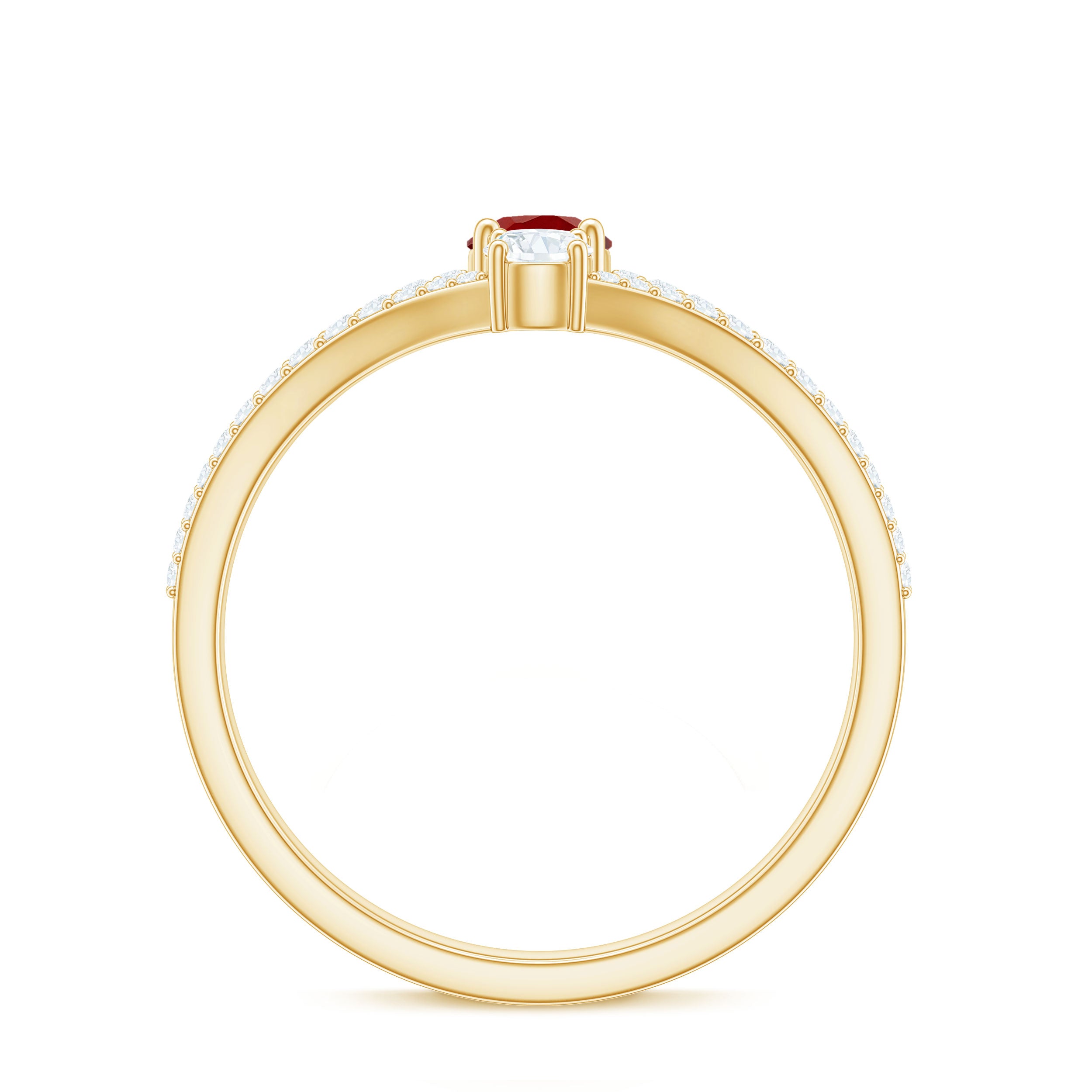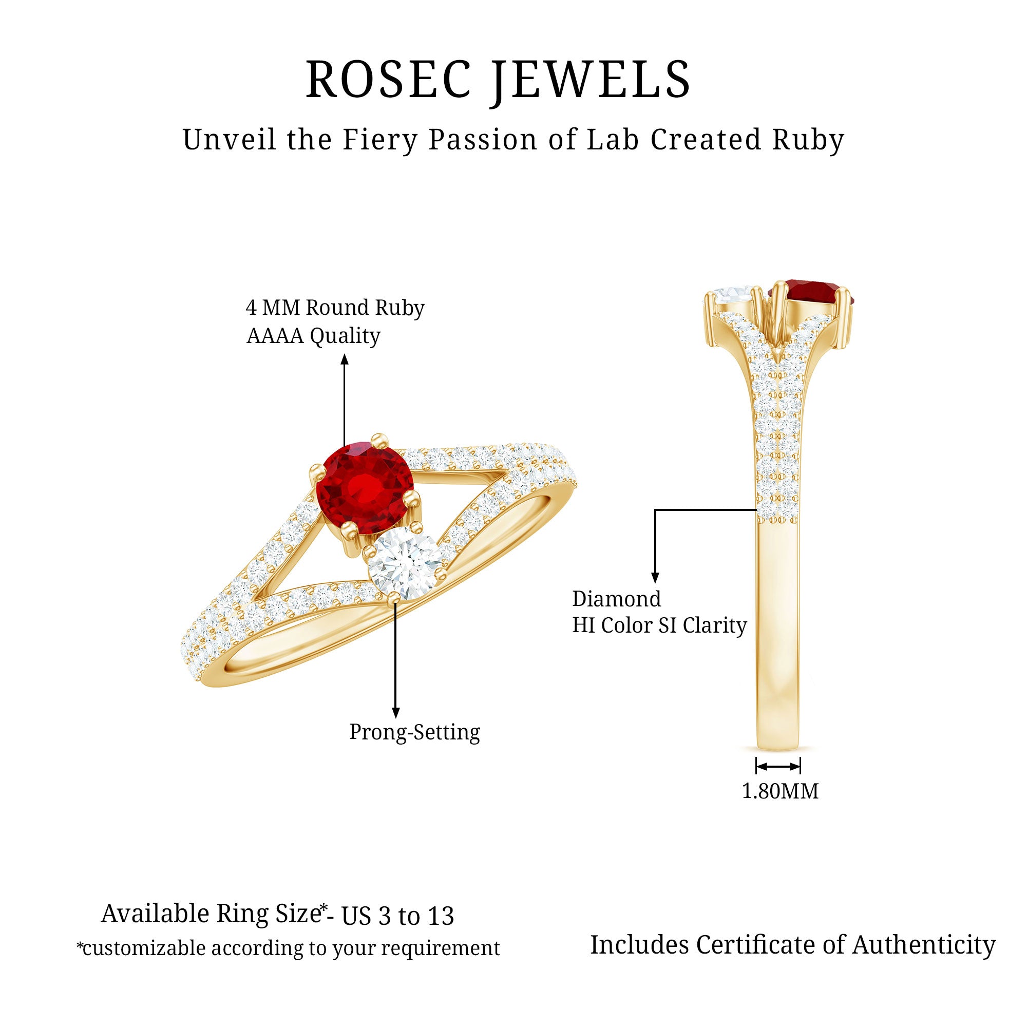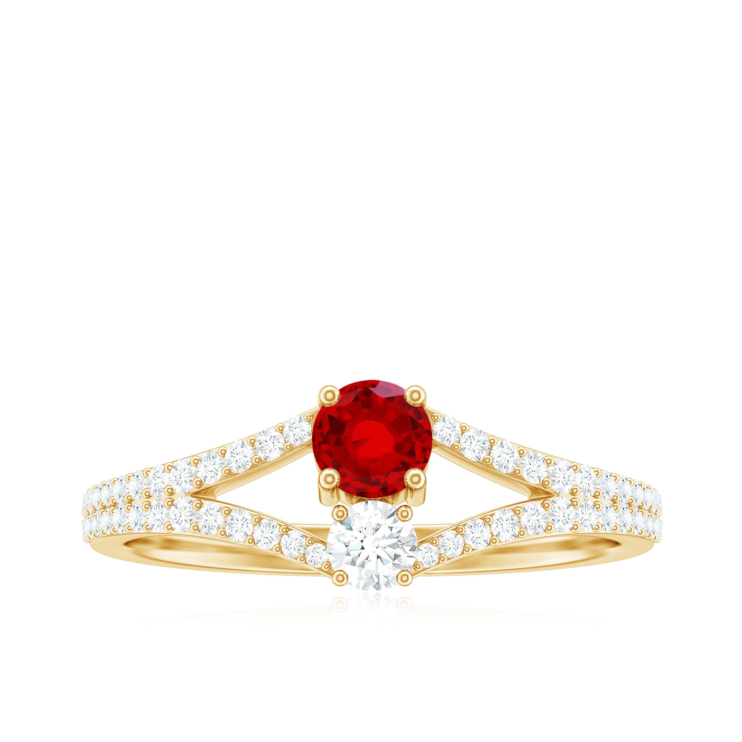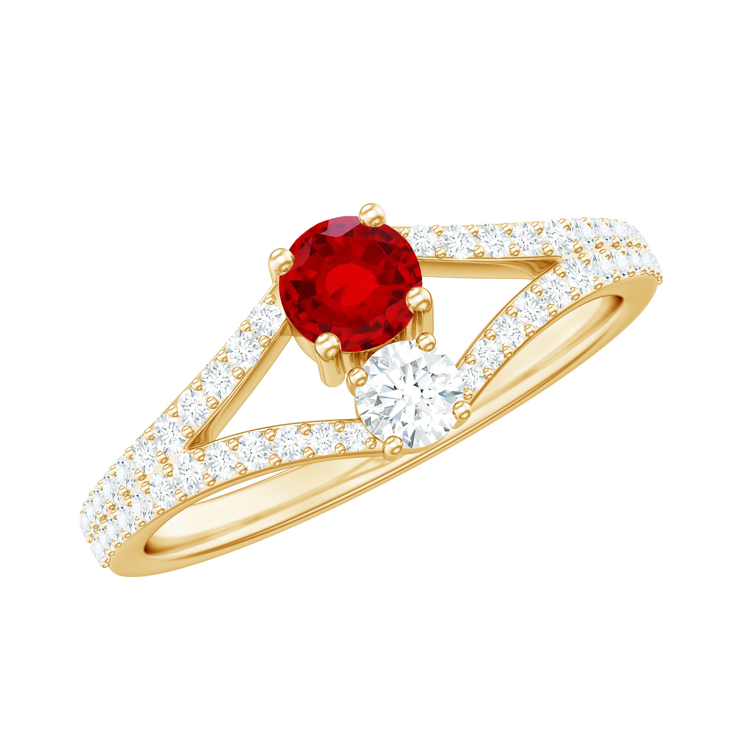 Your look wont be complete without this Split Shank Engagement Ring embellished with sparkling Round Shape Lab Created Ruby and Diamond set in 4 Prong Setting. This Two Stone Ring is crafted in Gold Metal for an opulent look. So, dont wait to get this Unique Ring for your special person as she can wear it with any attire for years and years to come.