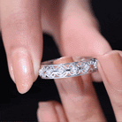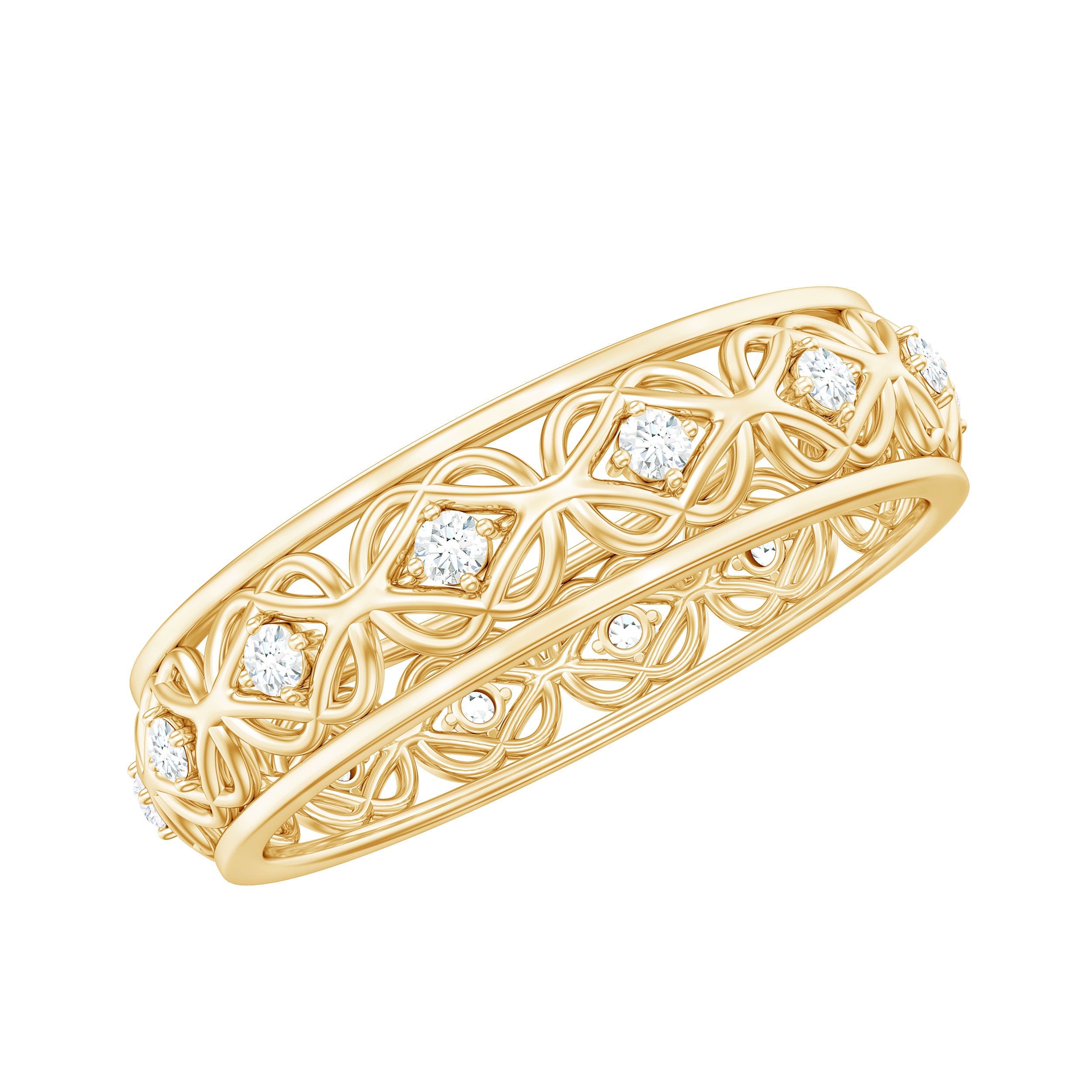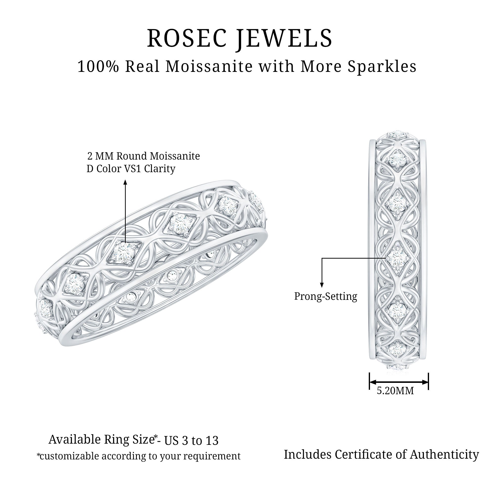 When love meets legend, the result is a masterpiece like this Celtic Wedding Band, a ring that carries centuries of meaning in every detail. This Vintage Style Wedding Band features brilliant round moissanite stones gracefully nestled within an intricate pattern of Celtic knots, symbolizing unbreakable connection and the intertwining of two souls. Every loop and curve of the design reflects a time-honored tradition, while the radiant moissanites bring a touch of contemporary brilliance. Each stone is precisely set in 4-prong setting to catch the light from every angle, ensuring a luminous sparkle that rivals even the finest diamonds. The openwork craftsmanship gives the Moissanite Anniversary Band an airy elegance, while the continuous pattern tells a story that never ends. Rich in symbolism and style, this ring is perfect for marking a wedding, renewing vows, or simply honoring a bond that grows stronger with time. It is a visual expression of shared values, spiritual connection, and everlasting love. Whether worn on its own or stacked with other favorites, this Vintage Moissanite Wedding Band offers a timeless beauty that feels both antique and refreshingly unique. For those who cherish meaning as much as style, this ring stands as a radiant reminder that true love, much like a Celtic knot, has no beginning and no end.