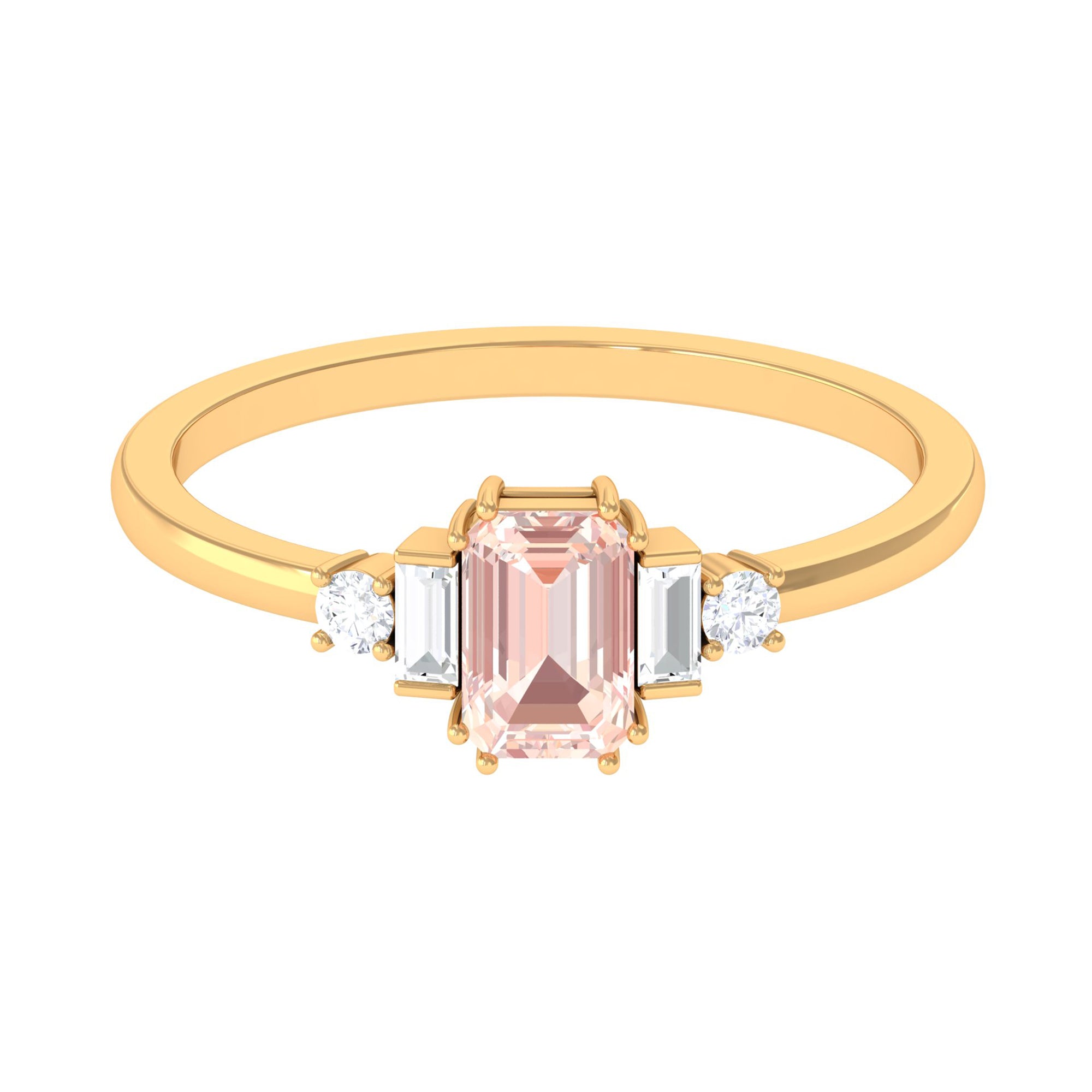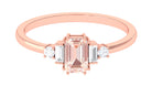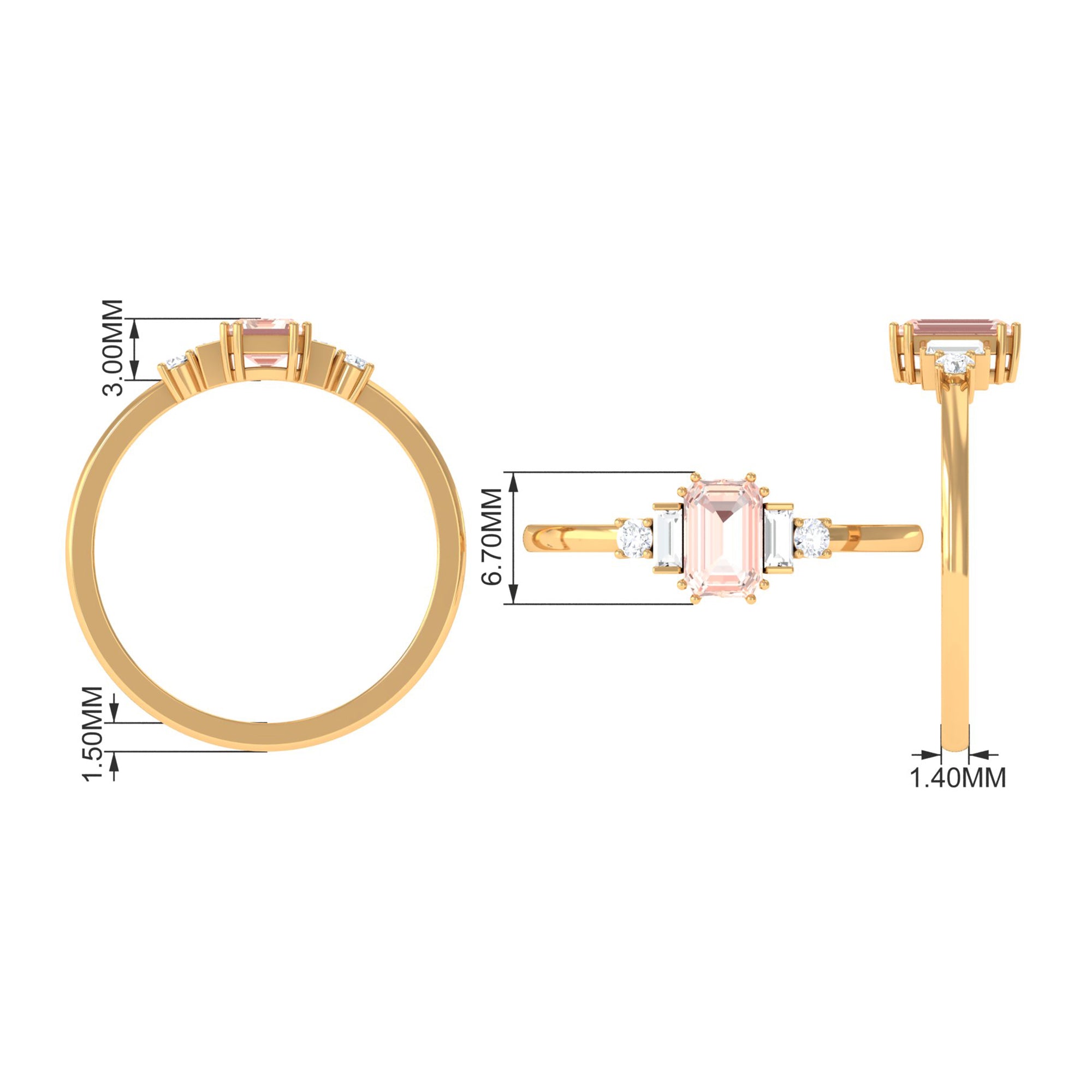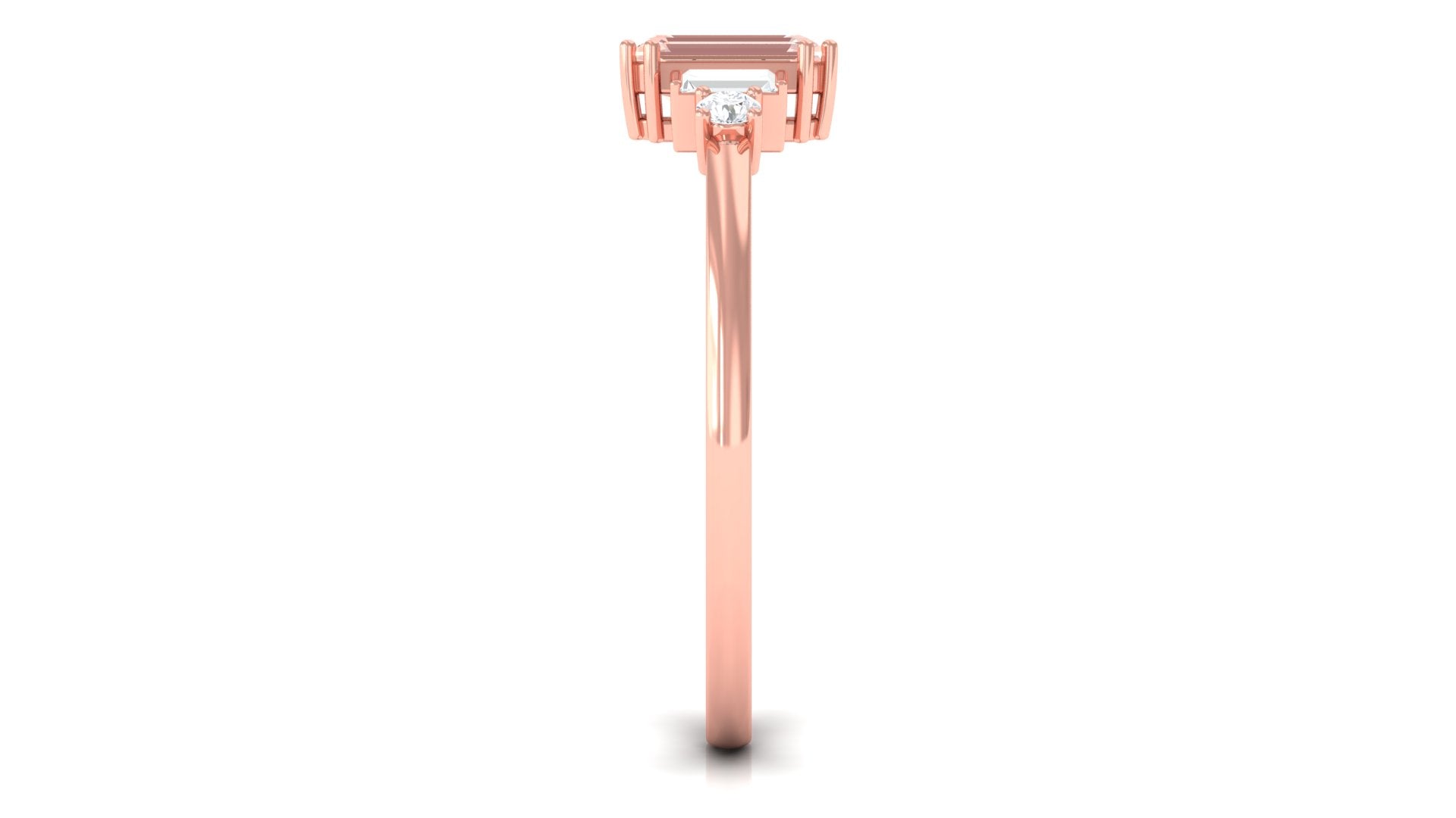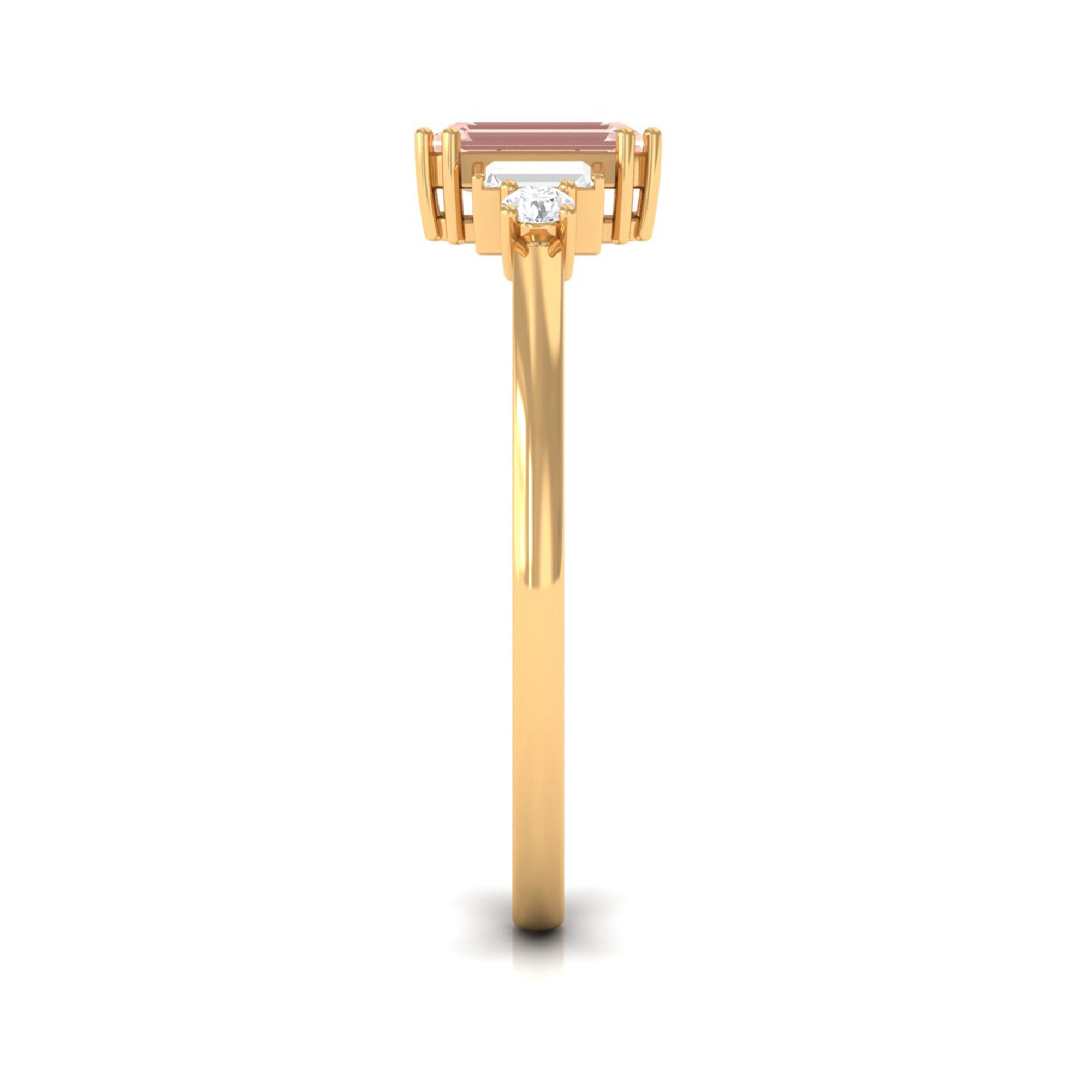 You will be able to add a captivating appeal to your look by adding a Morganite Solitaire Engagement Ring. An Emerald Cut Morganite decorates the center of this Solitaire Engagement Ring. The side of the ring is studded with a Baguette and Round Diamond. A luxurious option for a special occasion, this October Birthstone Ring is made with gold metal.