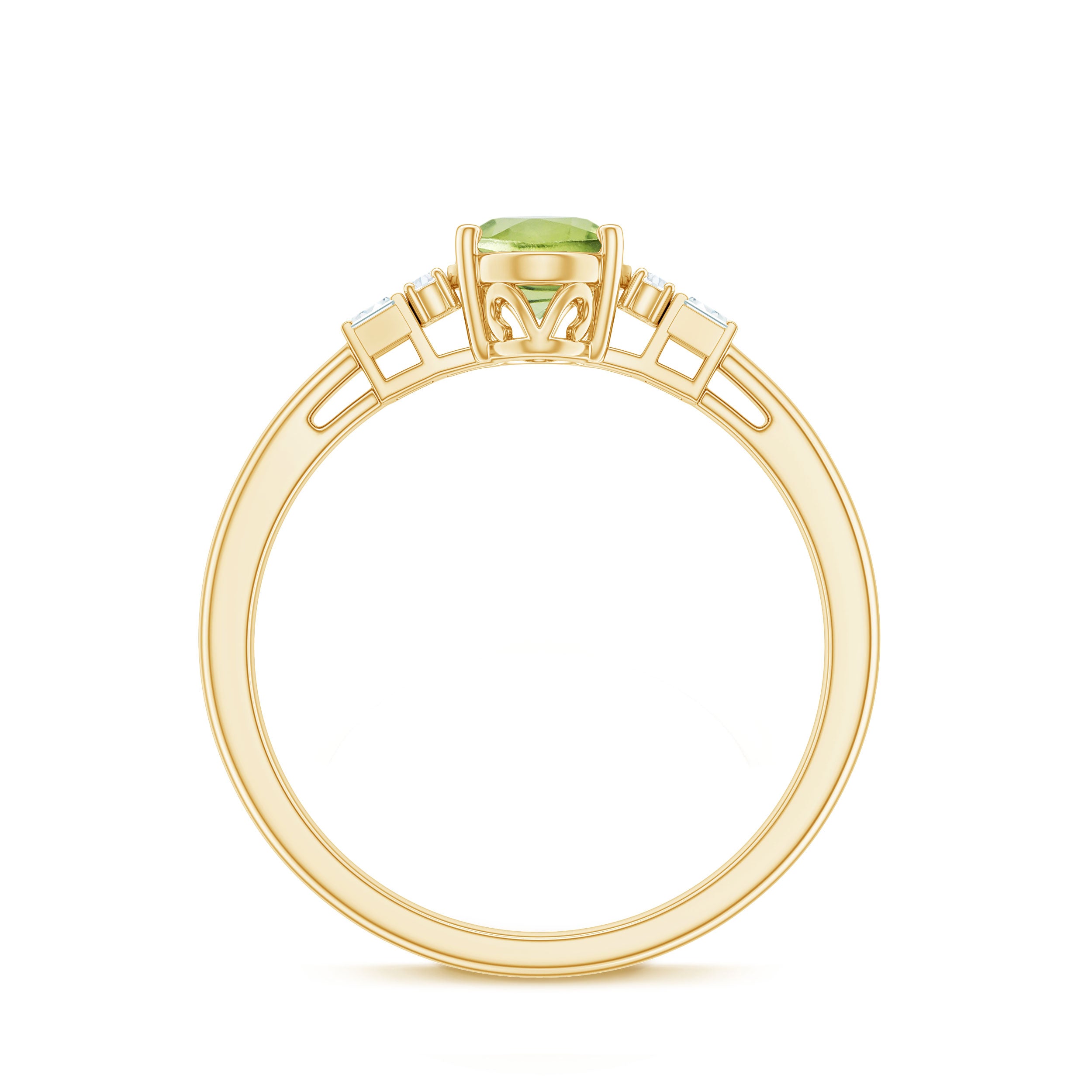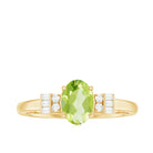 Graceful and divine, this Peridot Engagement Ring is a classic piece of fine jewelry, artistically crafted in Gold for a perfect and luxurious look. Oval Shape Peridot Ring has Baguette and Round Diamond embellishing the ring from sideways. Make your significant other extremely happy by presenting her with this Peridot Diamond Ring.