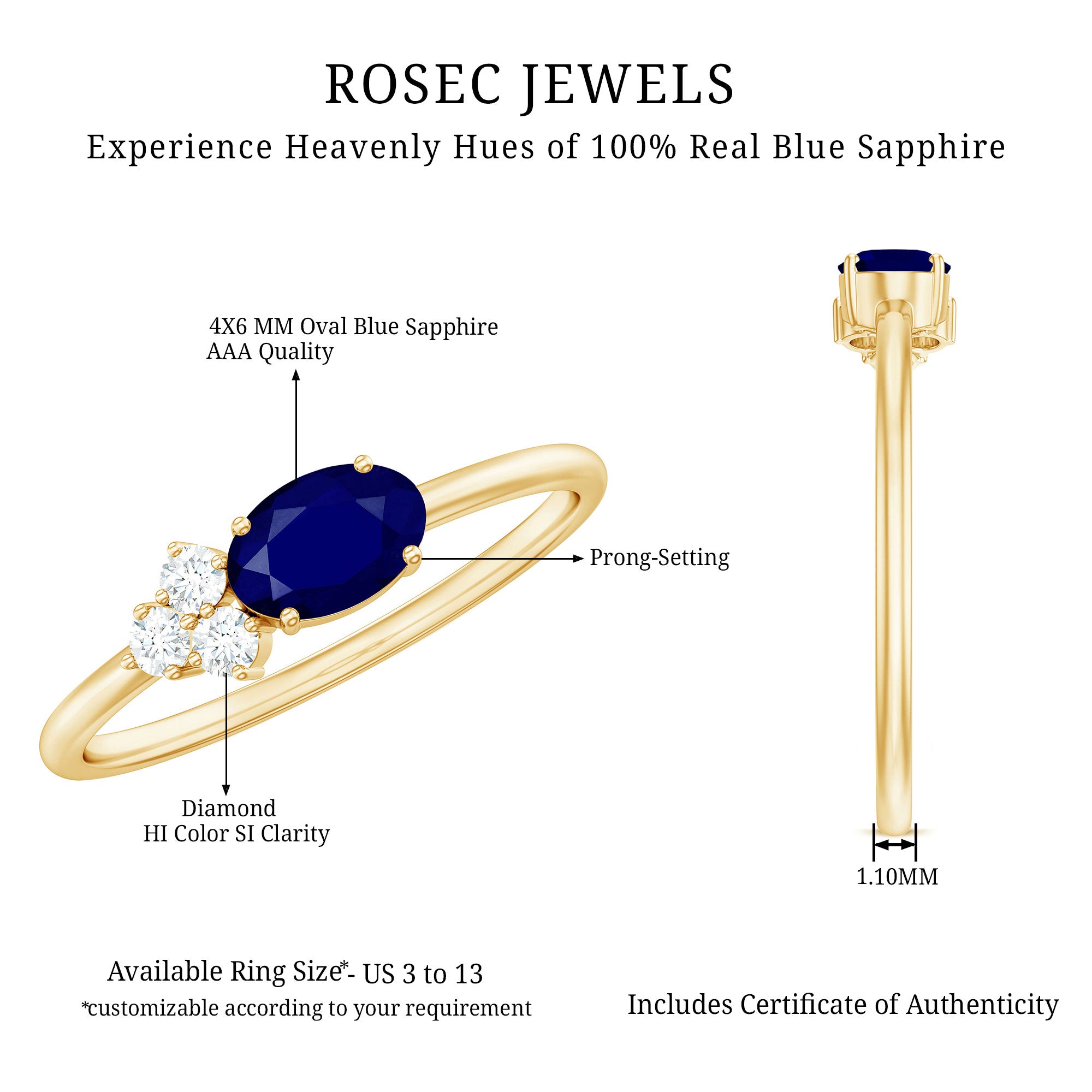 Make feel her special on Valentine Day by giving her this Promise Ring. This beautiful Promise Ring adorned with Oval Cut Blue Sapphire as Solitaire in Prong Setting and Round Shape Diamond Trio, crafted in Solid Gold.