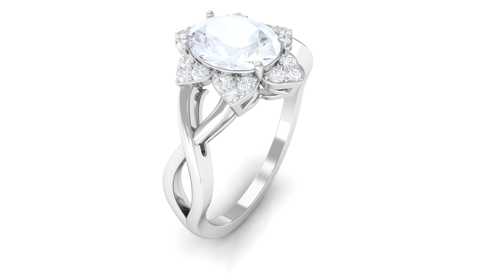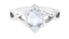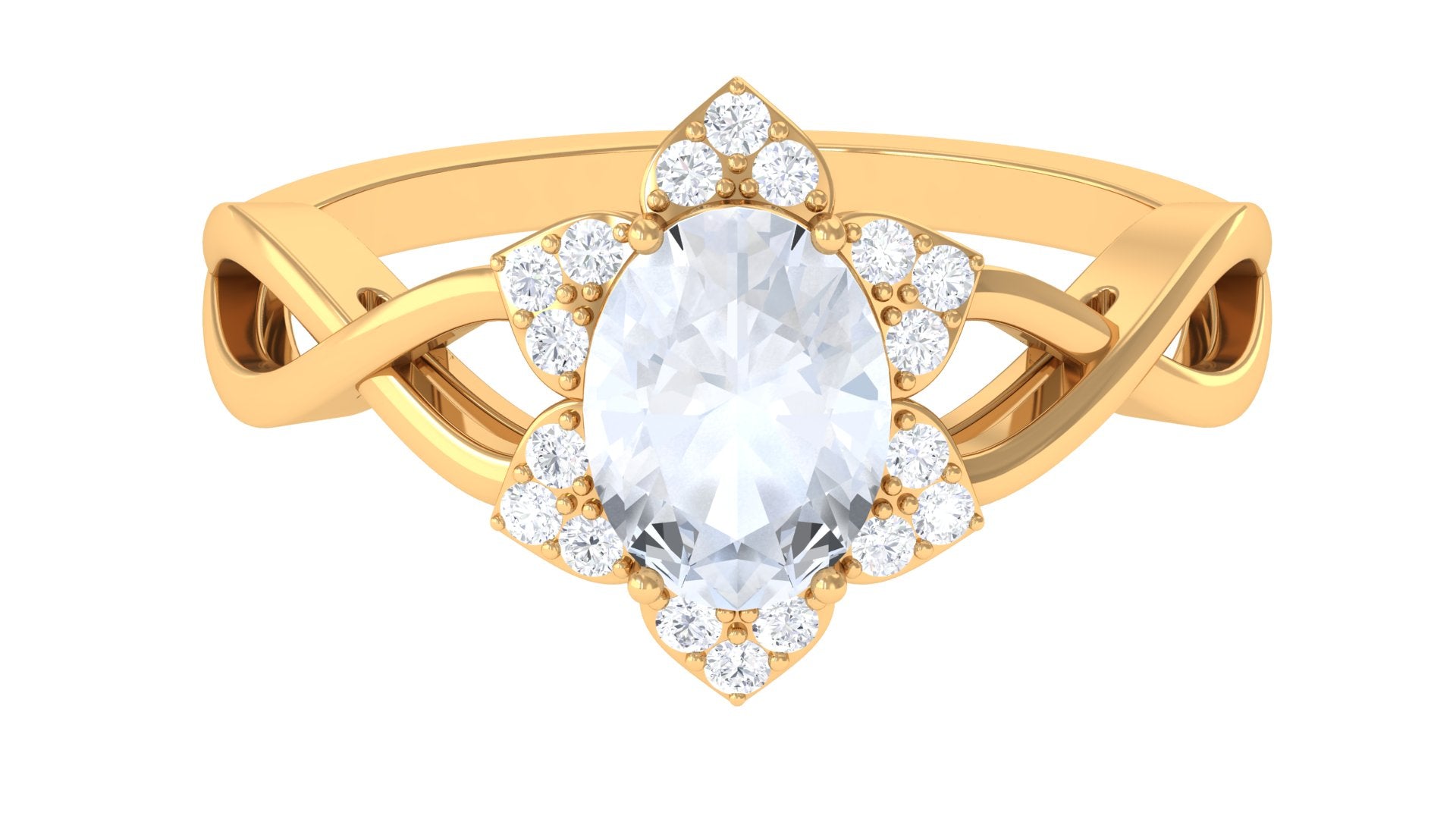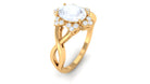 Make feel her special by giving her this Flower Halo Ring adorned with Oval Cut Moonstone as Solitaire set in Prong Setting with Diamond Accent and Crossover Shank, crafted in Gold Metal.